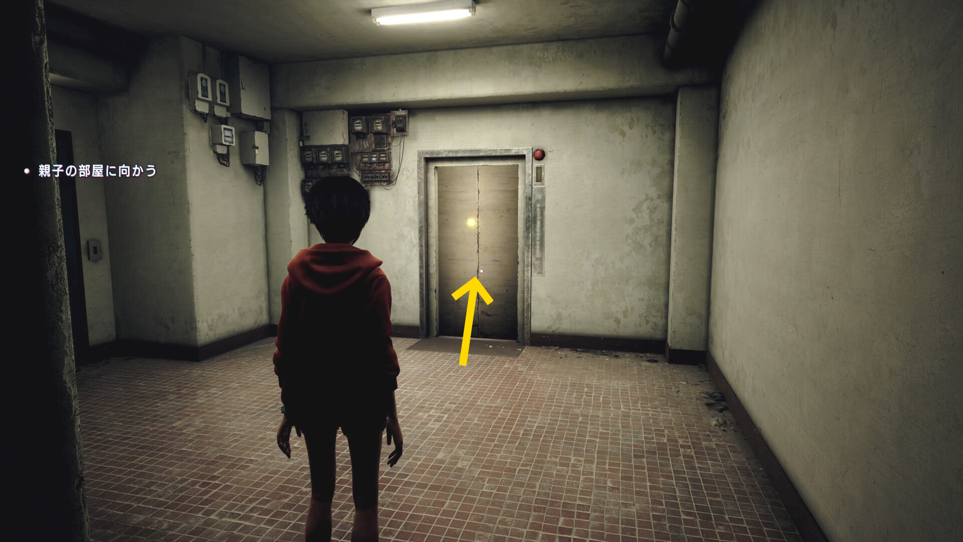 - 「五岳楼」のアパートに入り、奥のエレベーターに乗り込むとカットシーン