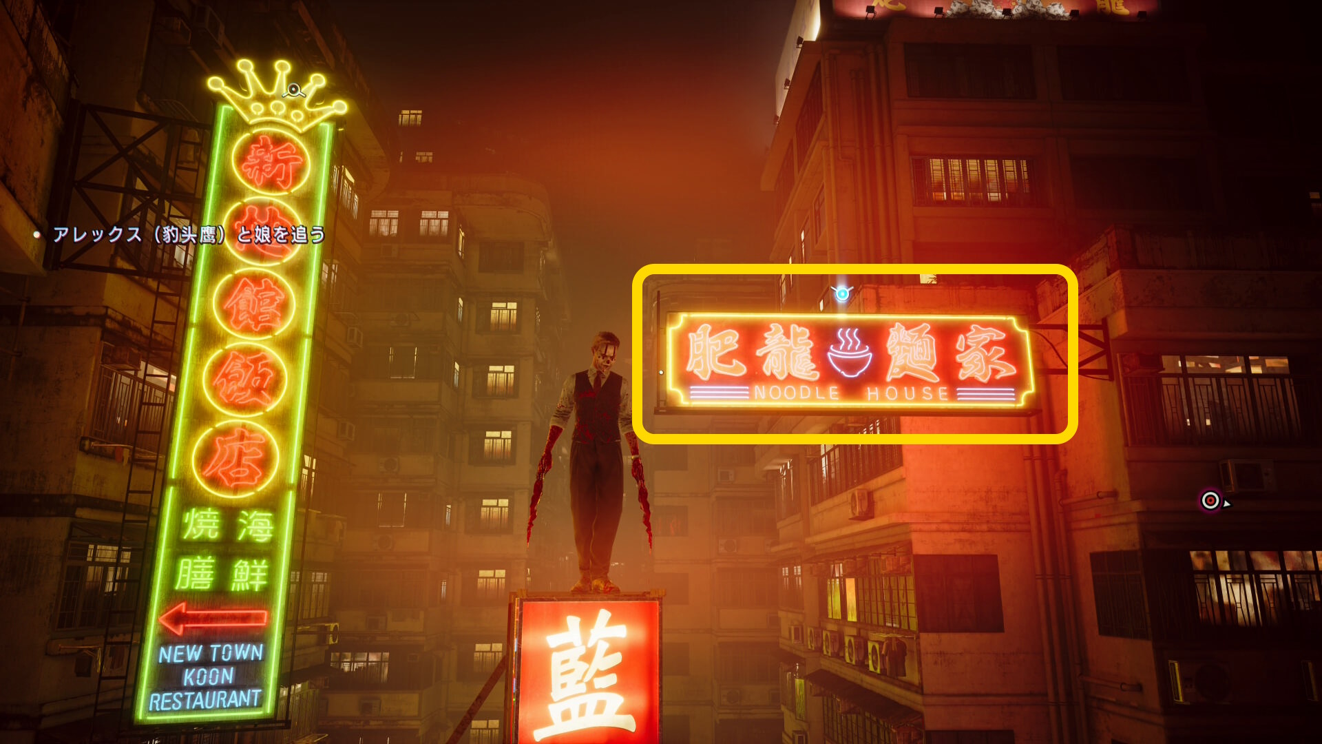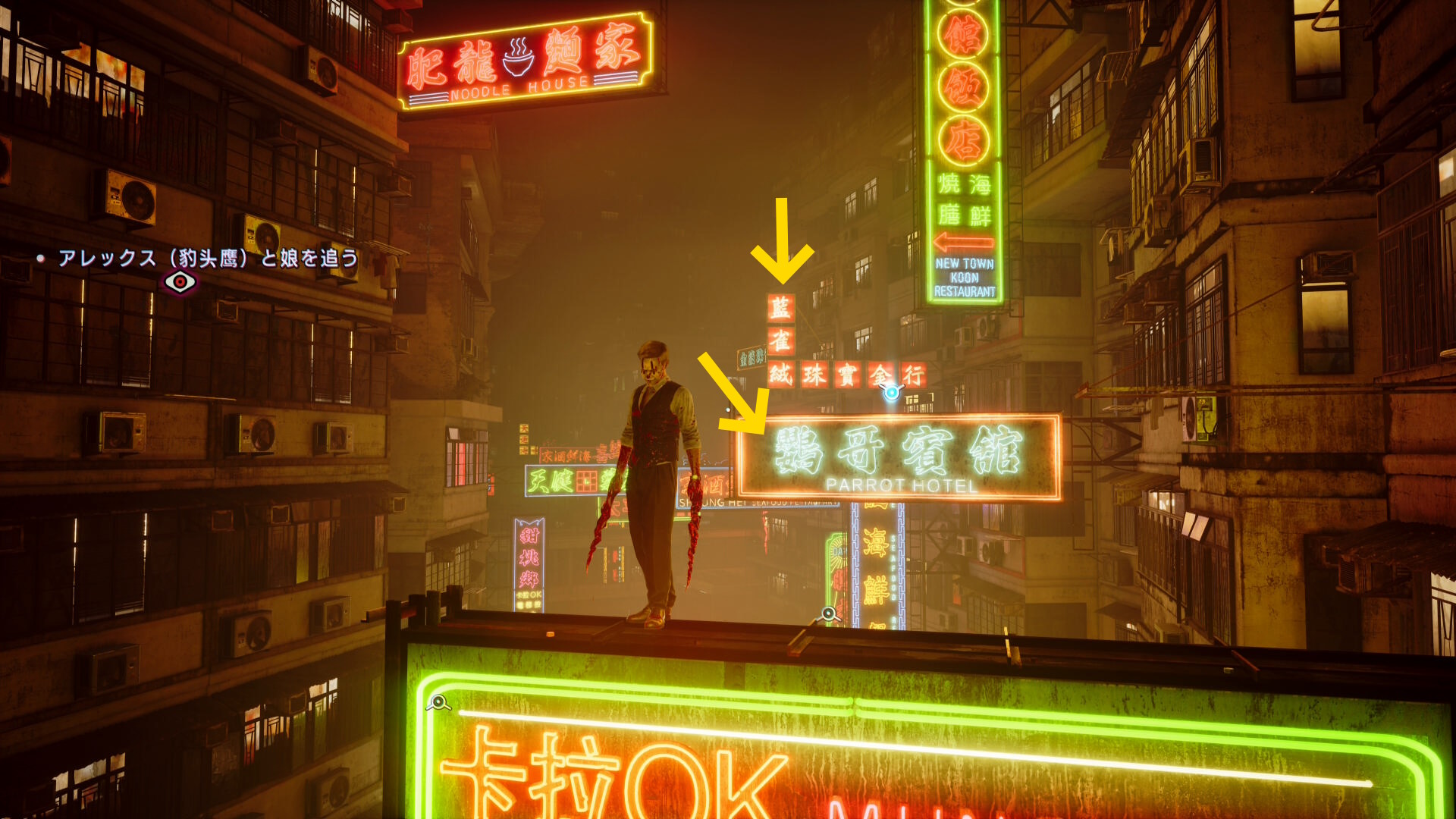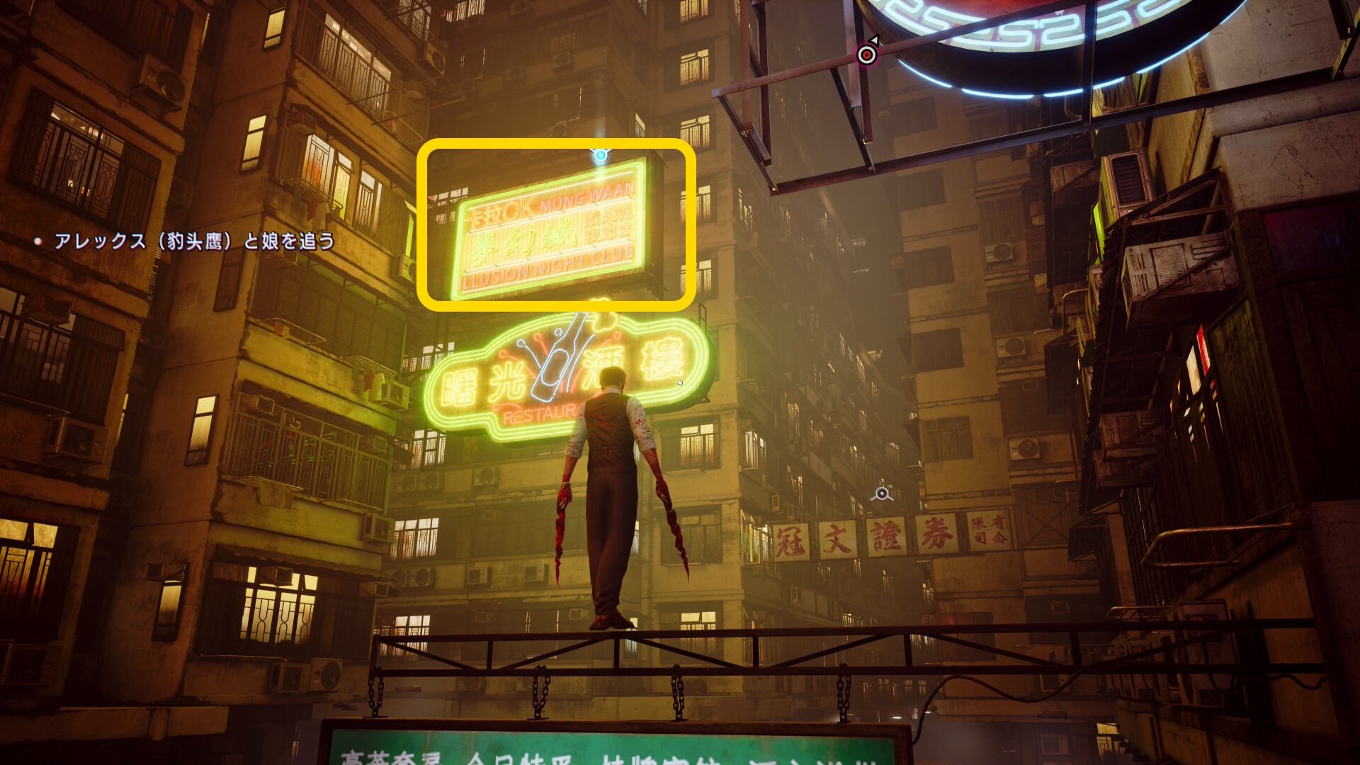 - 看板「鸚哥賓舘」にブラッドジャンプし、さらにその奥の L 字の看板「藍雀絨珠寶金行」の看板にブラッドジャンプ
