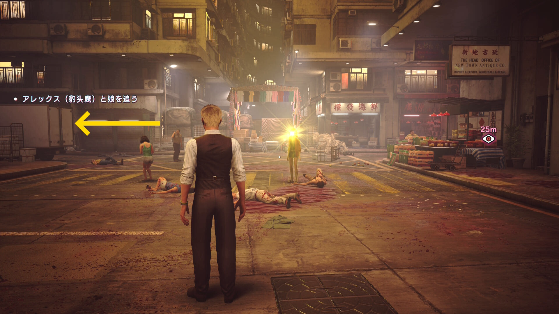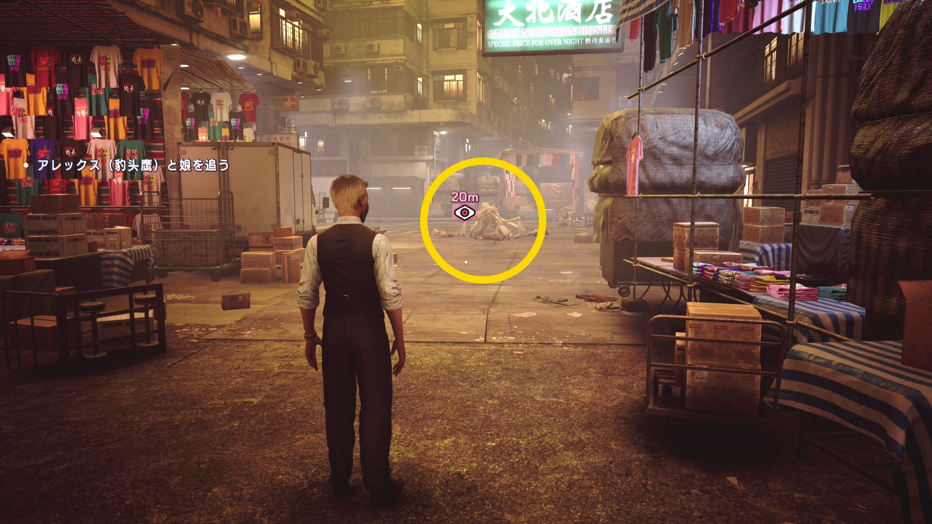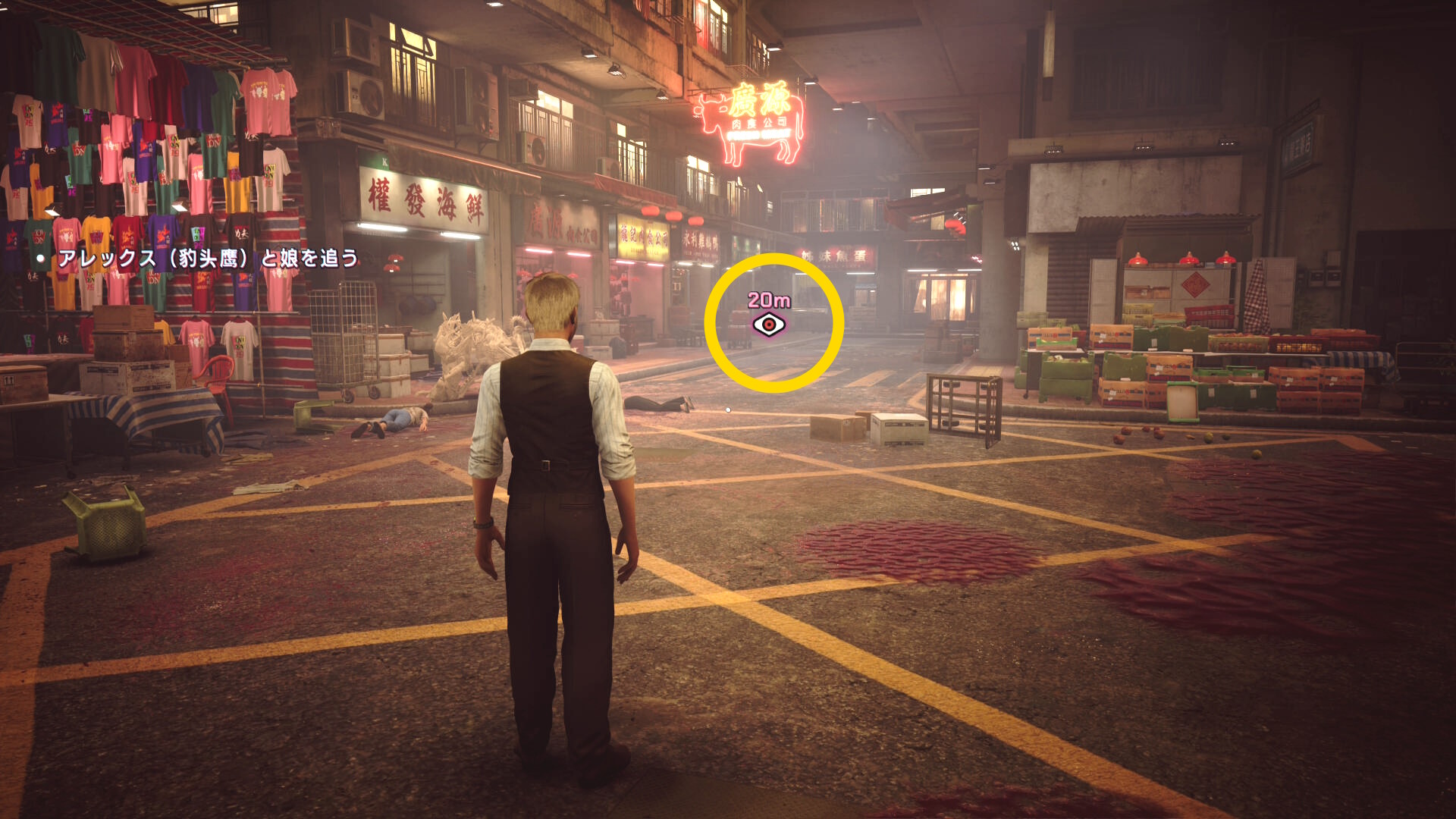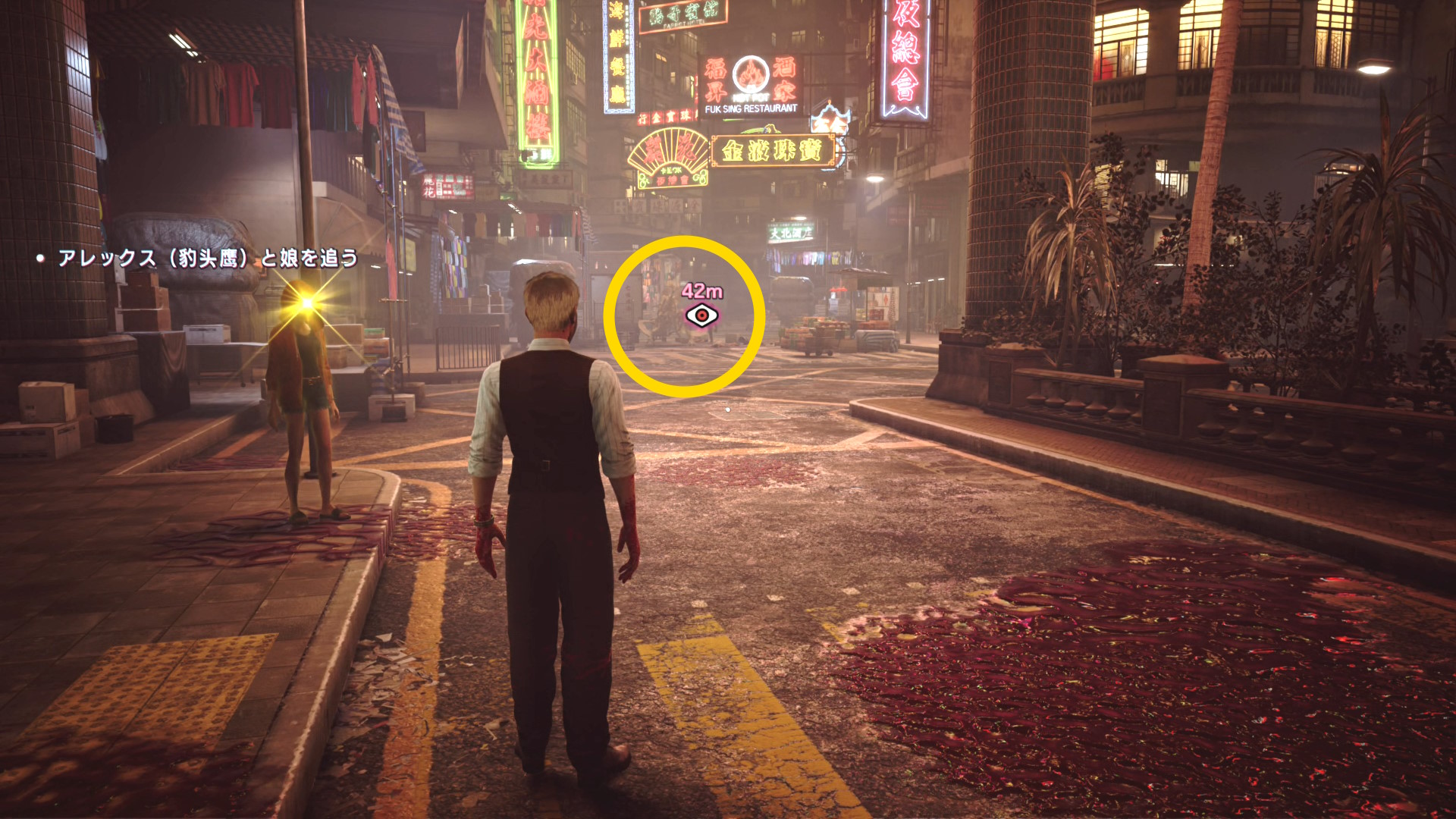 - 看板「鸚哥賓舘」にブラッドジャンプし、さらにその奥の L 字の看板「藍雀絨珠寶金行」の看板にブラッドジャンプ