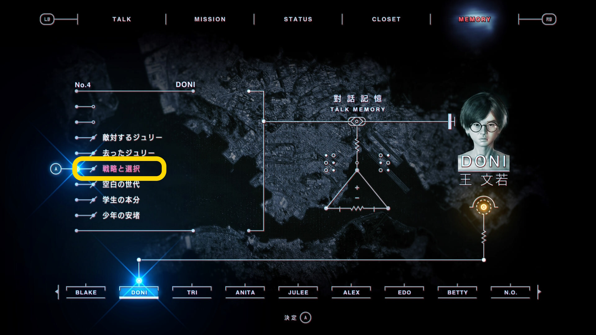 - 「MEMORY」タブに移動し、ドニの会話( No.4:戦略と選択)を再生