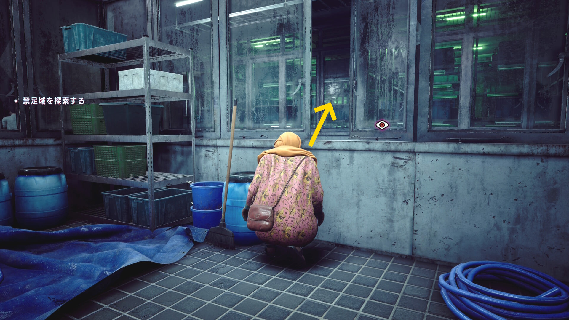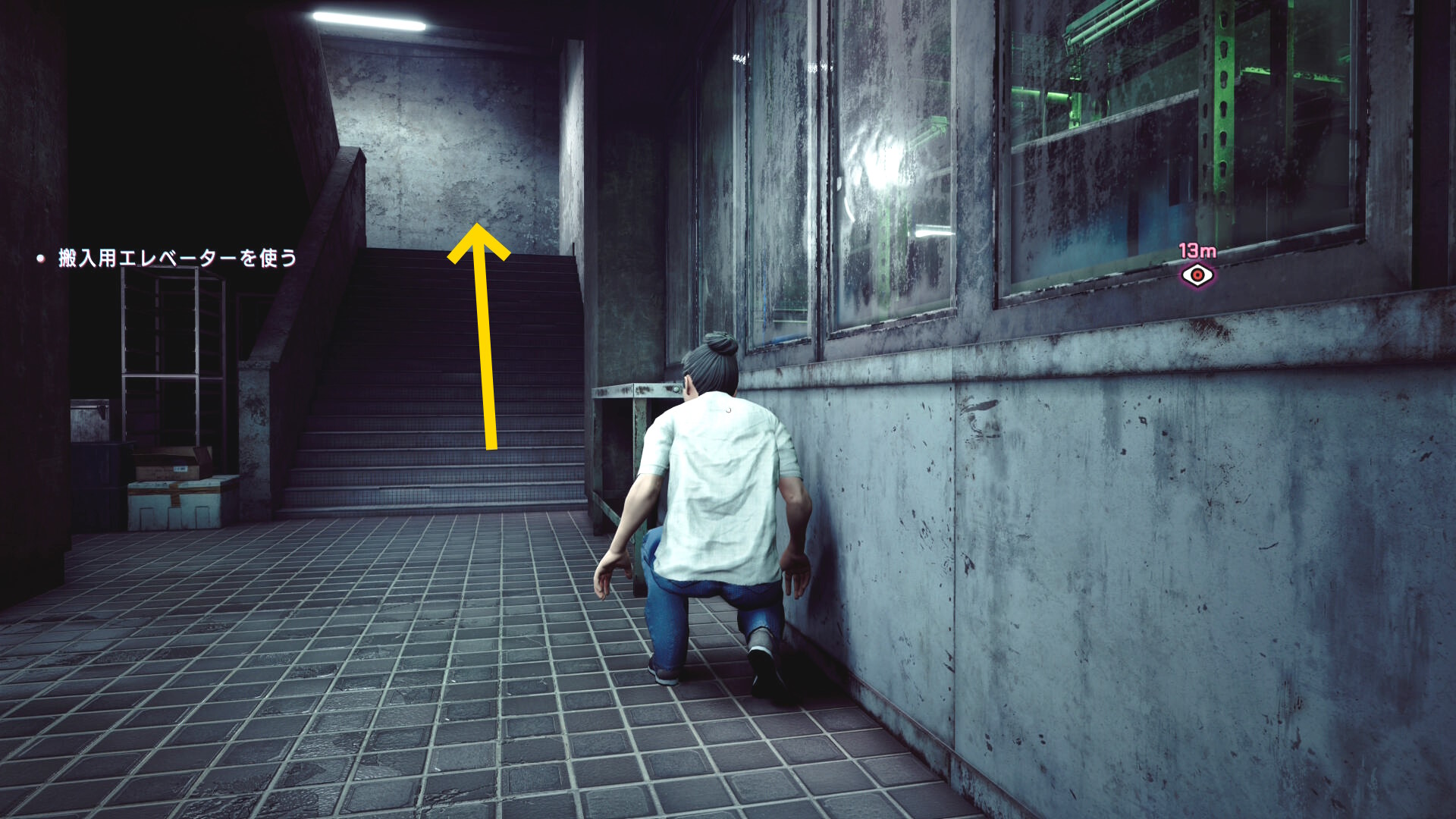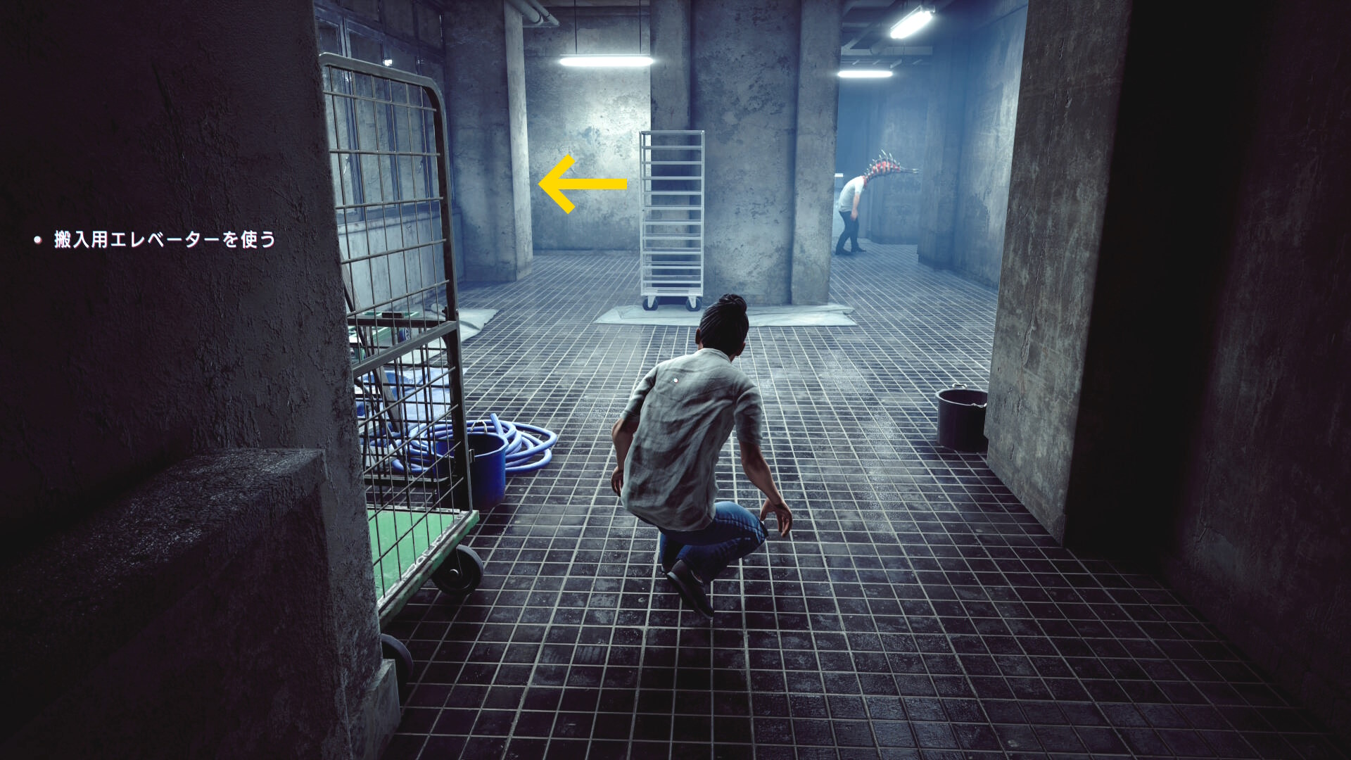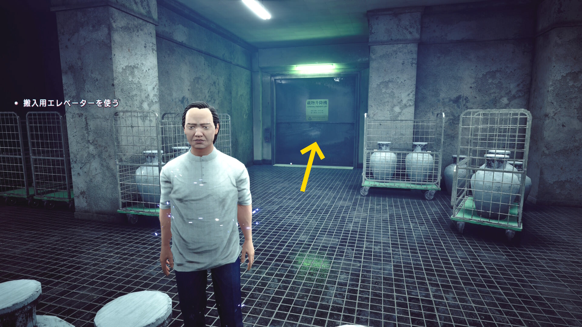 • 憑依したあたりまで戻り、右側の窓ガラス(下画像の矢印)に近づくと搬入用の昇降機を見つけるシーン