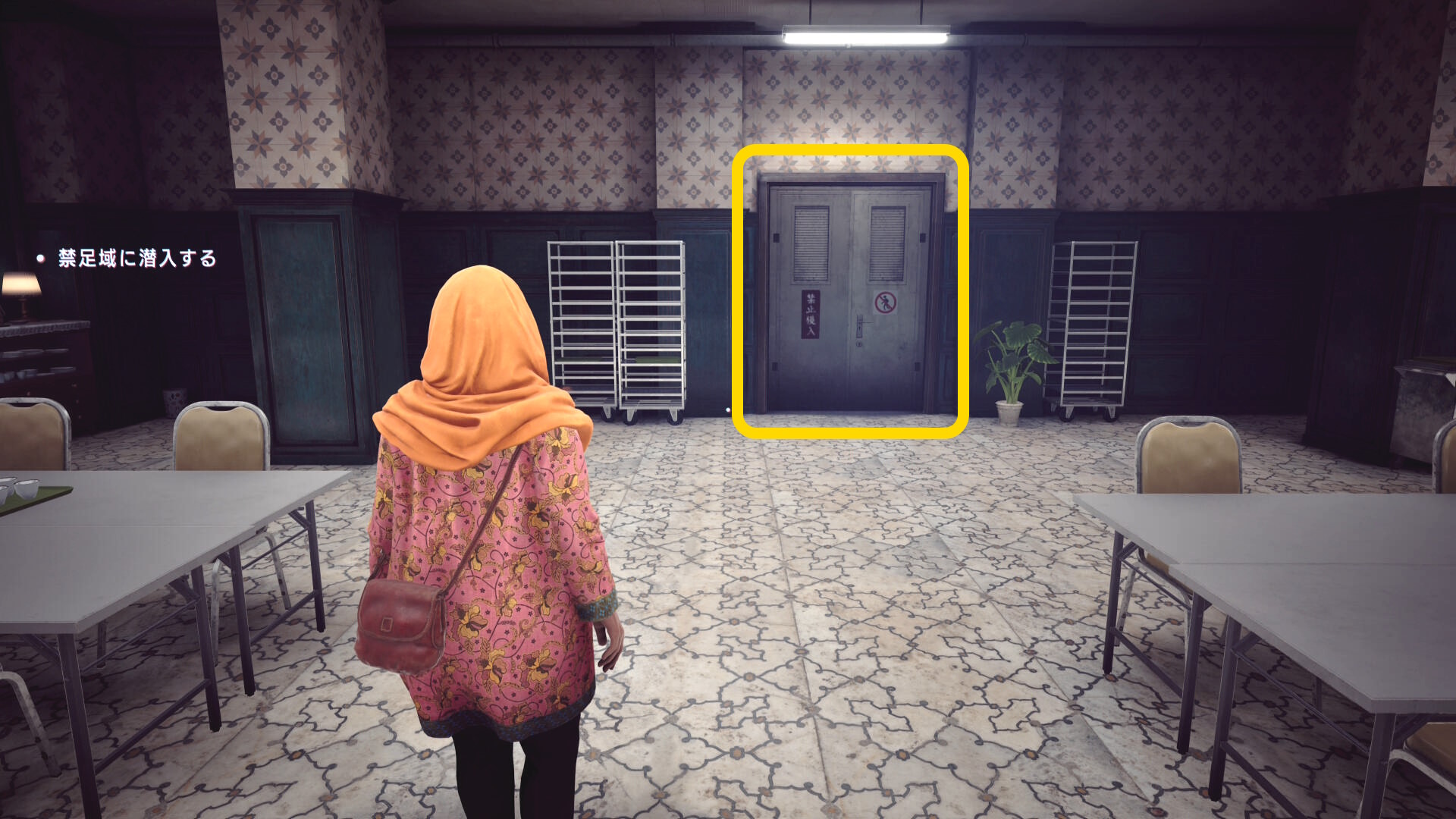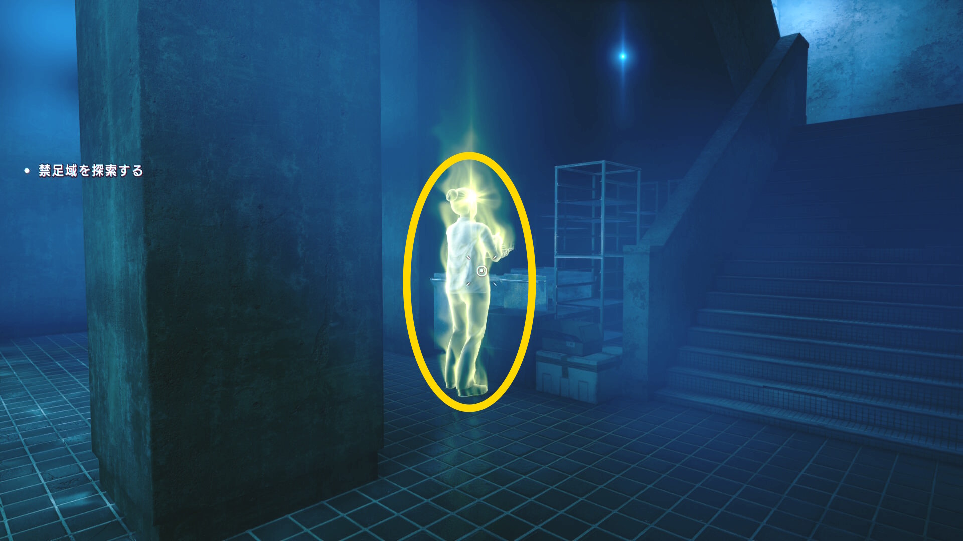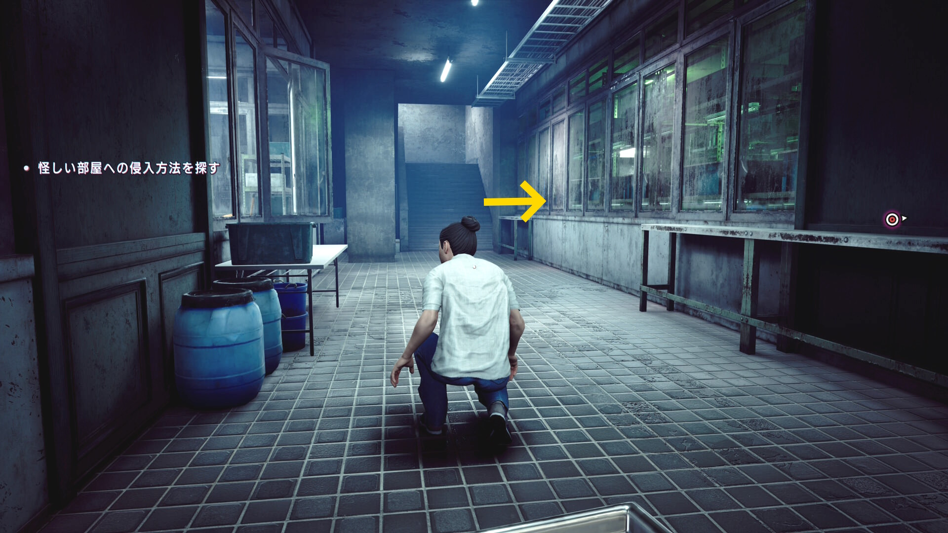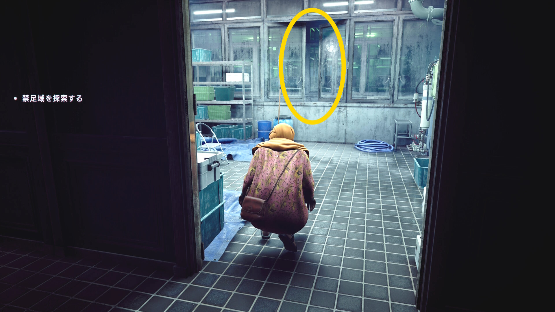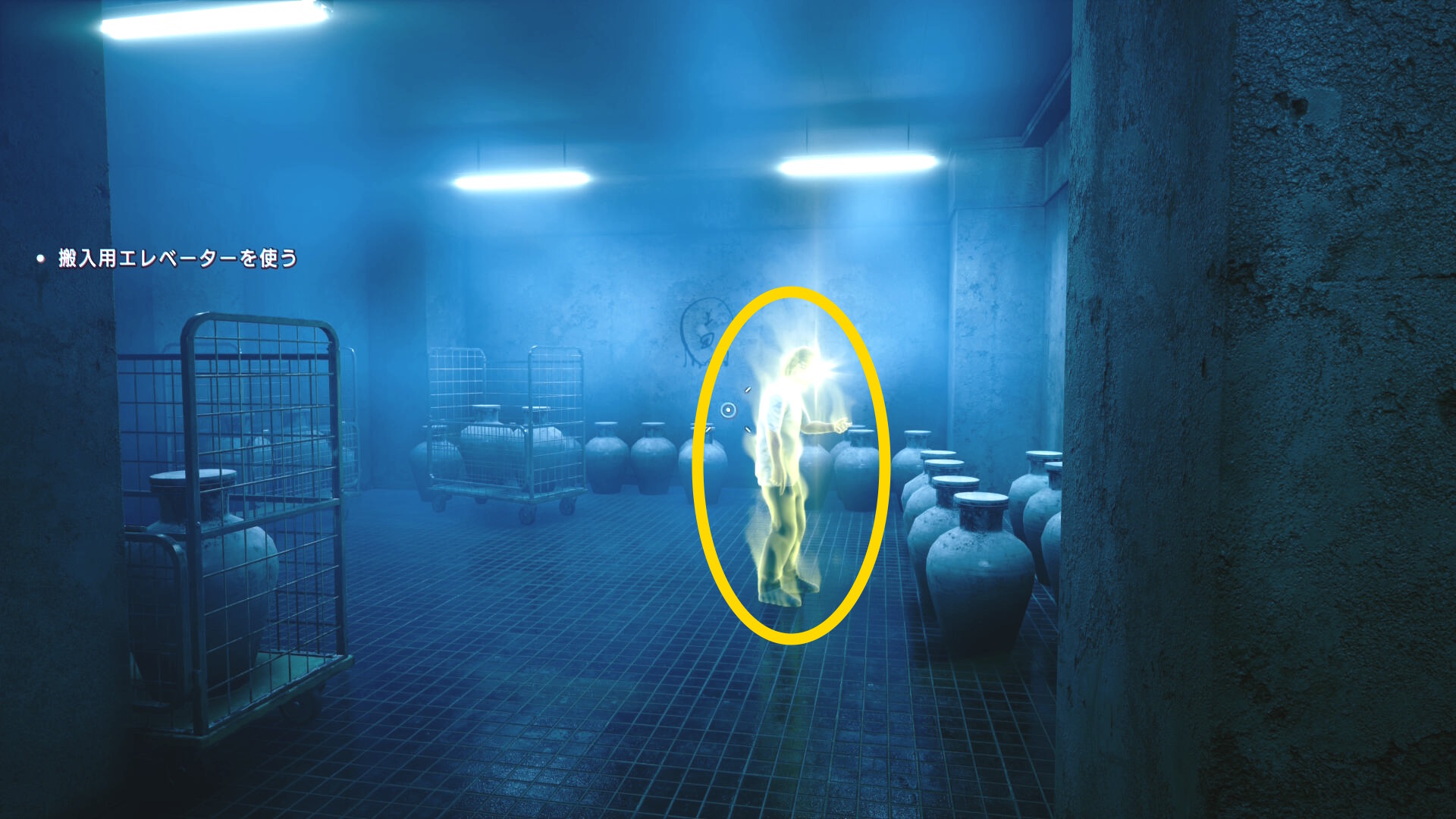 • 憑依したあたりまで戻り、右側の窓ガラス(下画像の矢印)に近づくと搬入用の昇降機を見つけるシーン