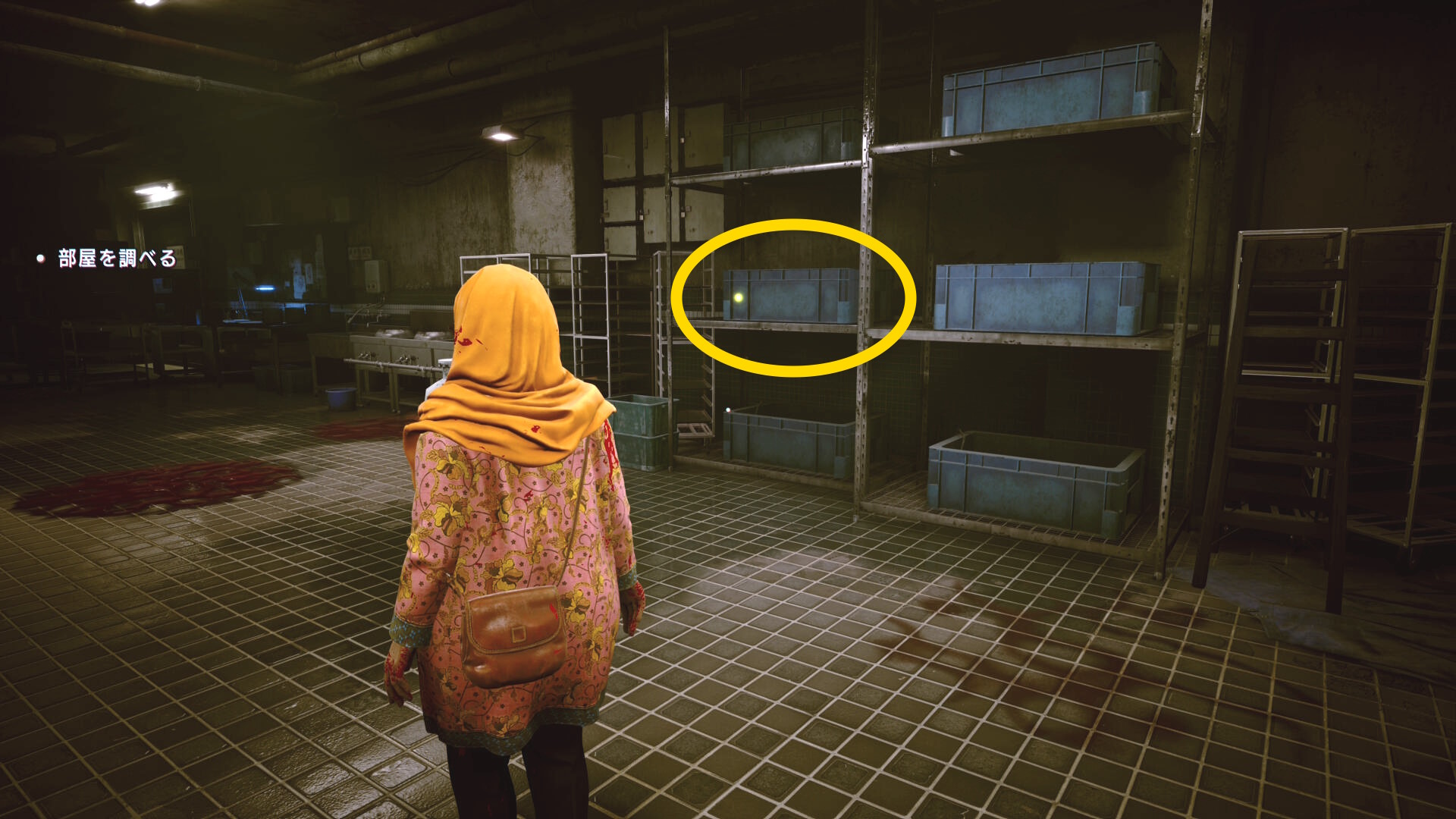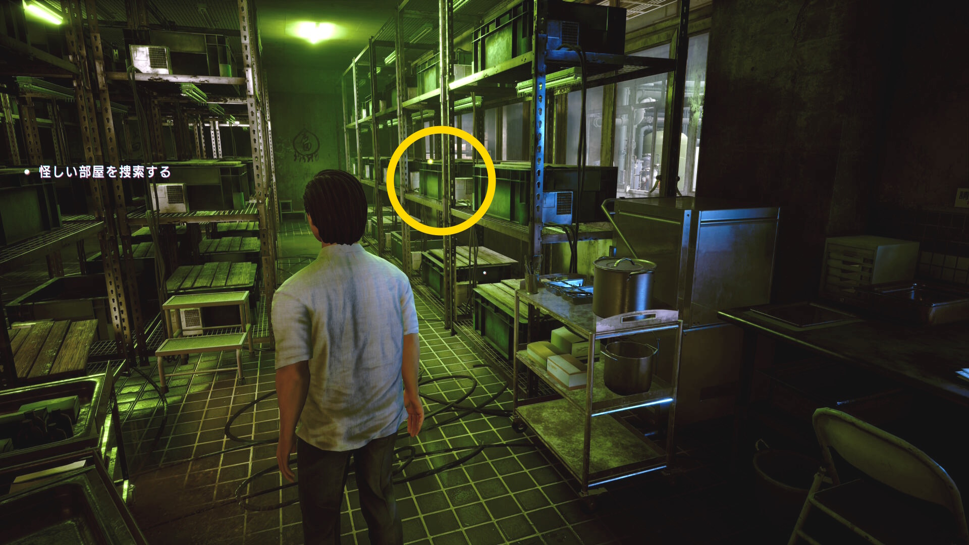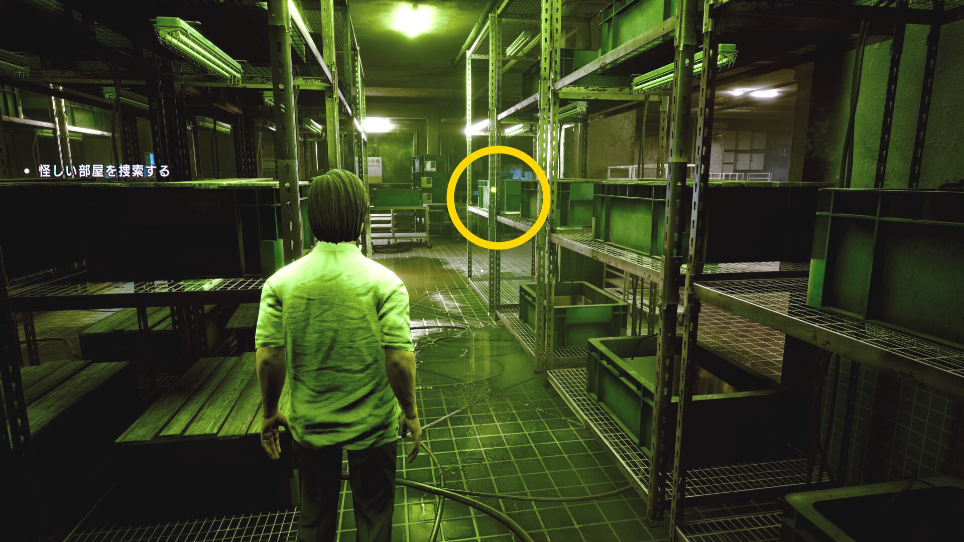 • 棚と棚の間の通路を進み、右側のコンテナを調べる