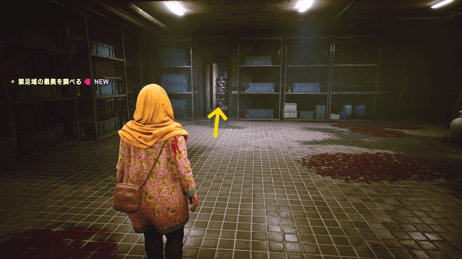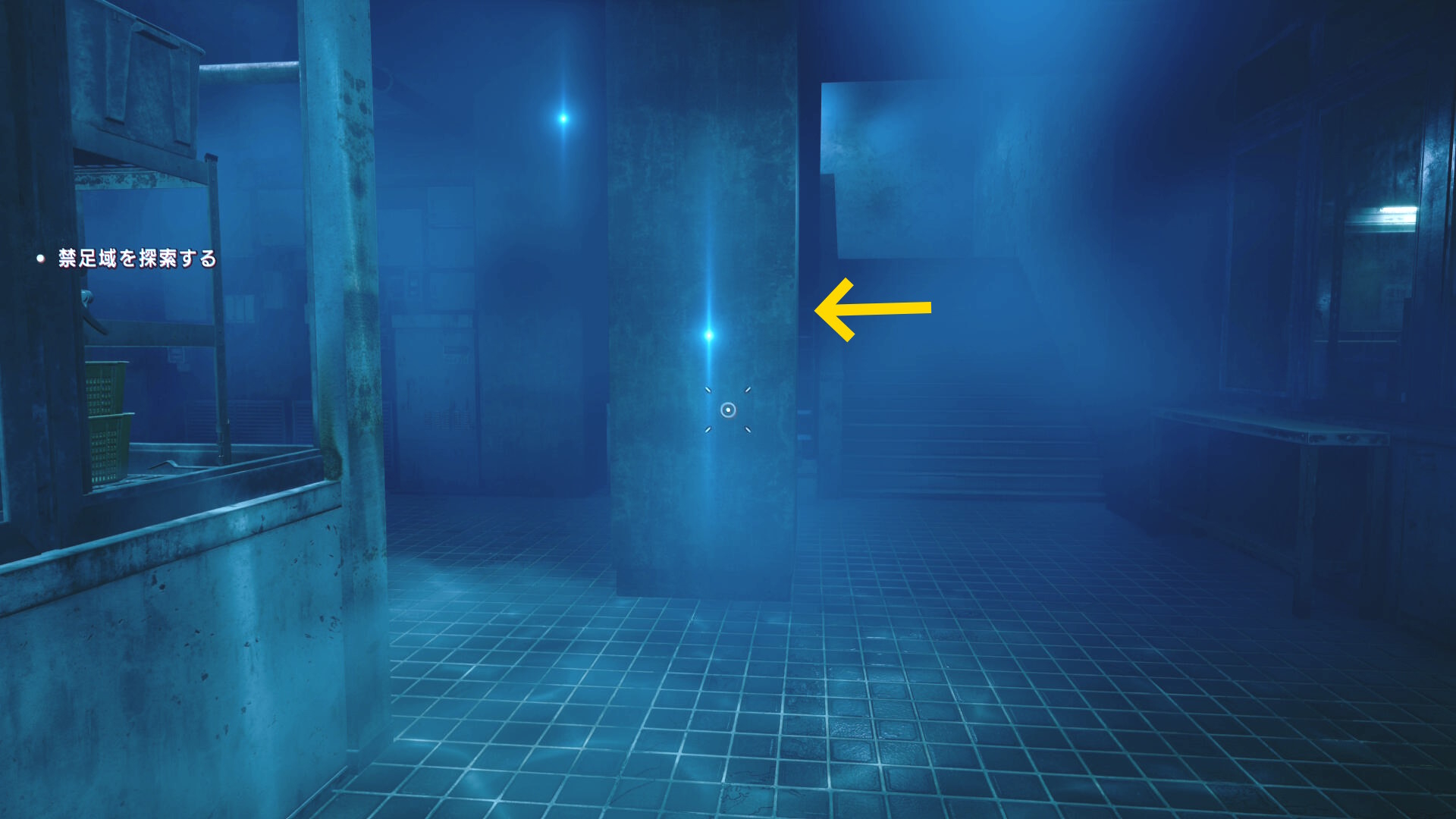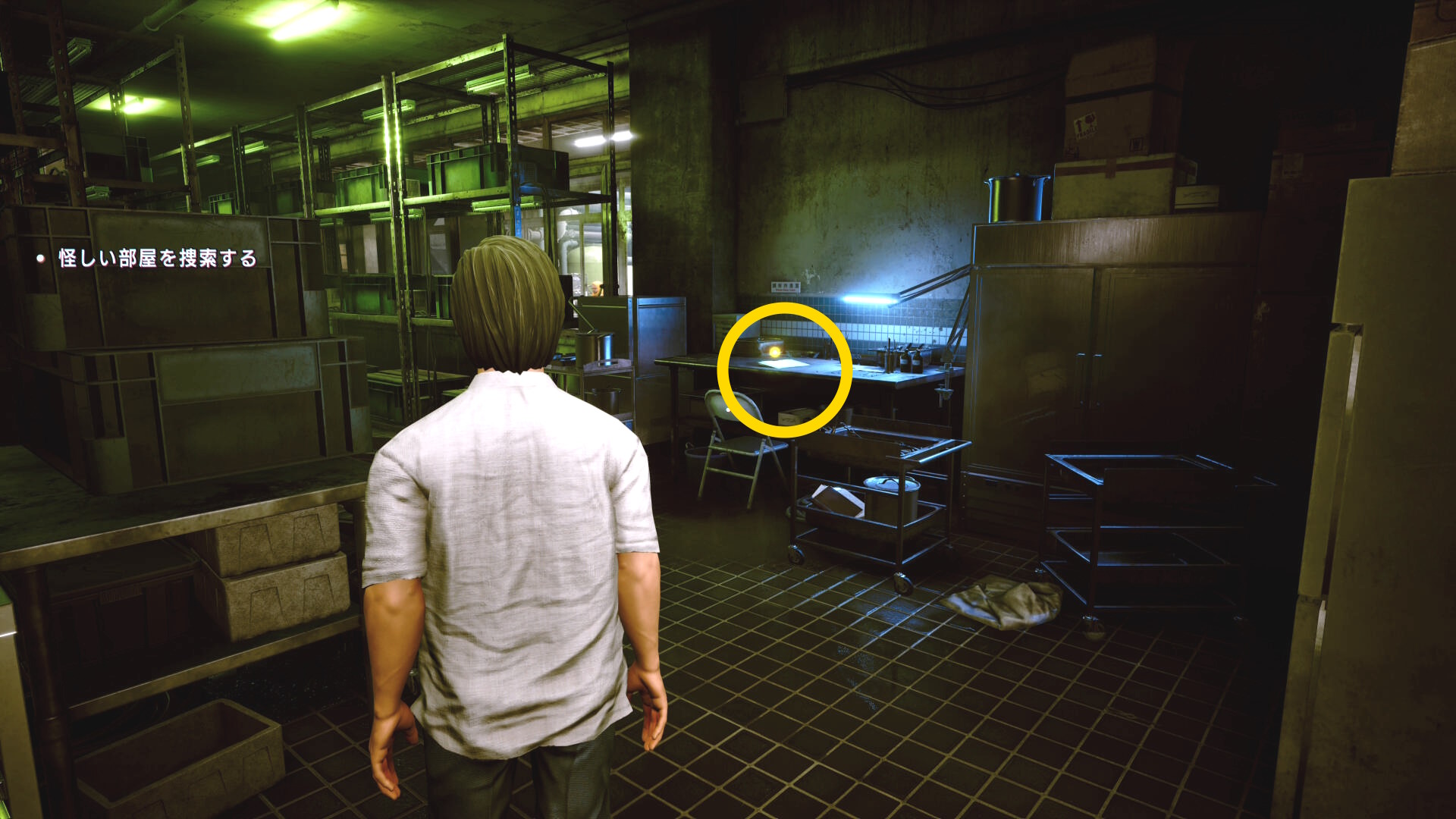 • 棚と棚の間の通路を進み、右側のコンテナを調べる