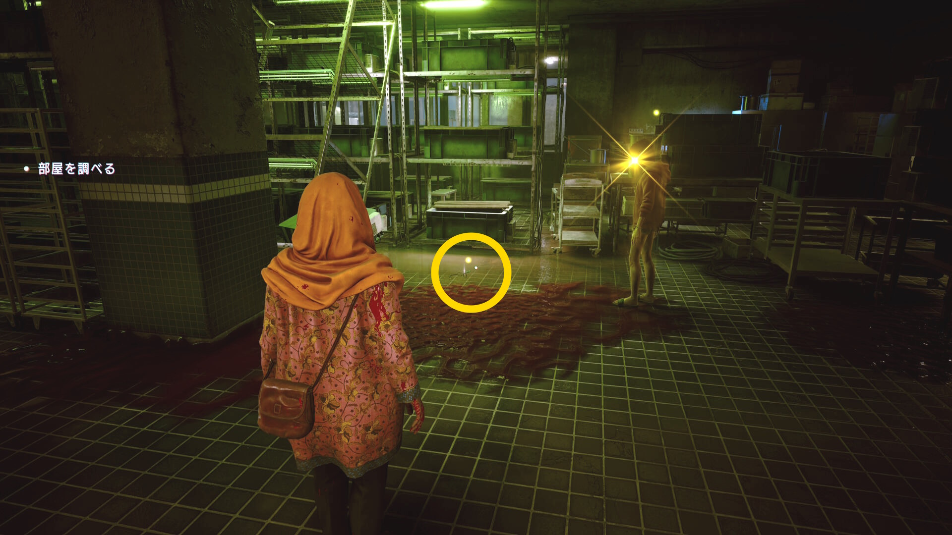• 同行者が立っているところ、床に残されたトミーとビクイーの遺留品を調べる