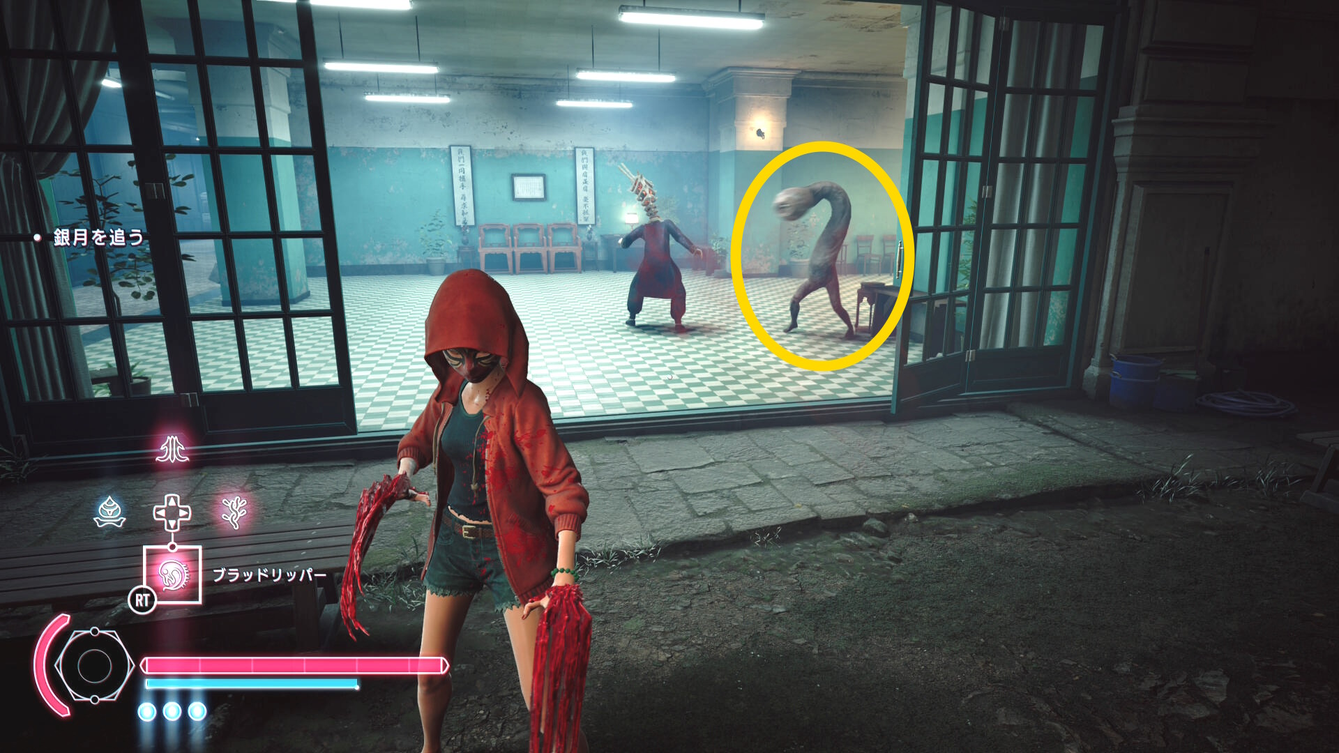 • 野狗子をキルし、ベランダから庭に下りると逃げていく銀月