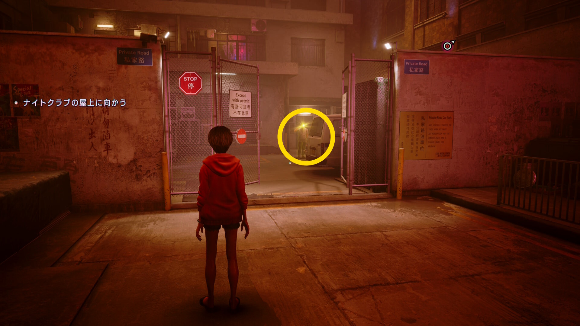 • 女性2人組との会話が終わったら、前方に見えるクラブの駐車場入口へ