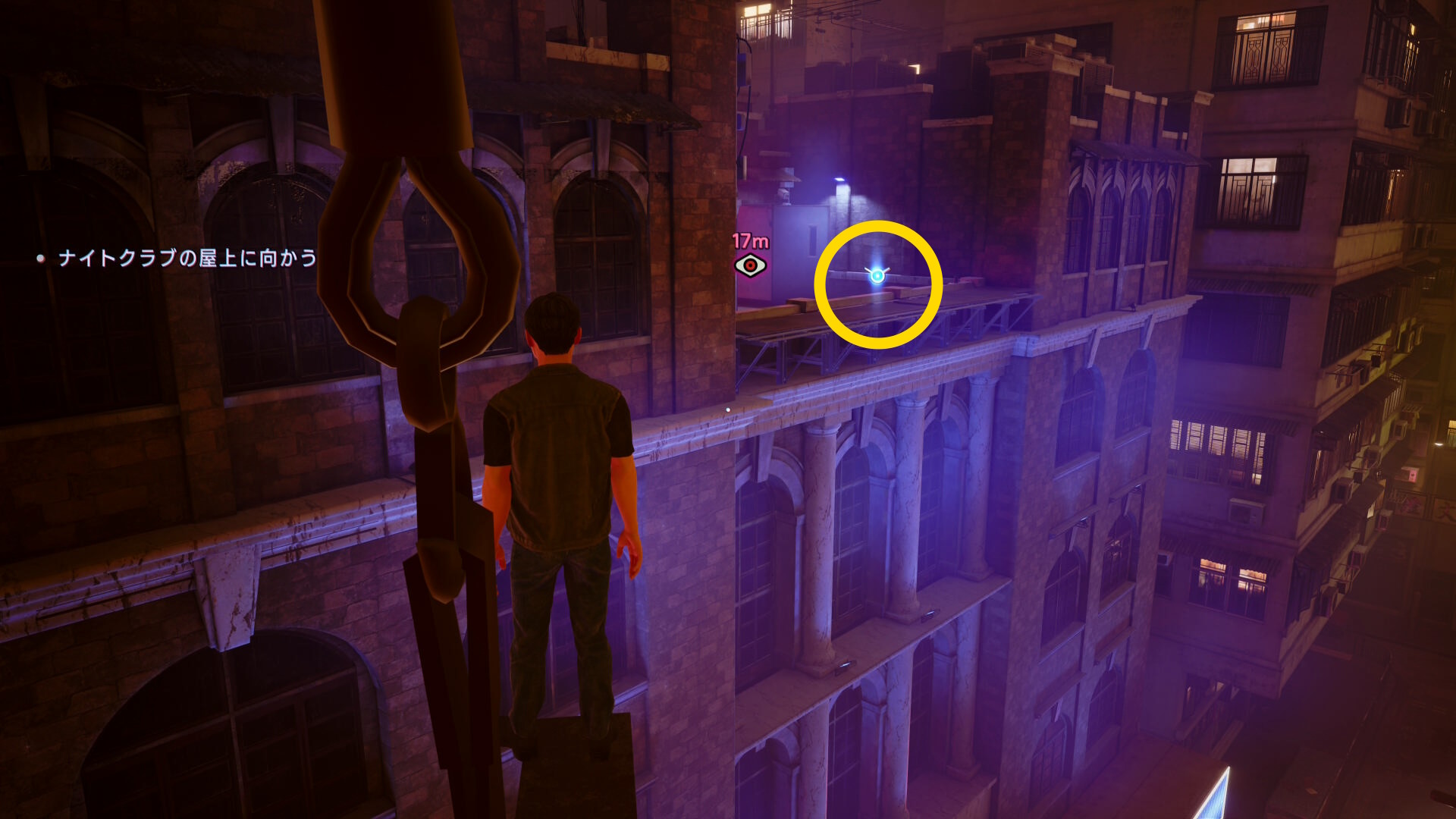 • 鉄骨に着地したら、右のナイトクラブの看板にブラッドジャンプ