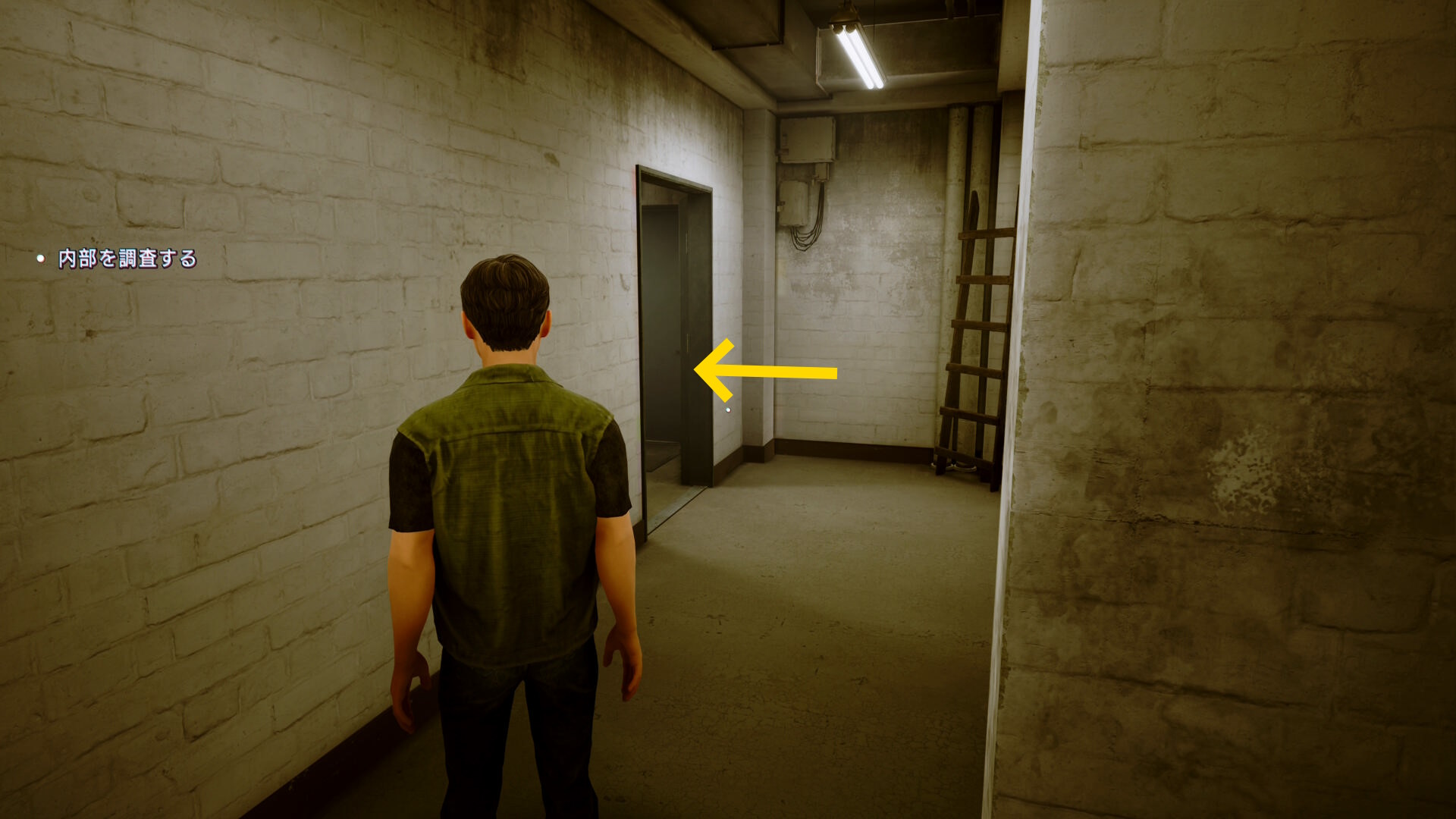 • 廊下のスキンヘッド(下画像矢印)が手前に移動して行ったら部屋を出て廊下を進んでいく