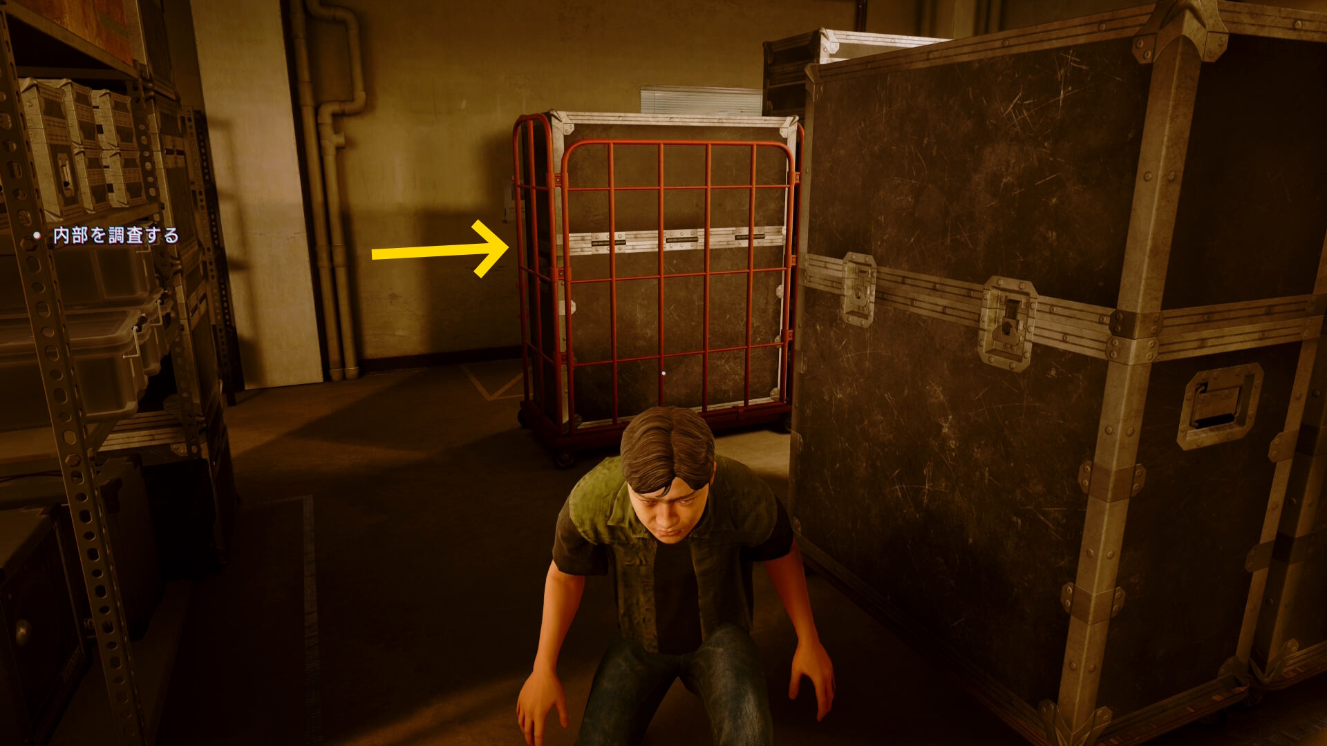 • 右を向き、積まれた荷物を足場にして上階へ