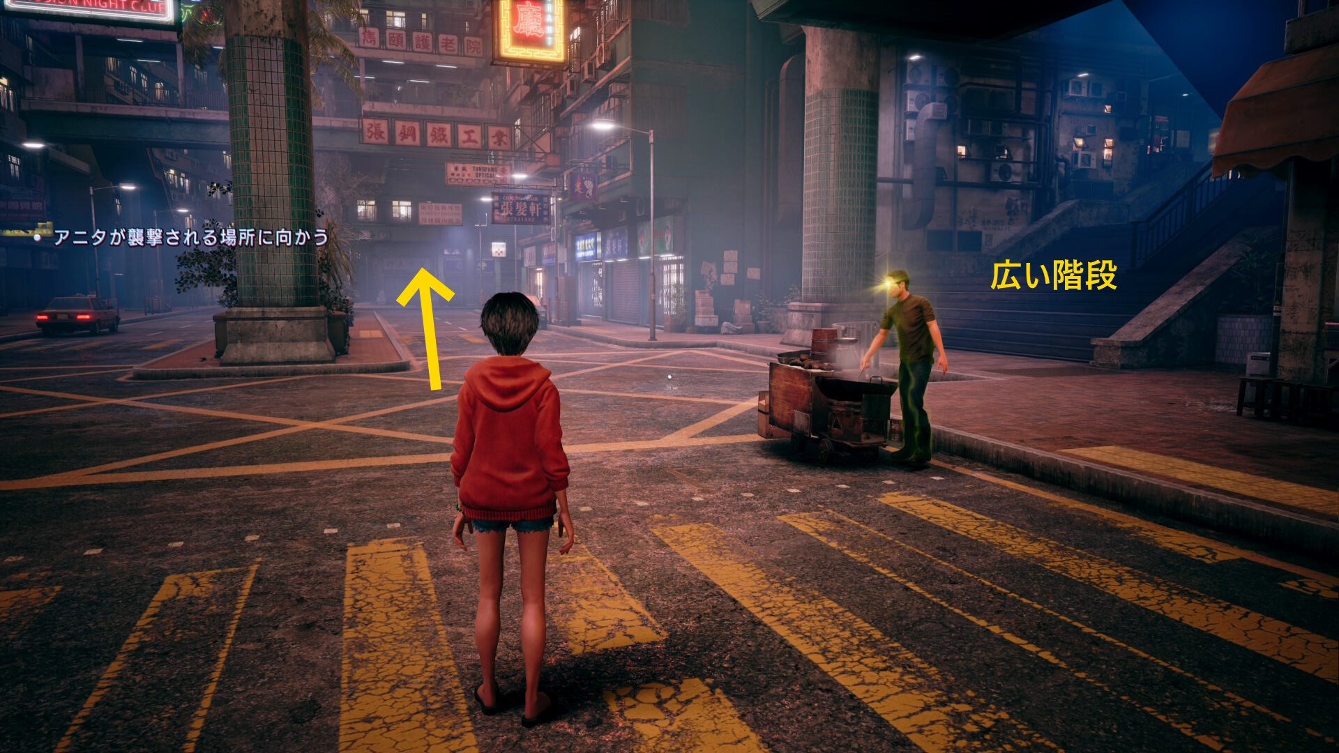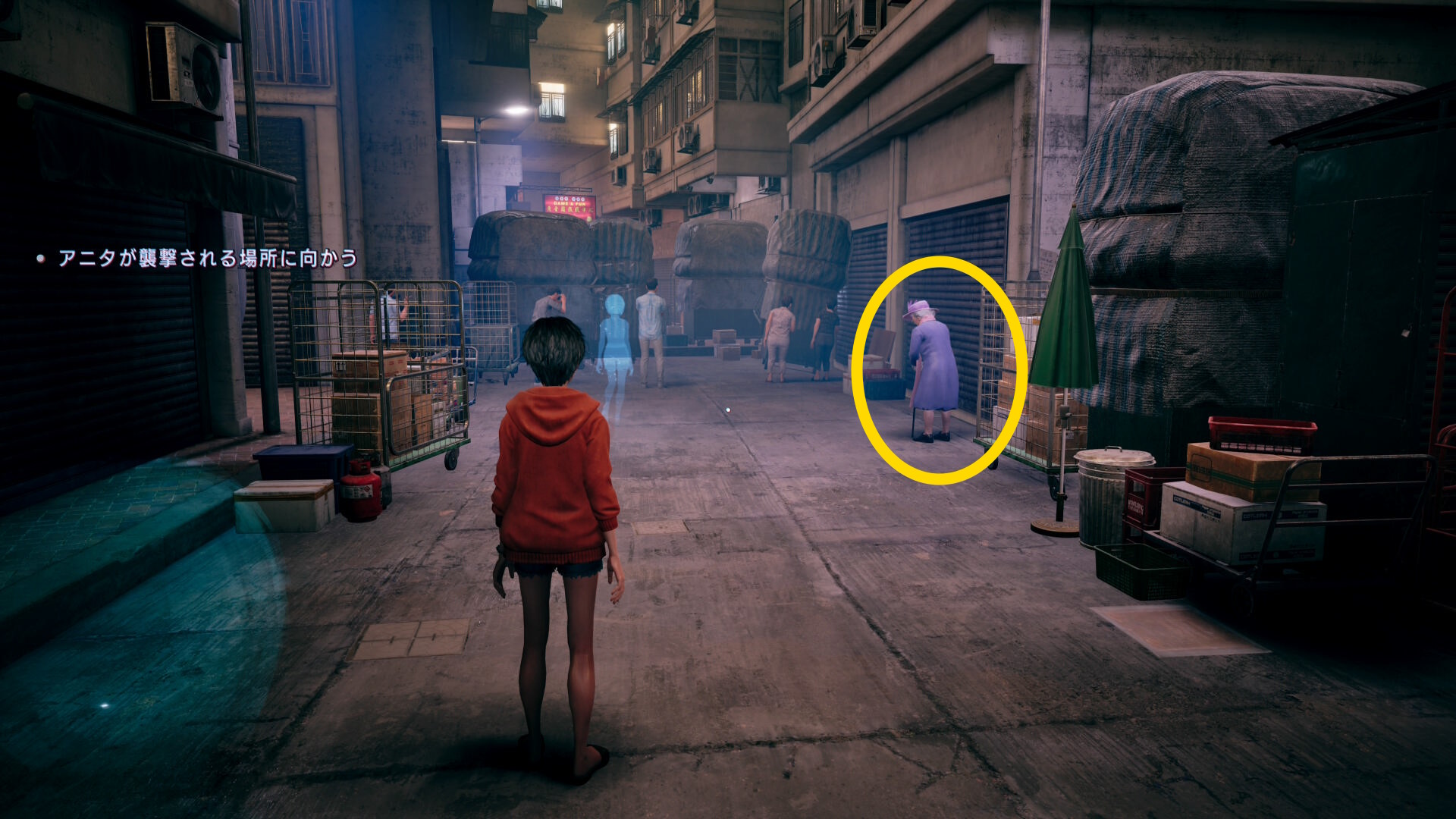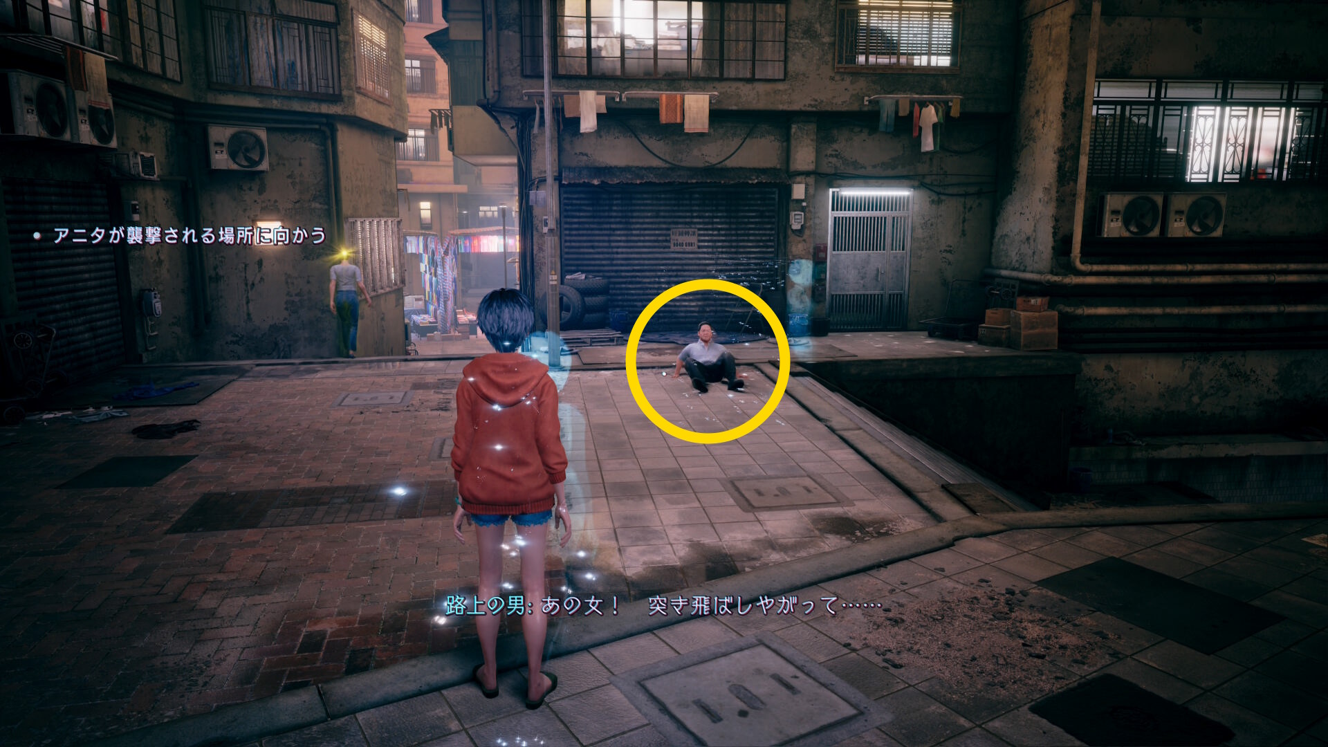 - 路地を進んでいくと『あの女! 突き飛ばしやがって……』の男性がいるところに出てくる