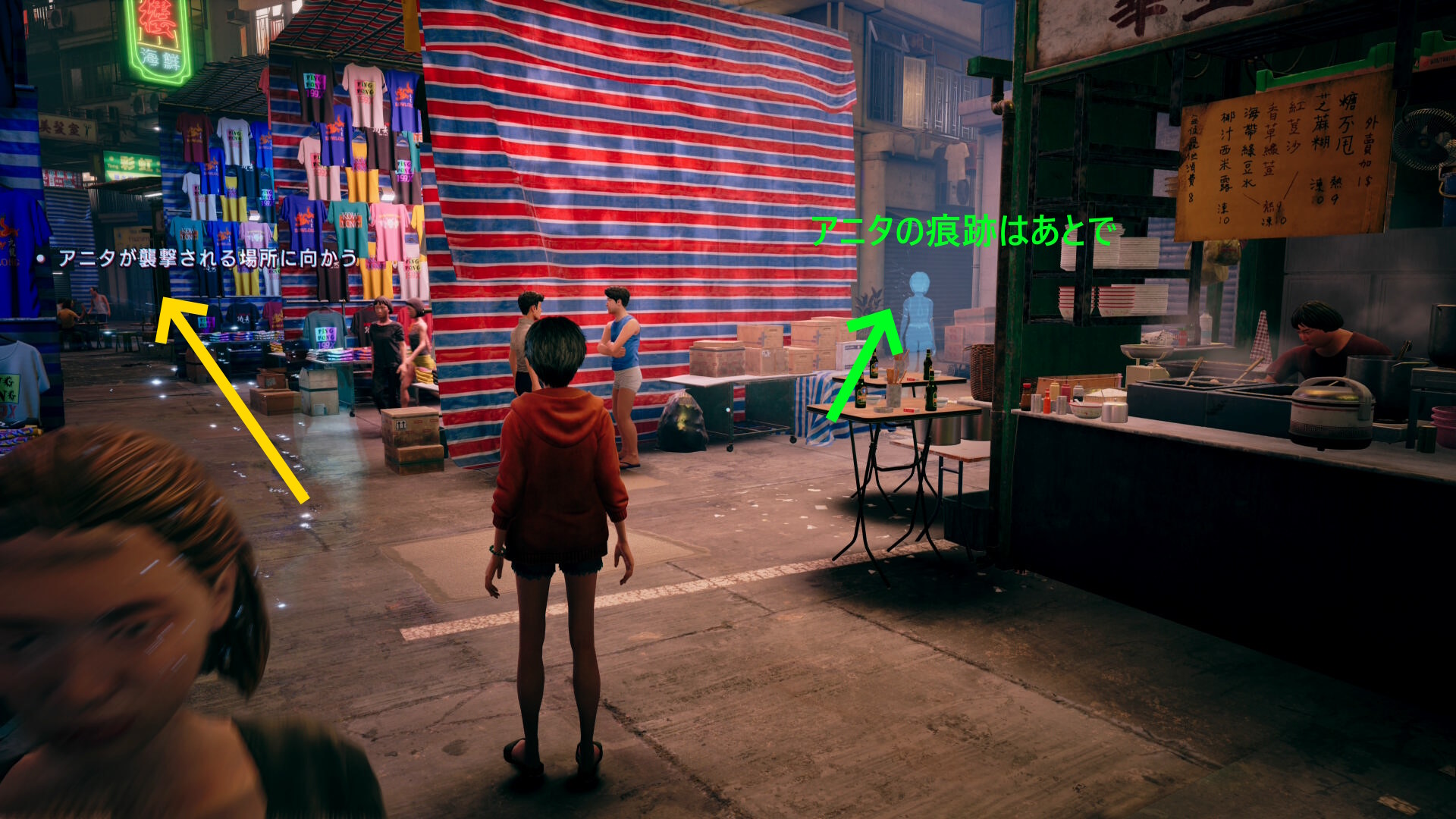 - 祠の番人をキルしたら路上市場に戻り、アニタの痕跡を追っていく
