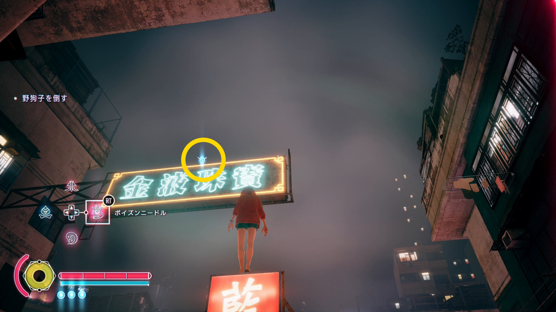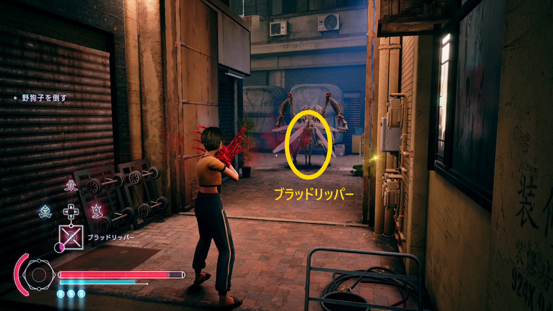 - 角で待機する野狗子に近づくと進んでしまうが、その少し手前で背面にぶら下がる人間部位にブラッドリッパーを当てて切り落としておこう