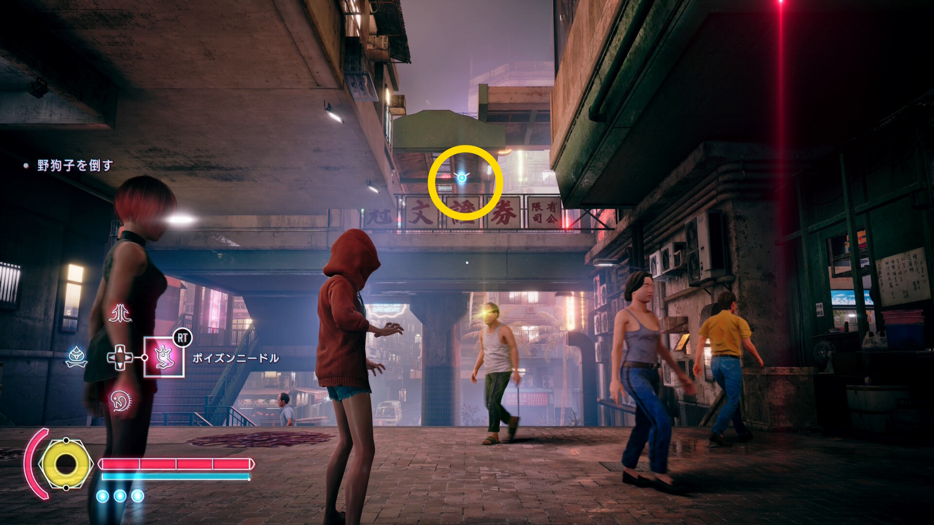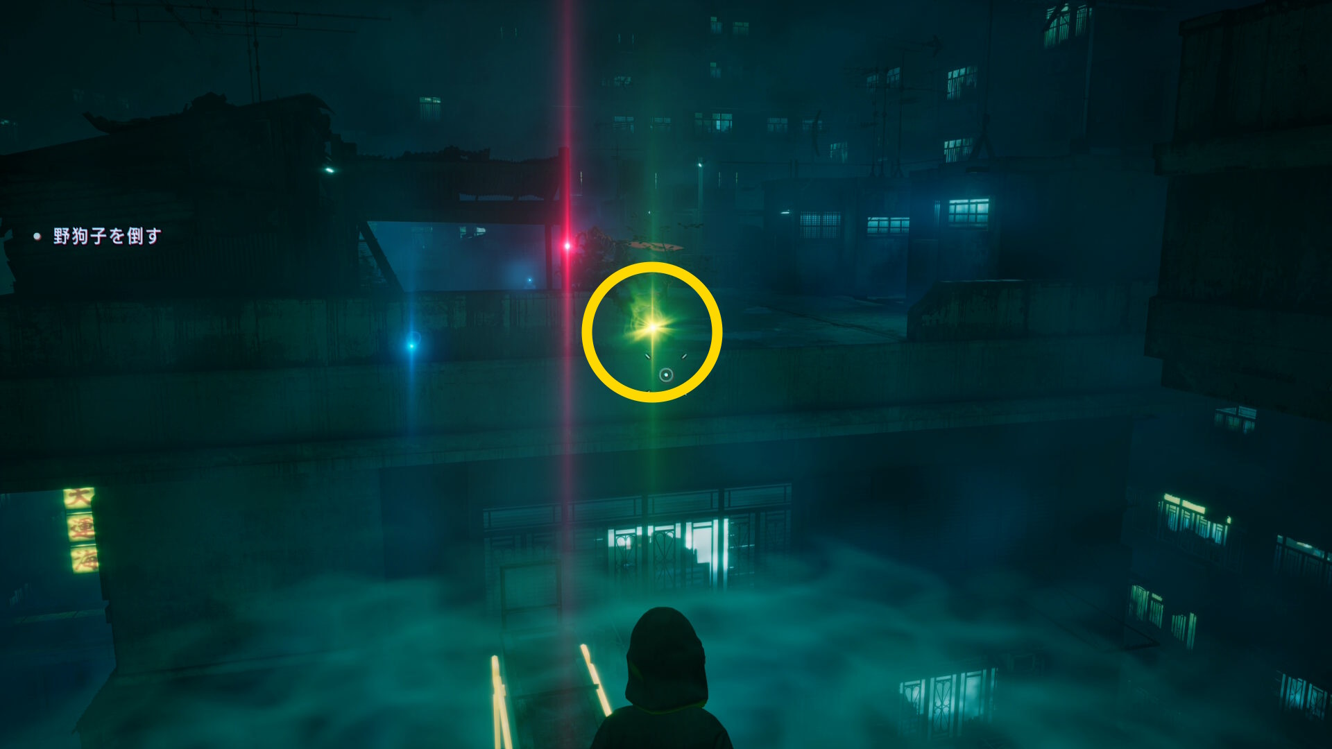- 回収しに向かうと左奥でタバコを吸っているやつが野狗子化するのでキルしよう(下画像:緑矢印)
