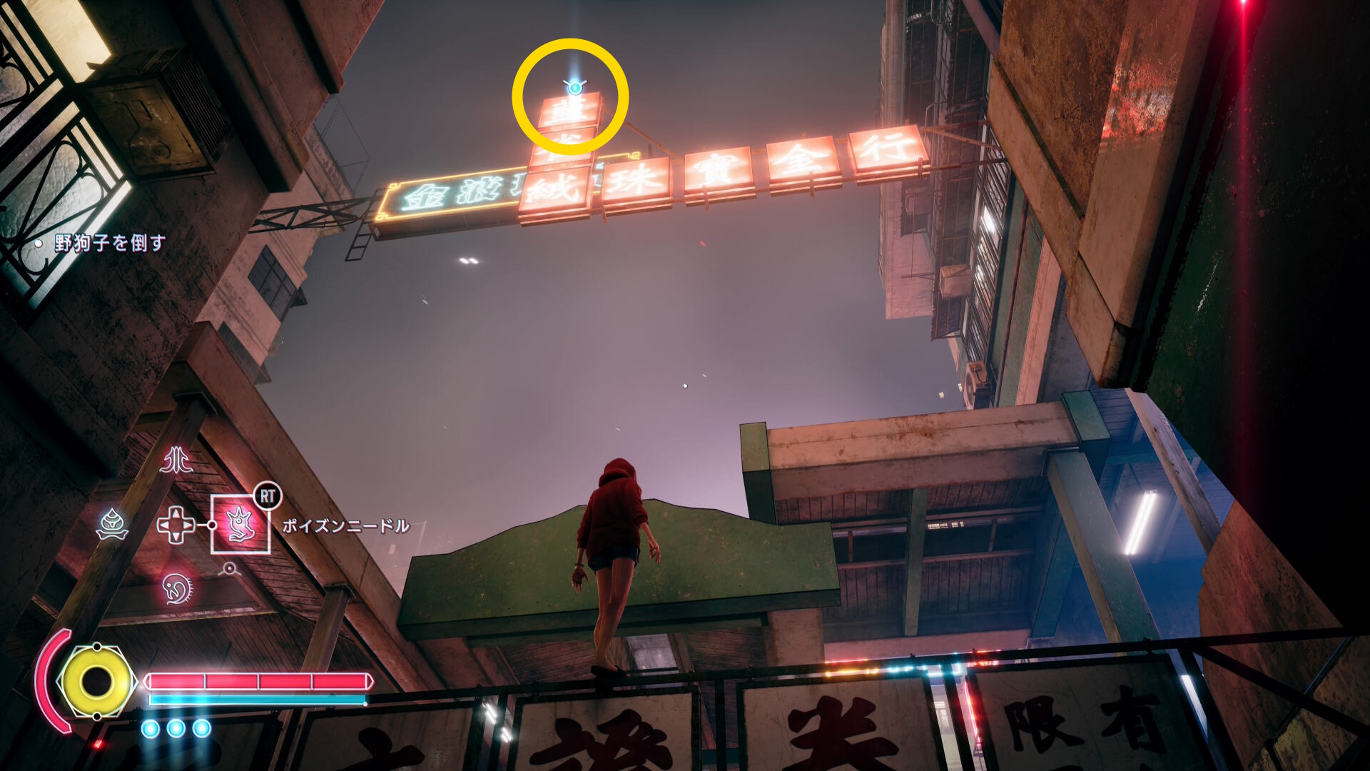 - 右を向くと屋上が見え、そこに野狗子と一般人がいる