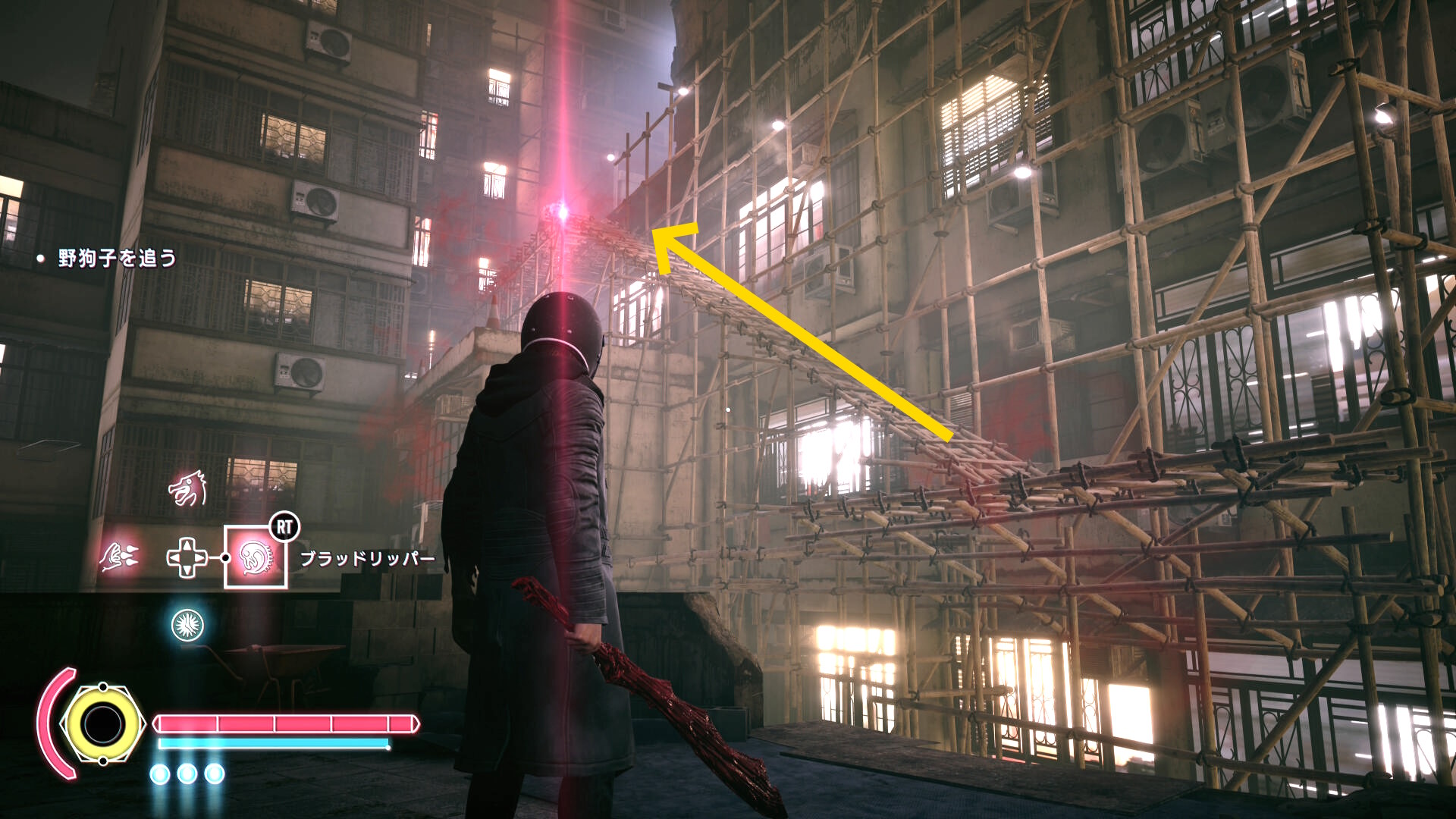 - 野狗子を追いかけ始めると頭上の看板に飛び移りながらビルの屋上に逃げていくので追いかける