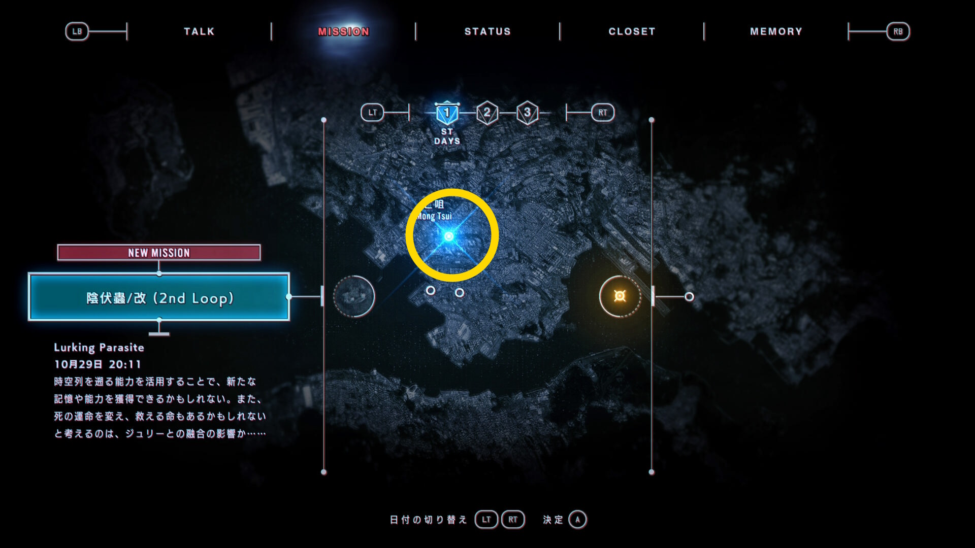 - 現状、3つのミッションを開始できるが、当サイトでは1日目の「陰伏蟲/改(2nd Loop)」からプレイする