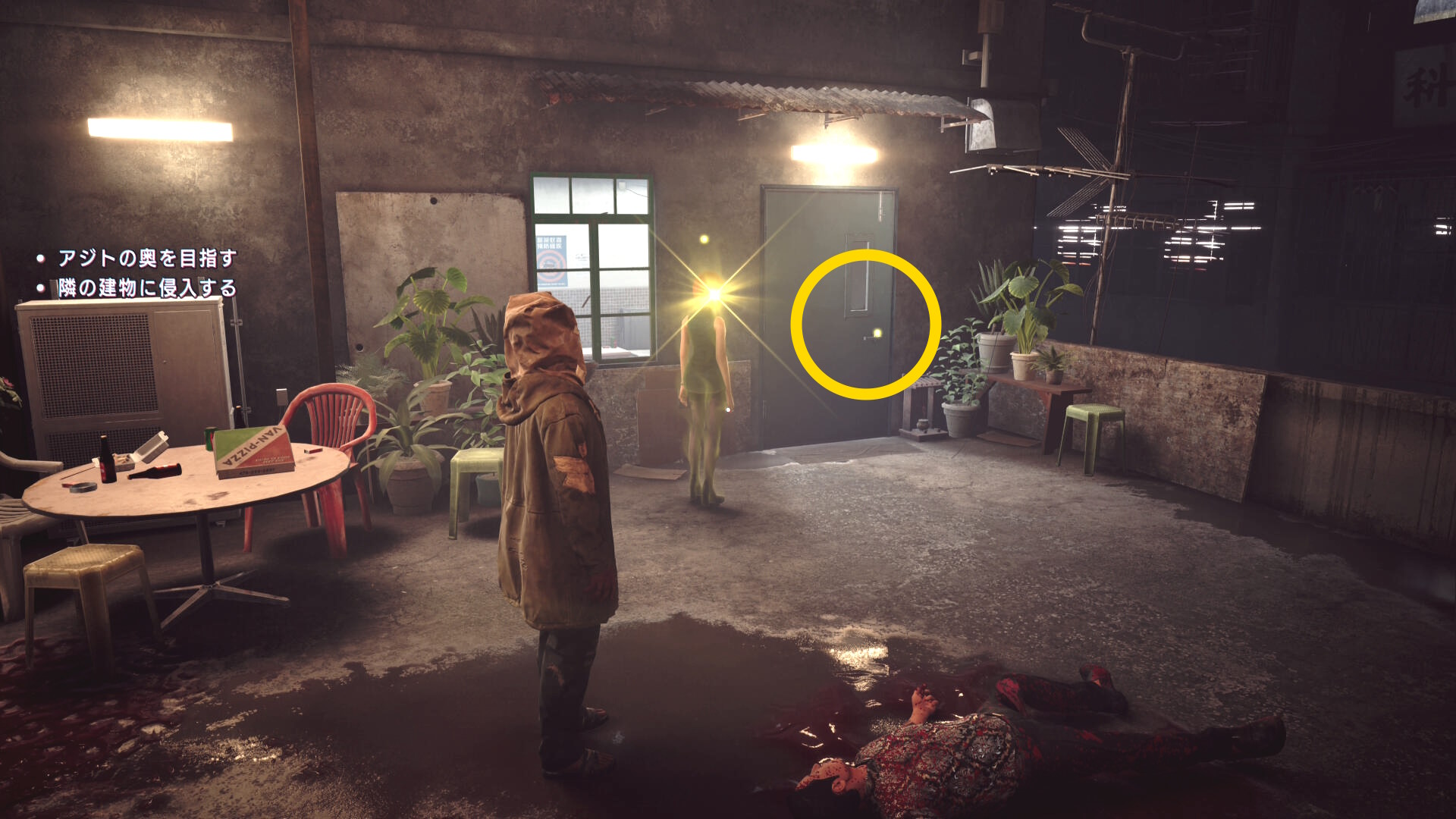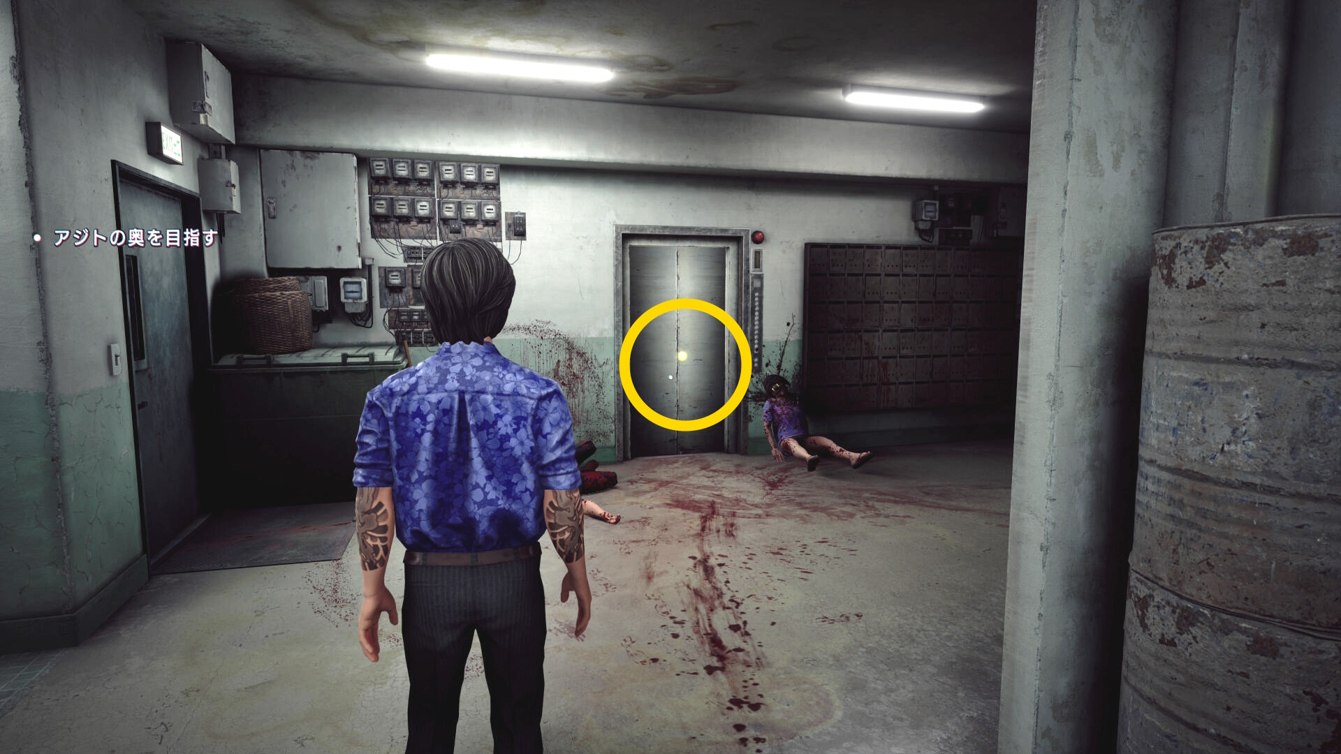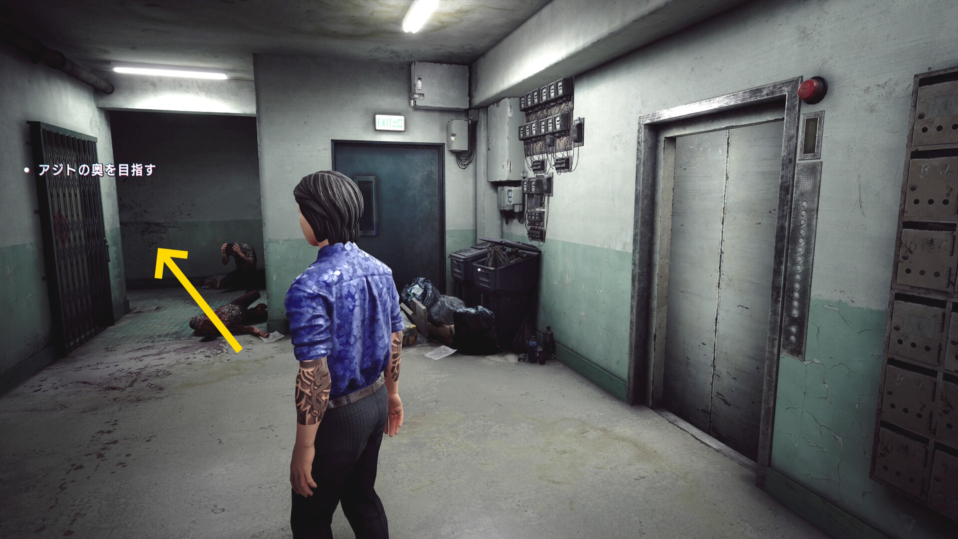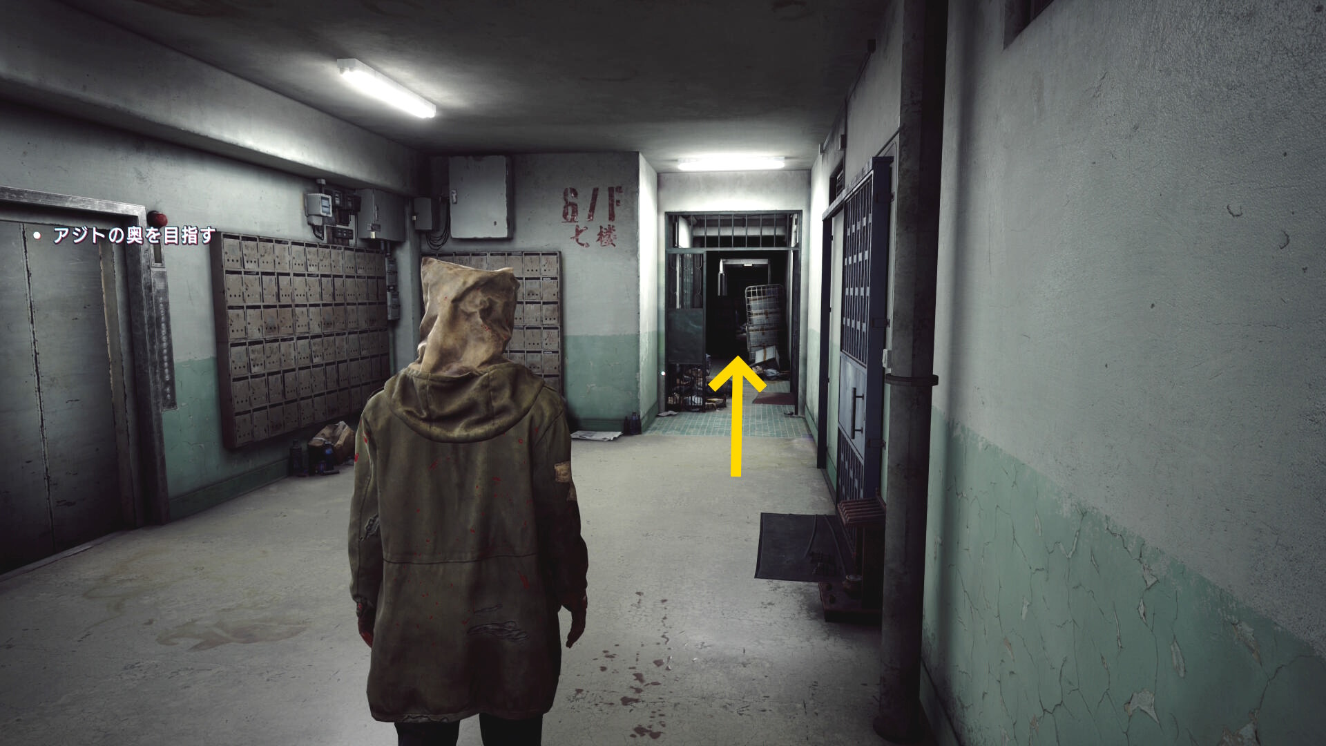 • 階段を下りていくと建物入口に死体が転がっている