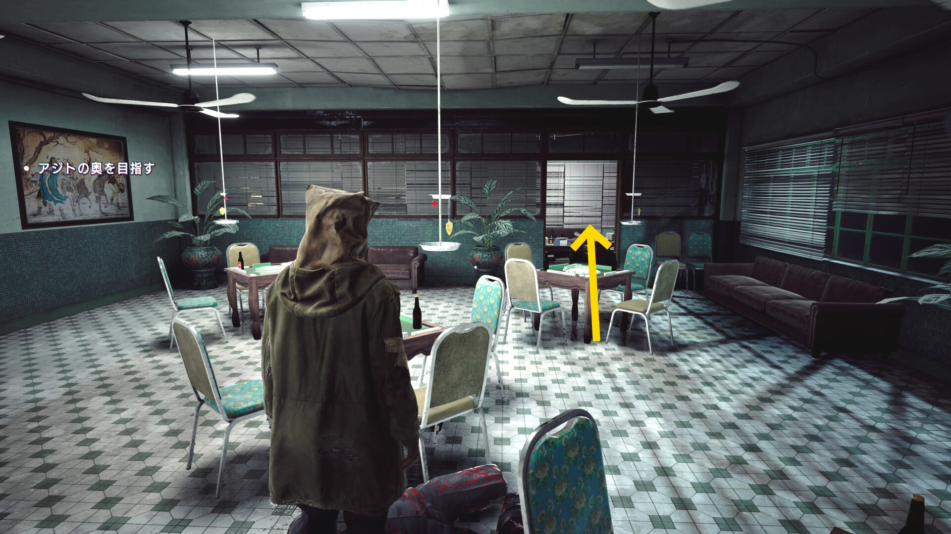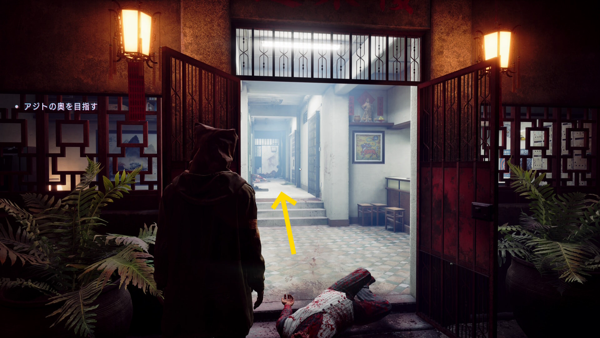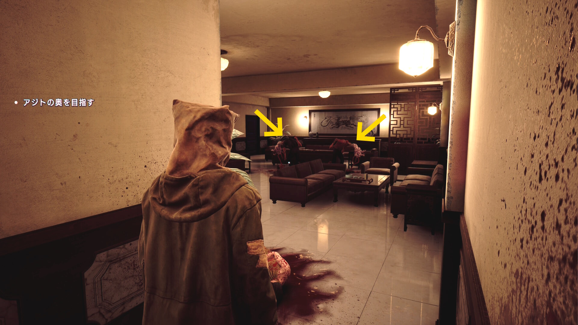 • 階段を下りていくと建物入口に死体が転がっている