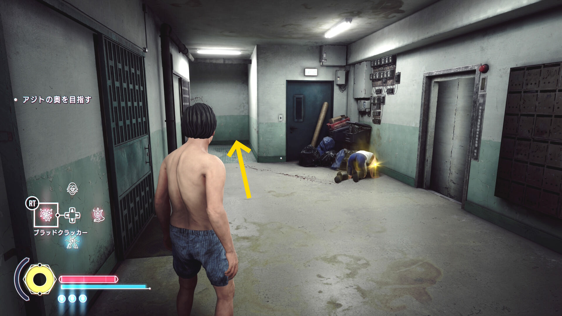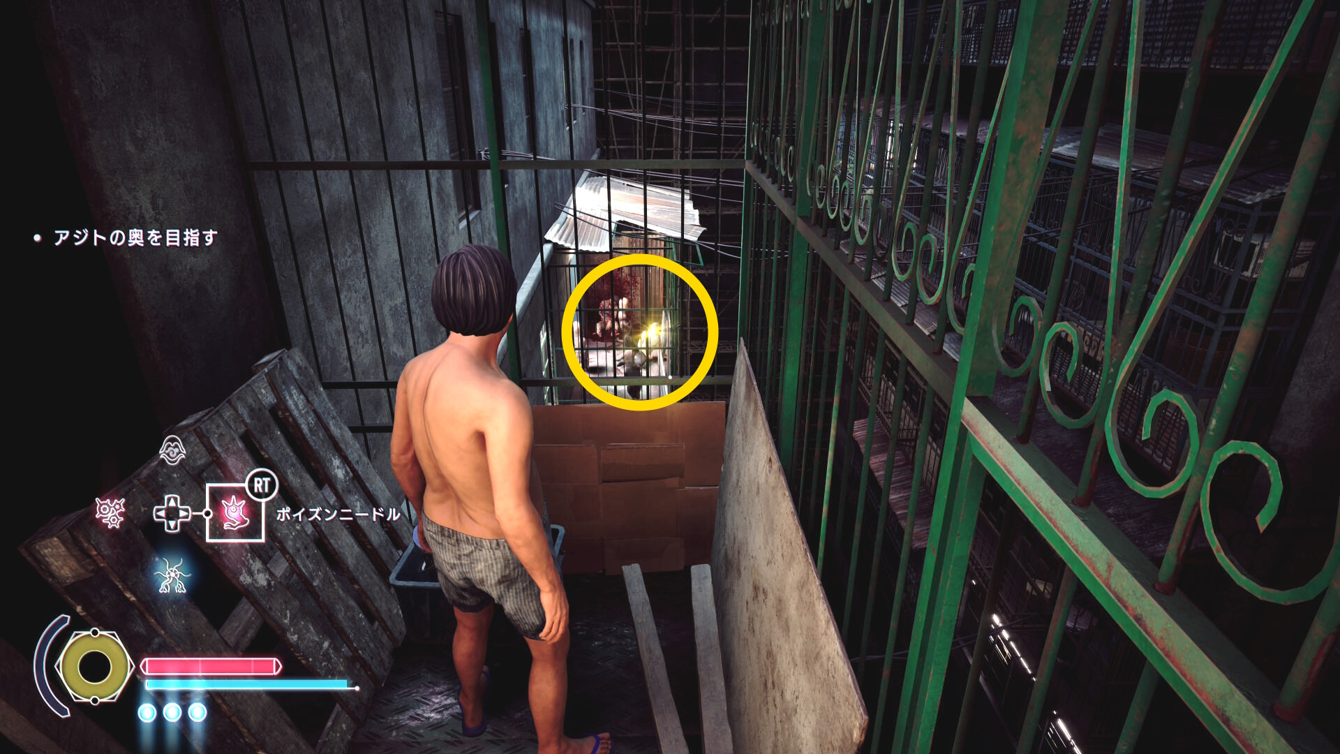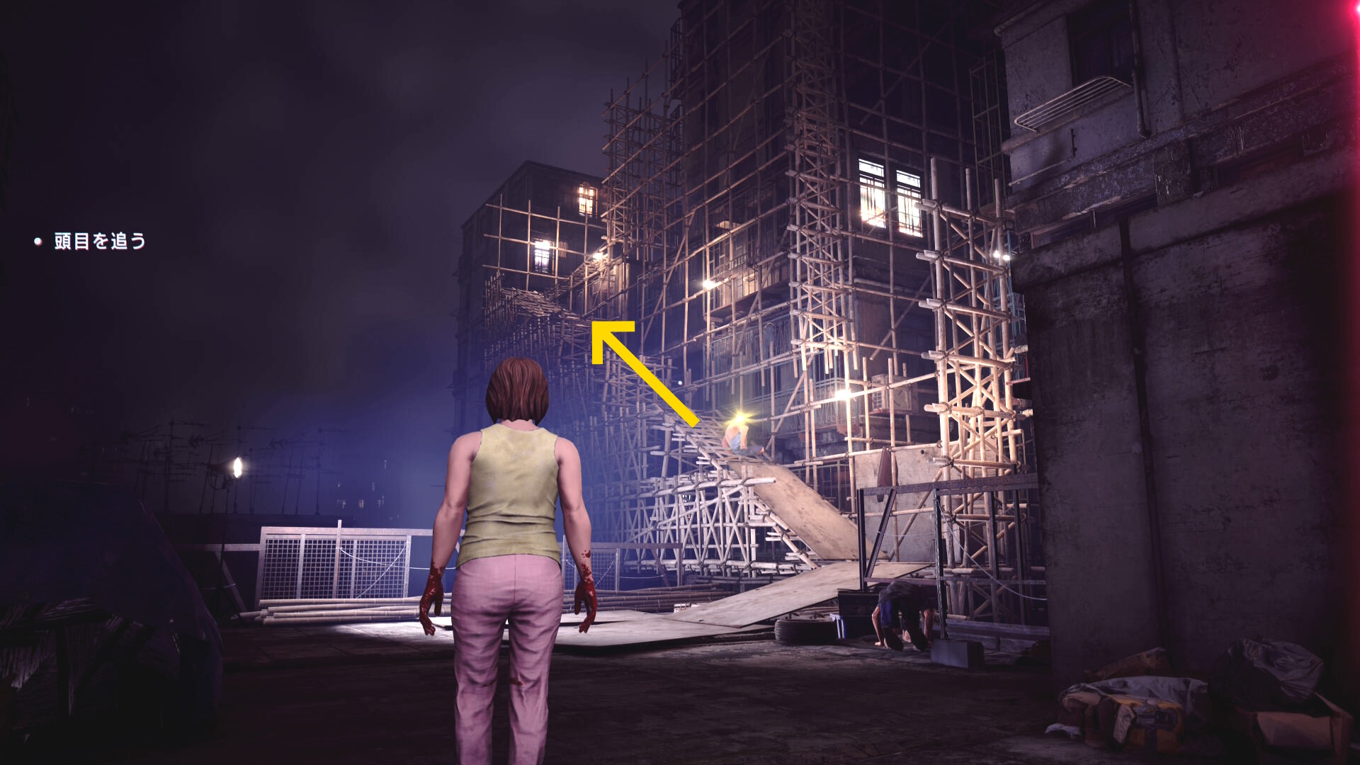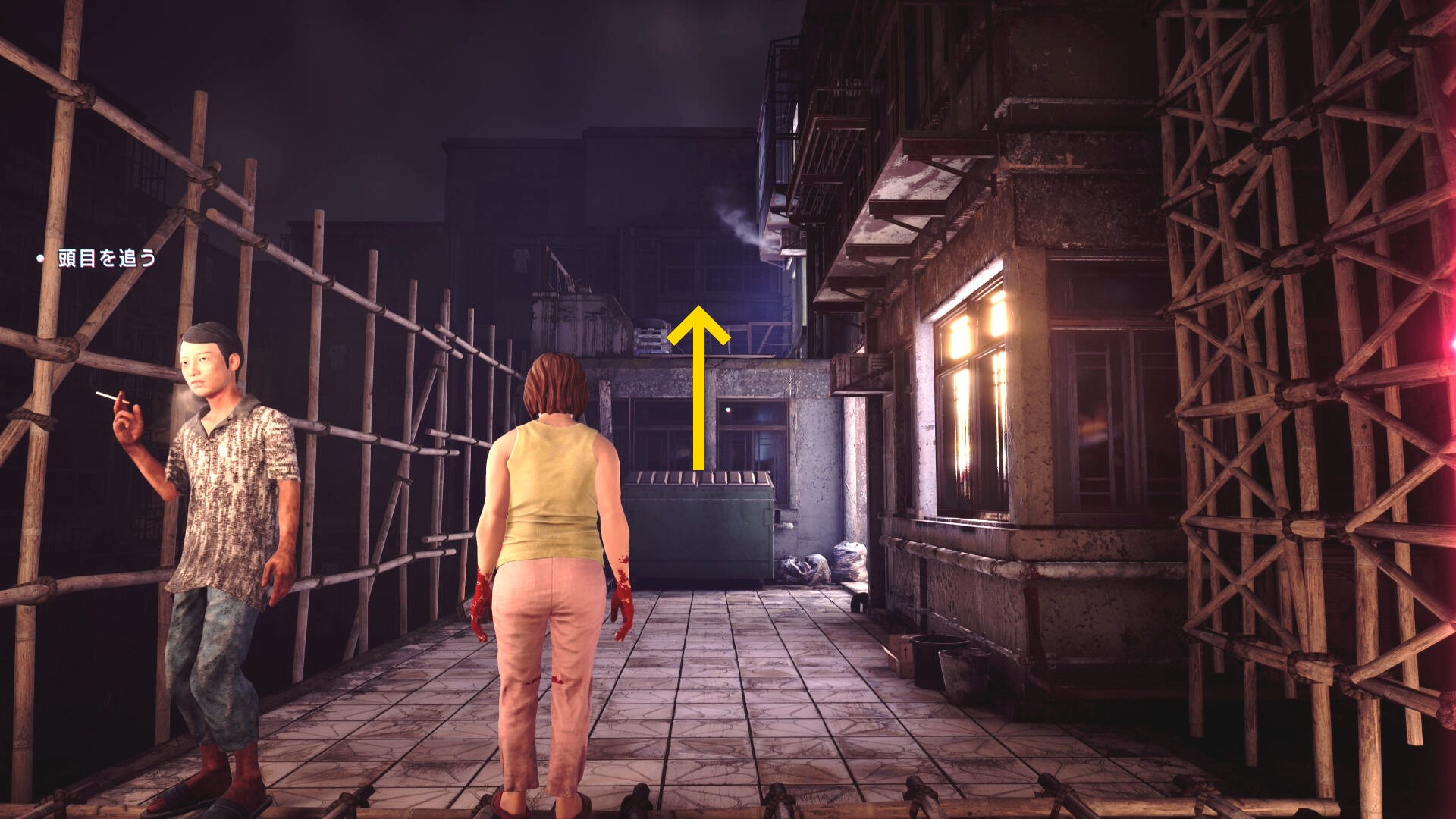 • もし HP がギリギリになり、まだ人間部位が切り落とせていない場合は「ゴミ箱の手前で一服する男性」および「登ってきた足場にもう1人」いるので、彼らに憑依すれば間に合うでしょう