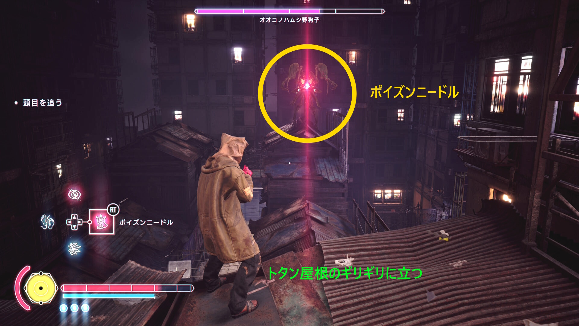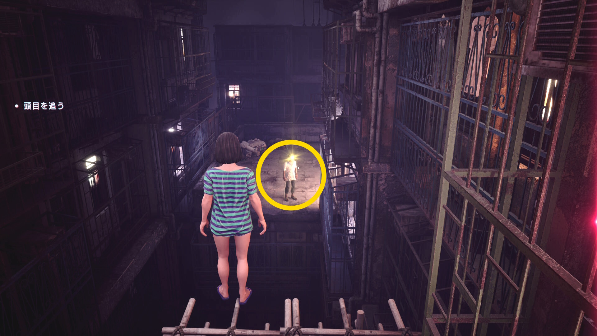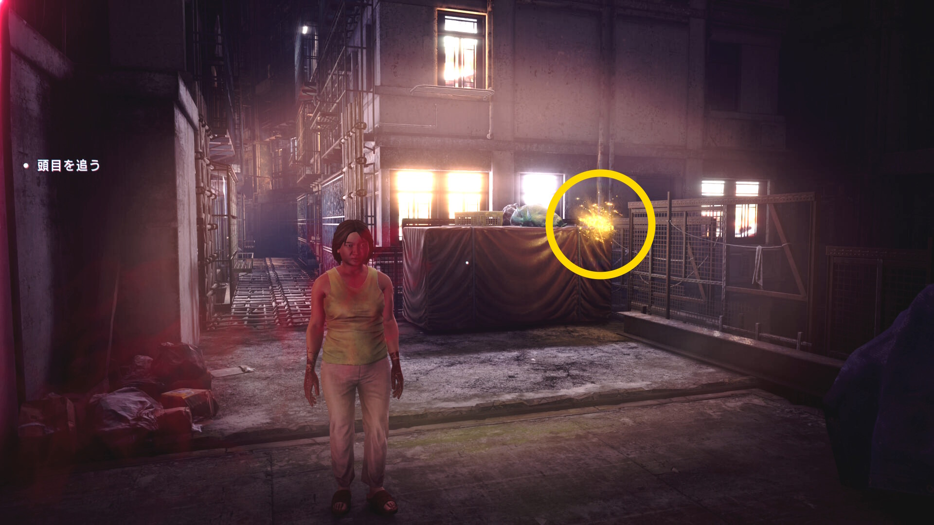• もし HP がギリギリになり、まだ人間部位が切り落とせていない場合は「ゴミ箱の手前で一服する男性」および「登ってきた足場にもう1人」いるので、彼らに憑依すれば間に合うでしょう