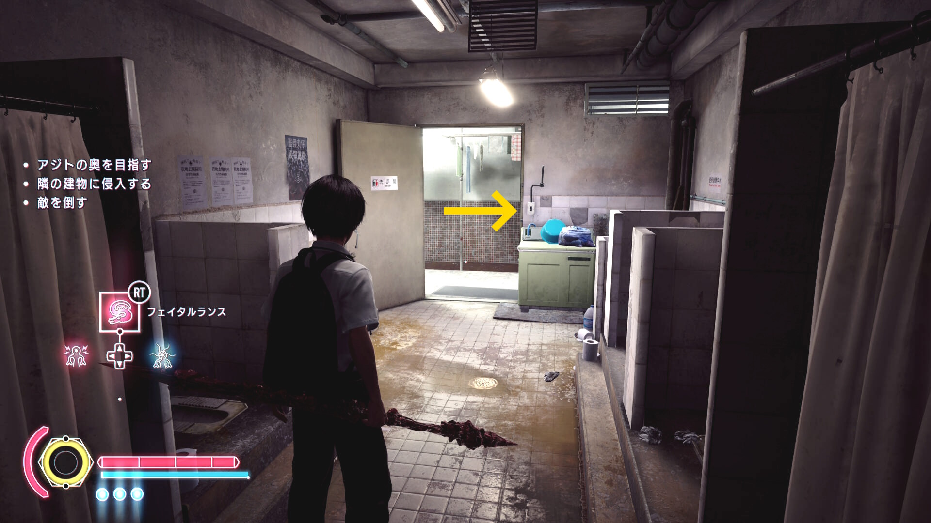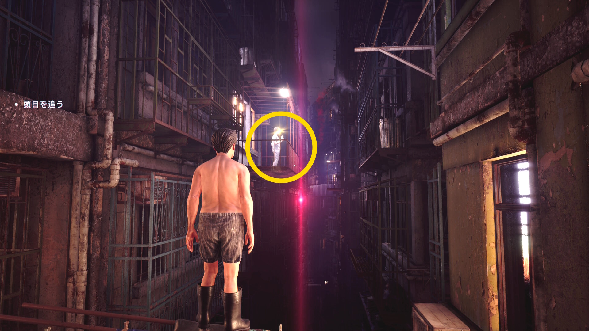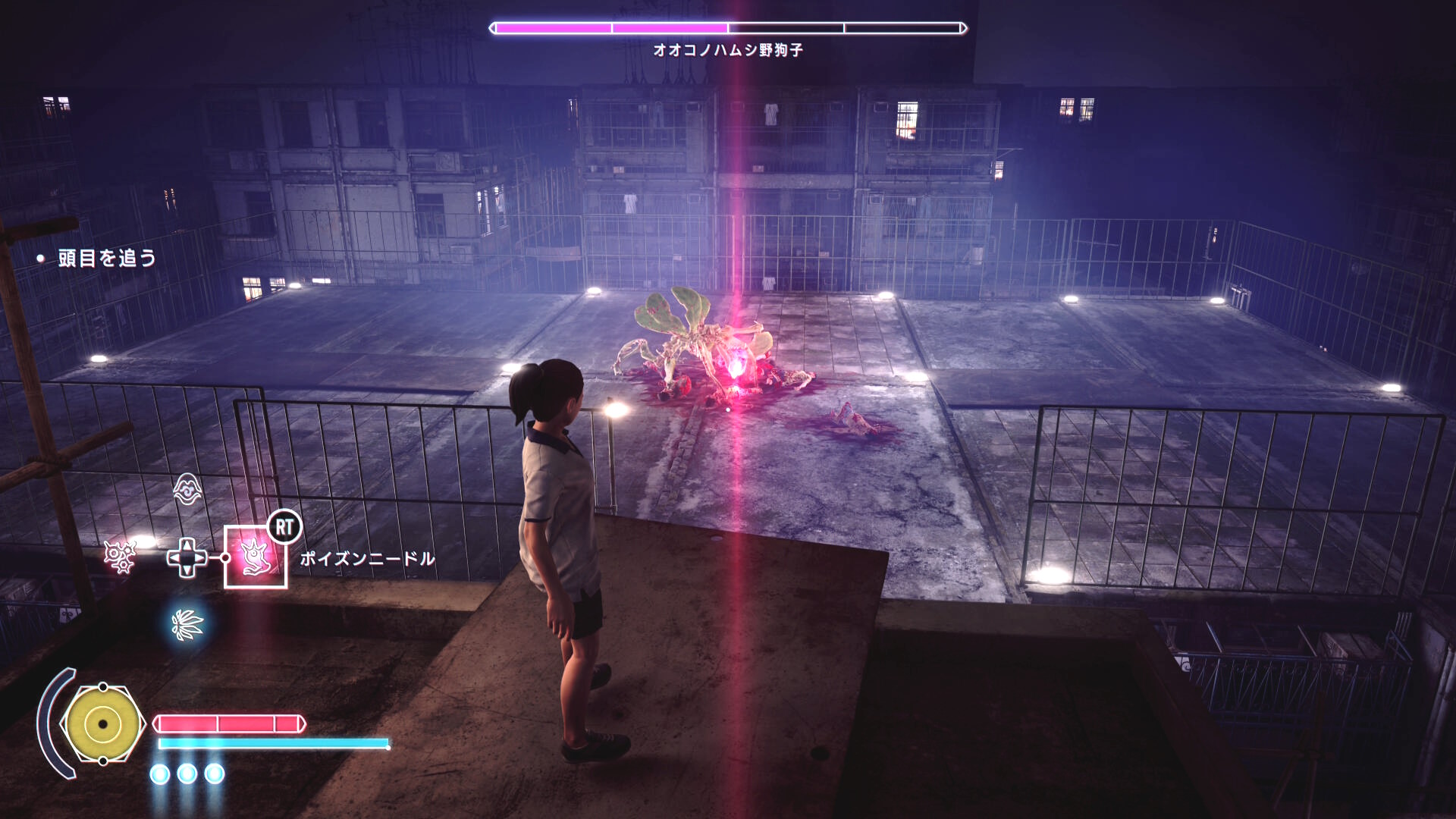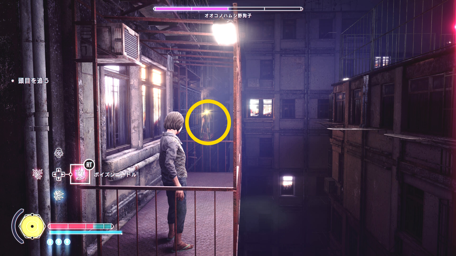 • もし HP がギリギリになり、まだ人間部位が切り落とせていない場合は「ゴミ箱の手前で一服する男性」および「登ってきた足場にもう1人」いるので、彼らに憑依すれば間に合うでしょう