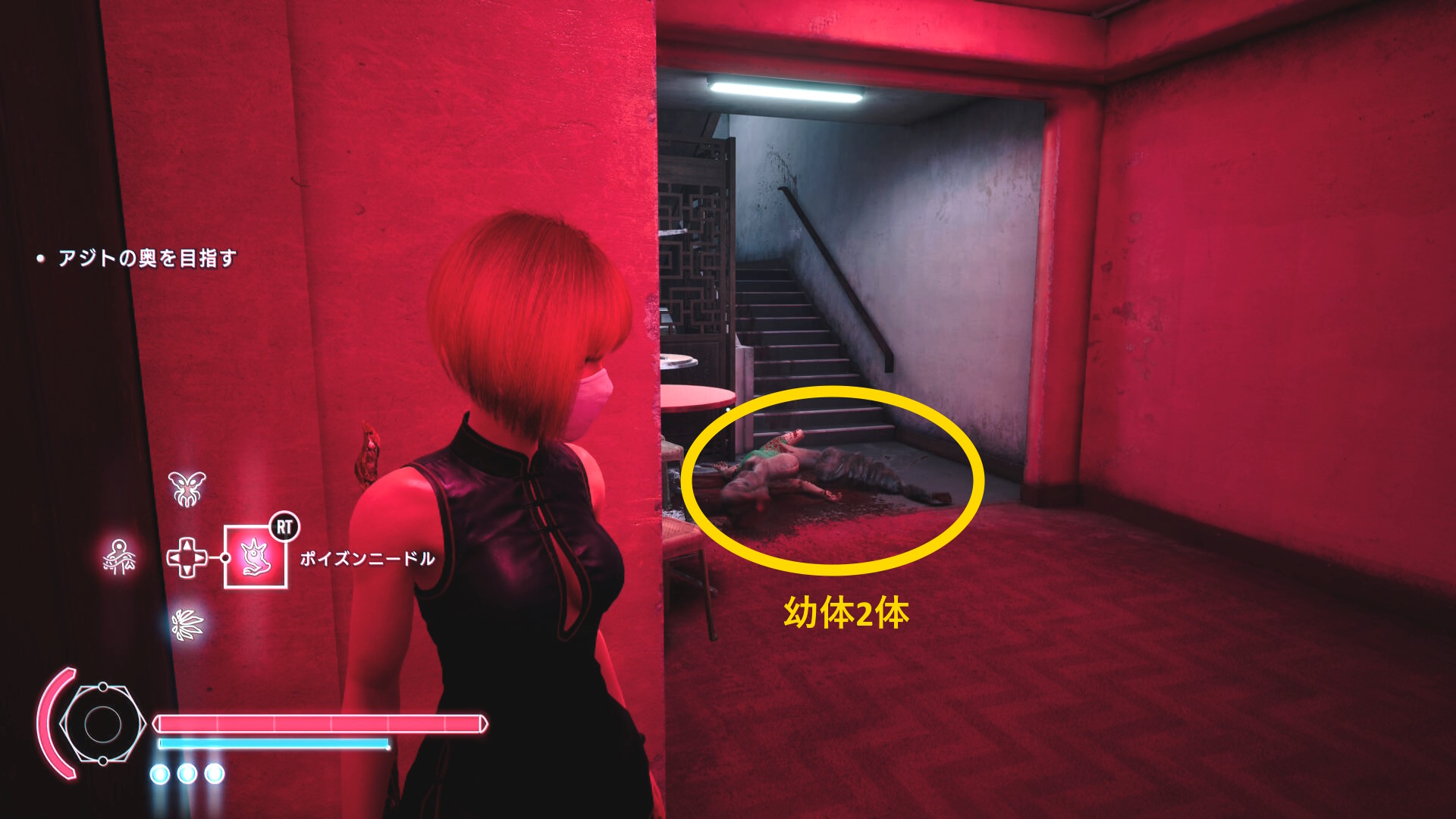 • 角を曲がったところ、幼体2体が死体を貪っているのでキル