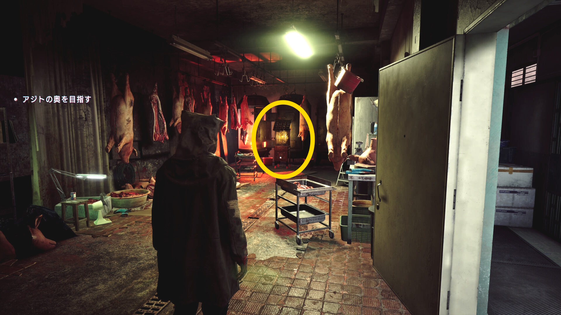 • 廊下の突き当り、右の開いているドアから肉処理室に入る