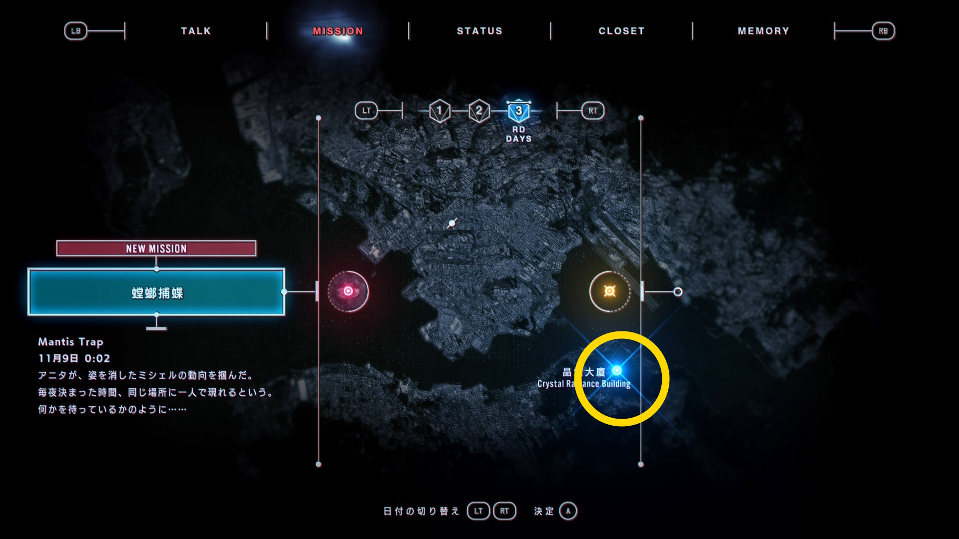 • 現状、いくつかのミッションがアンロックされているが、当サイトでは3日目「螳螂捕蝶」をプレイする