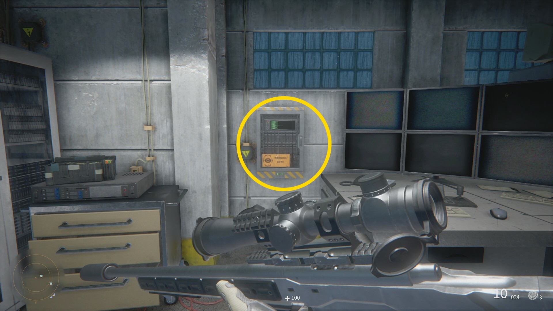 - 全部で5人の敵が配置についたら、少しすると左に見える蓋が開いた配電盤にフォーカスし、環境利用の解説あり