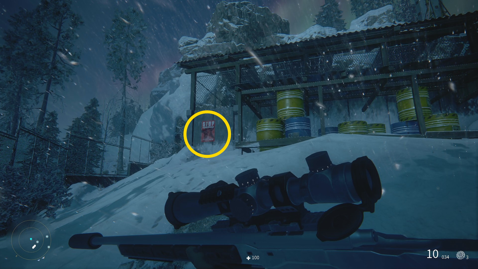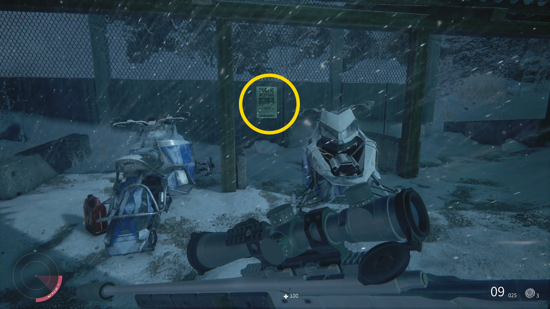 - 北にある収集品はイヴァノブスキがいる要塞のような施設の外、スノーモービルが停まっている駐車場の壁に 収集品 (パブリックミーティング:4/6)