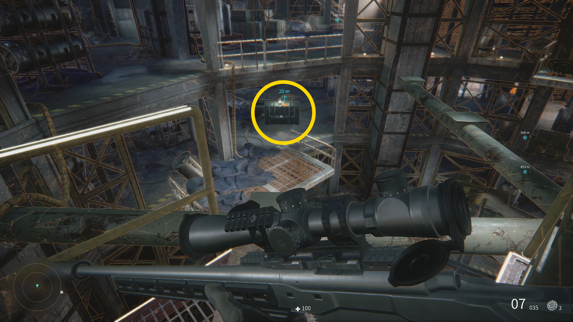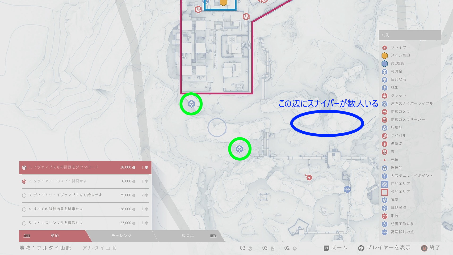 - 警戒されたり、見つかったりしてはいけない、ということはないのでジップラインで下りる前にスナイパーライフルでキルしても無問題 (将校だけは残しておく)