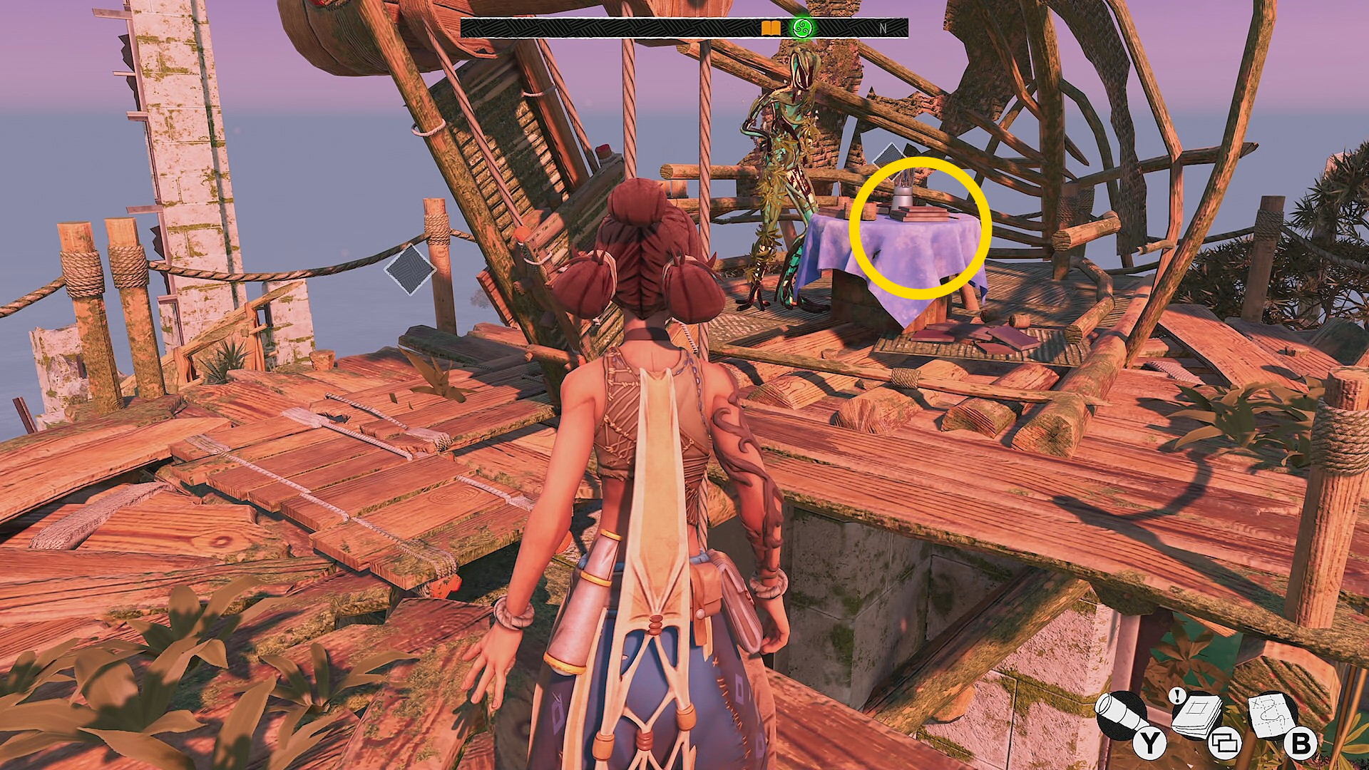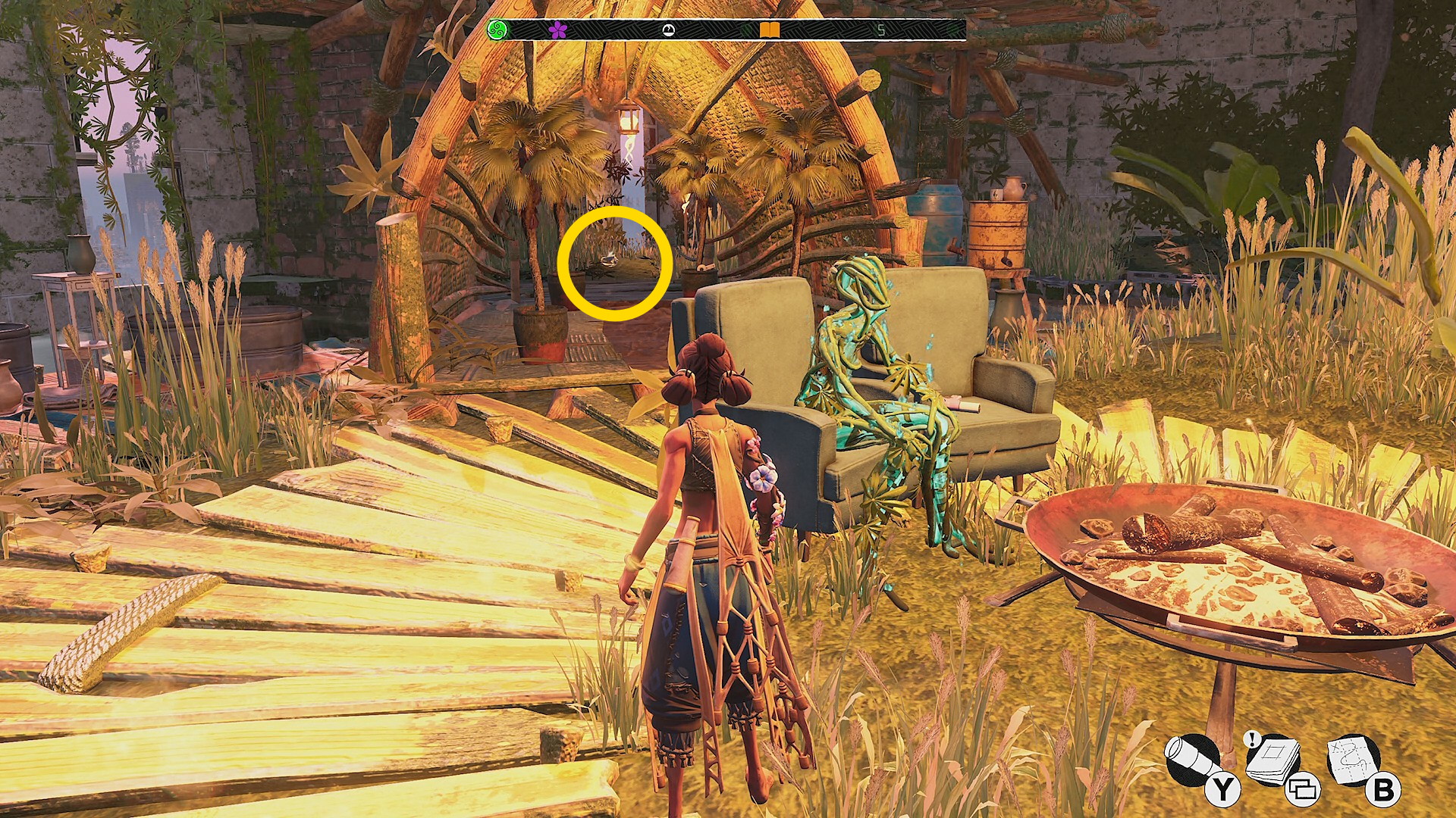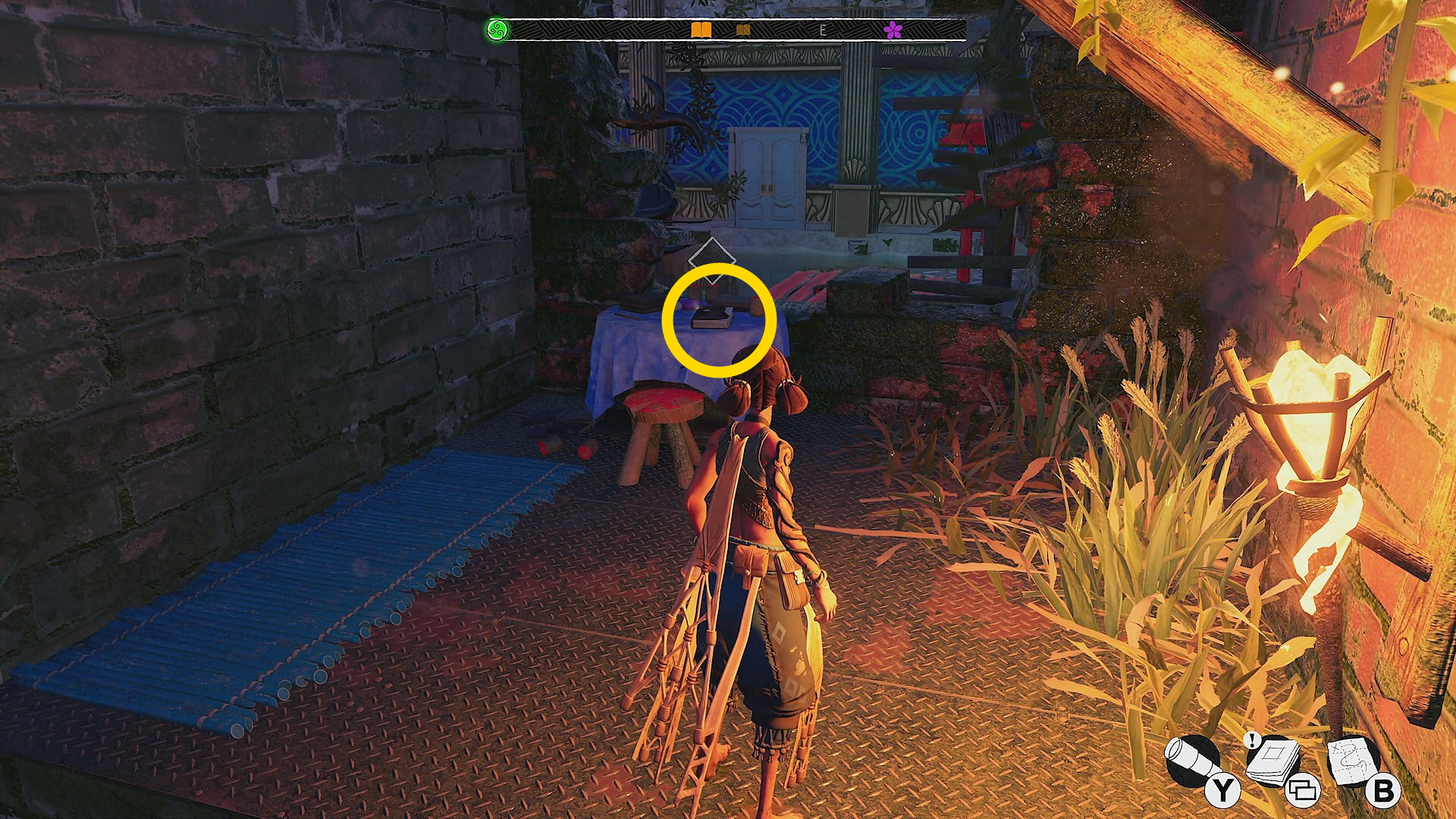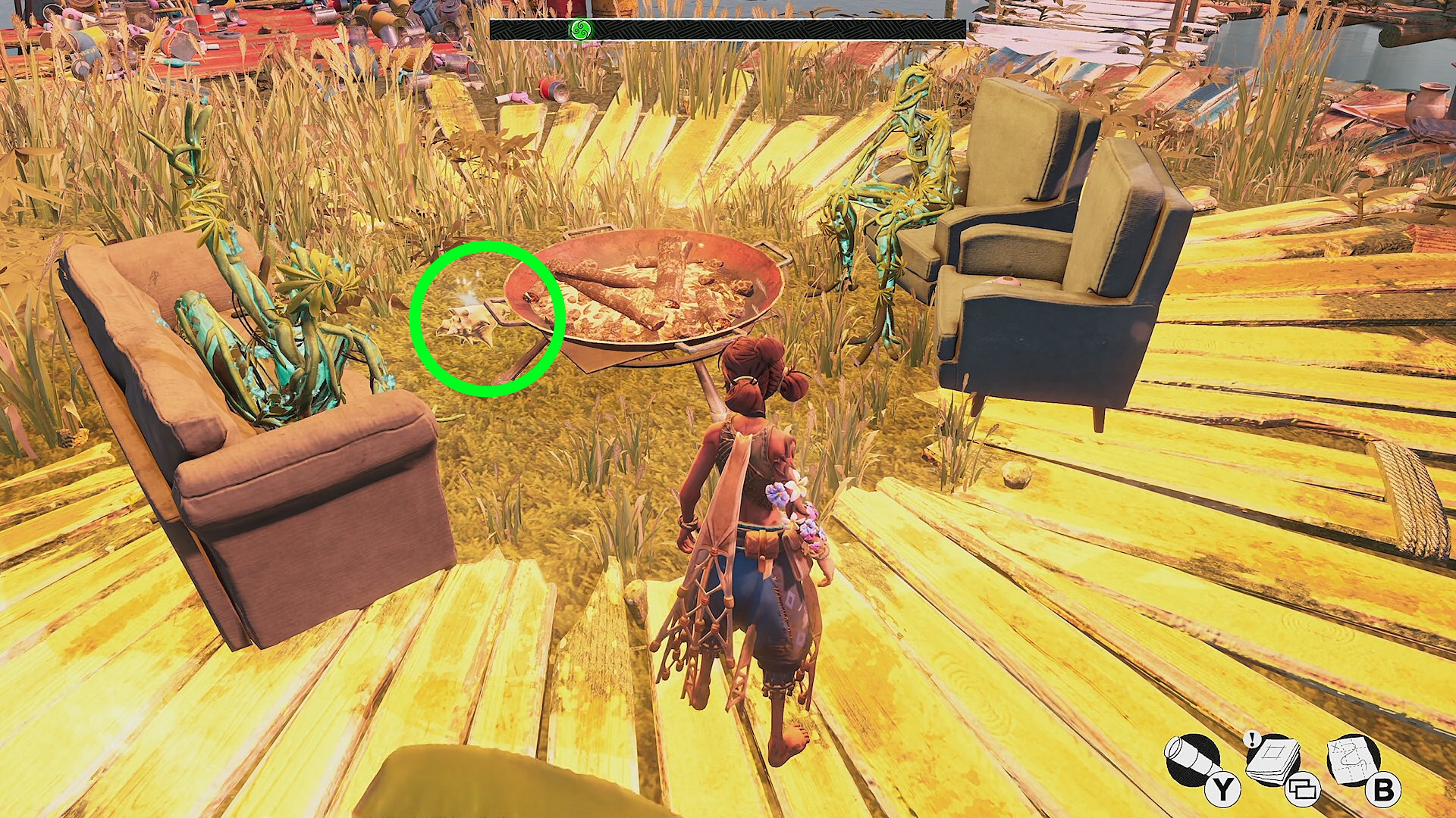 - 跳ね橋を渡ると中央に焚き火とソファがあり、そこの地面に お団子スタイルピース(7/9)