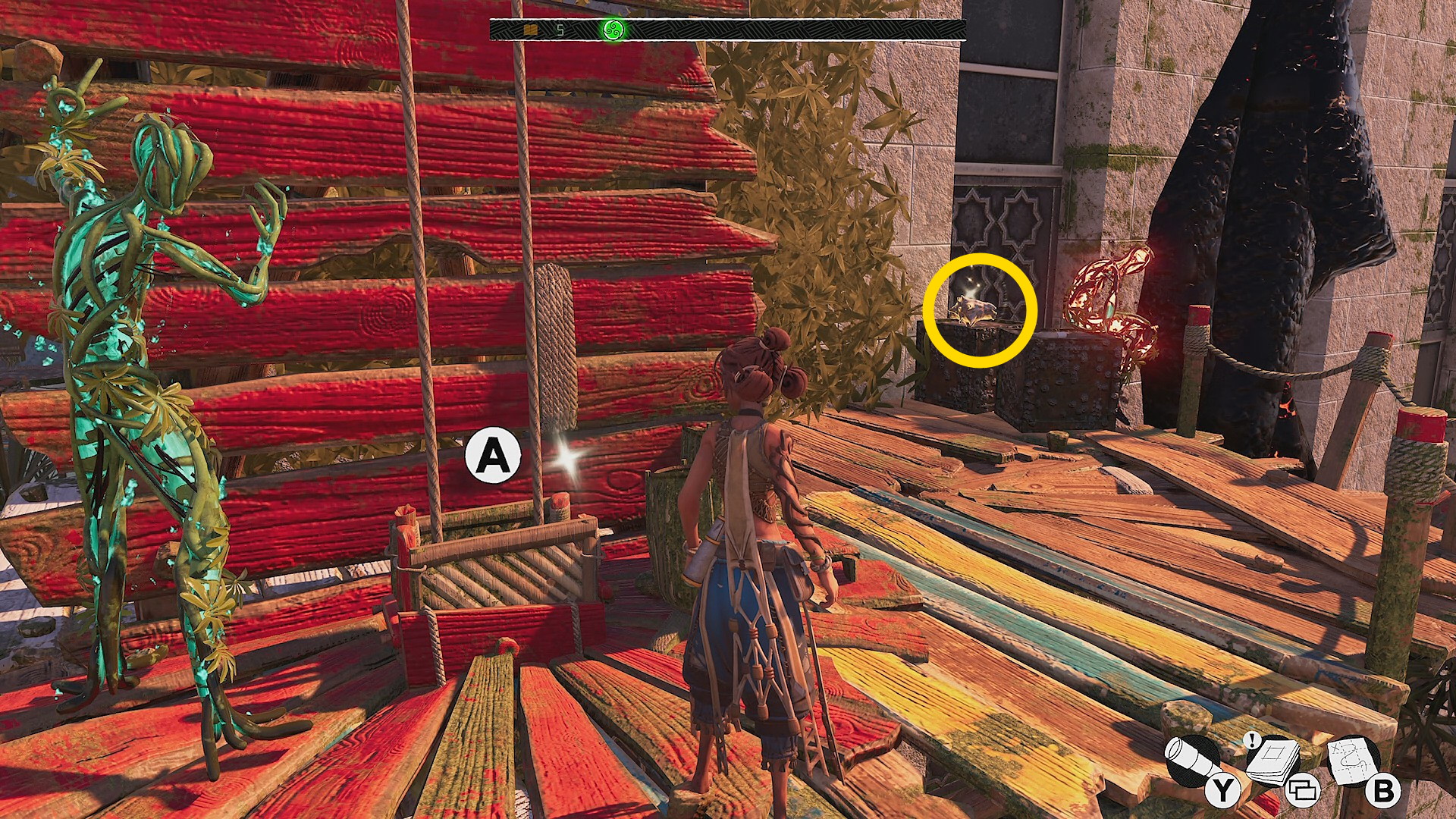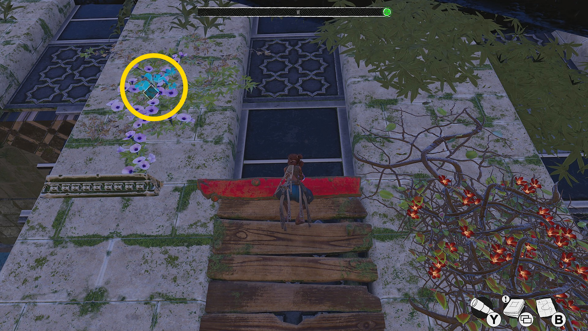 - リフトを降りて中に入ったら、すぐ左にある赤い花が咲くツタを登って跳ね橋を下ろす