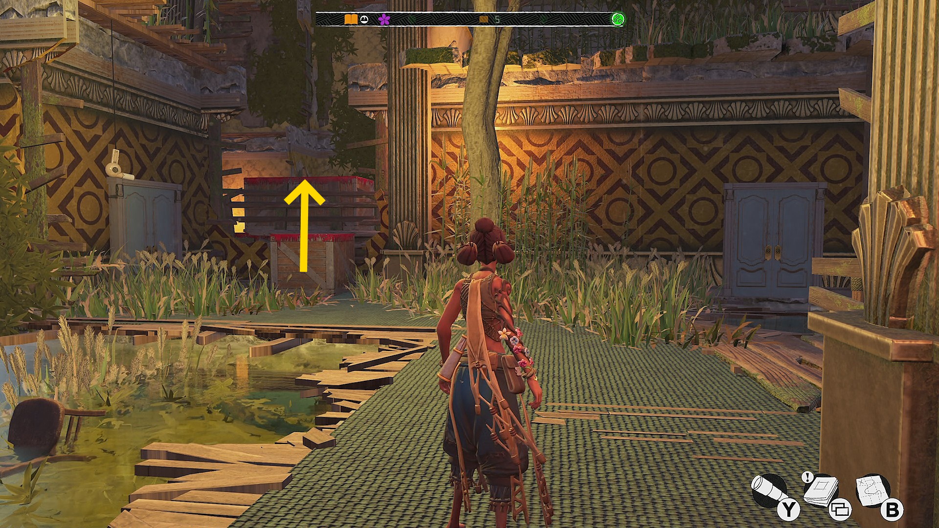 - 木箱を登り、一本橋を越え、ハシゴを登って上階へ