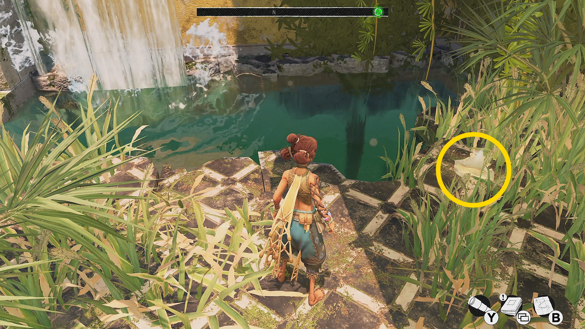 - 右側に滝があり、その手前右側の草むらに お団子スタイルピース(6/9)