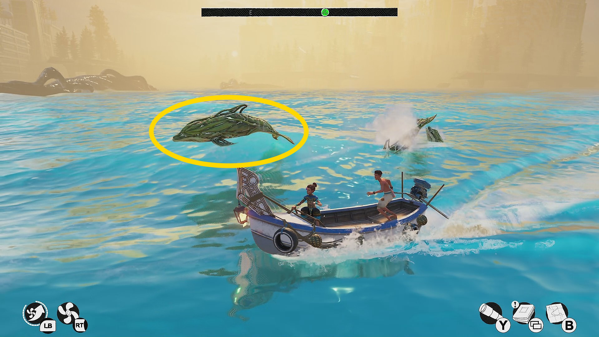 - 南東エリアからは少し離れた北西のところ(ランドマーク:タイタンズ・リーチの南側)で イルカ(生物:17/20) と遭遇