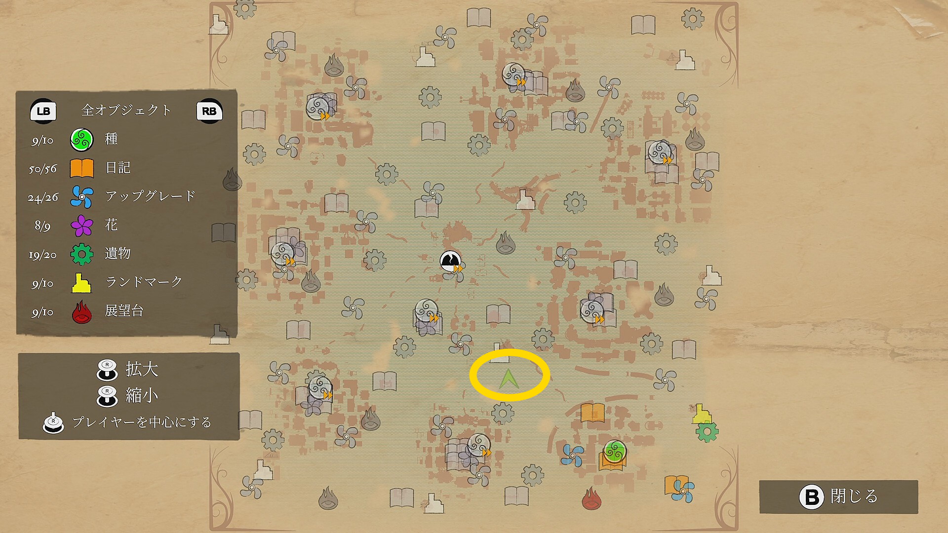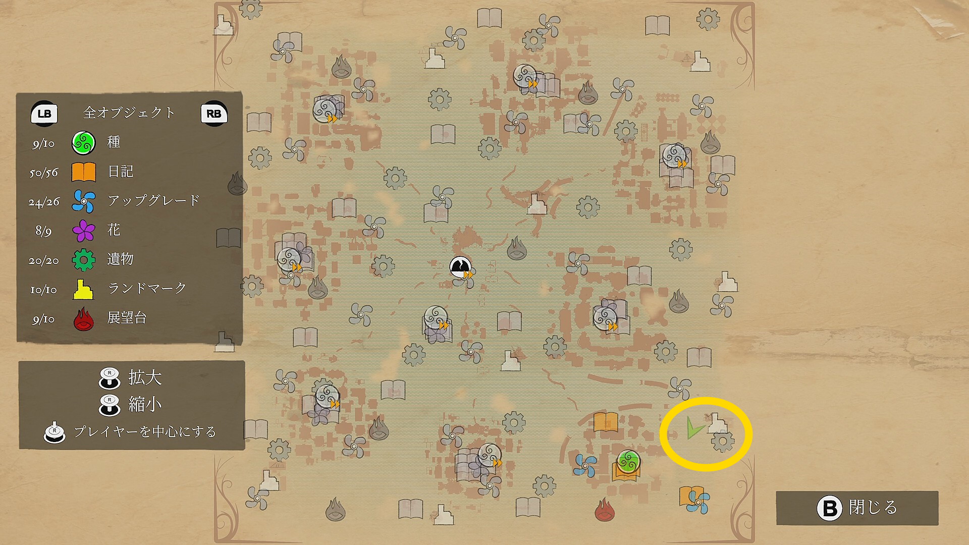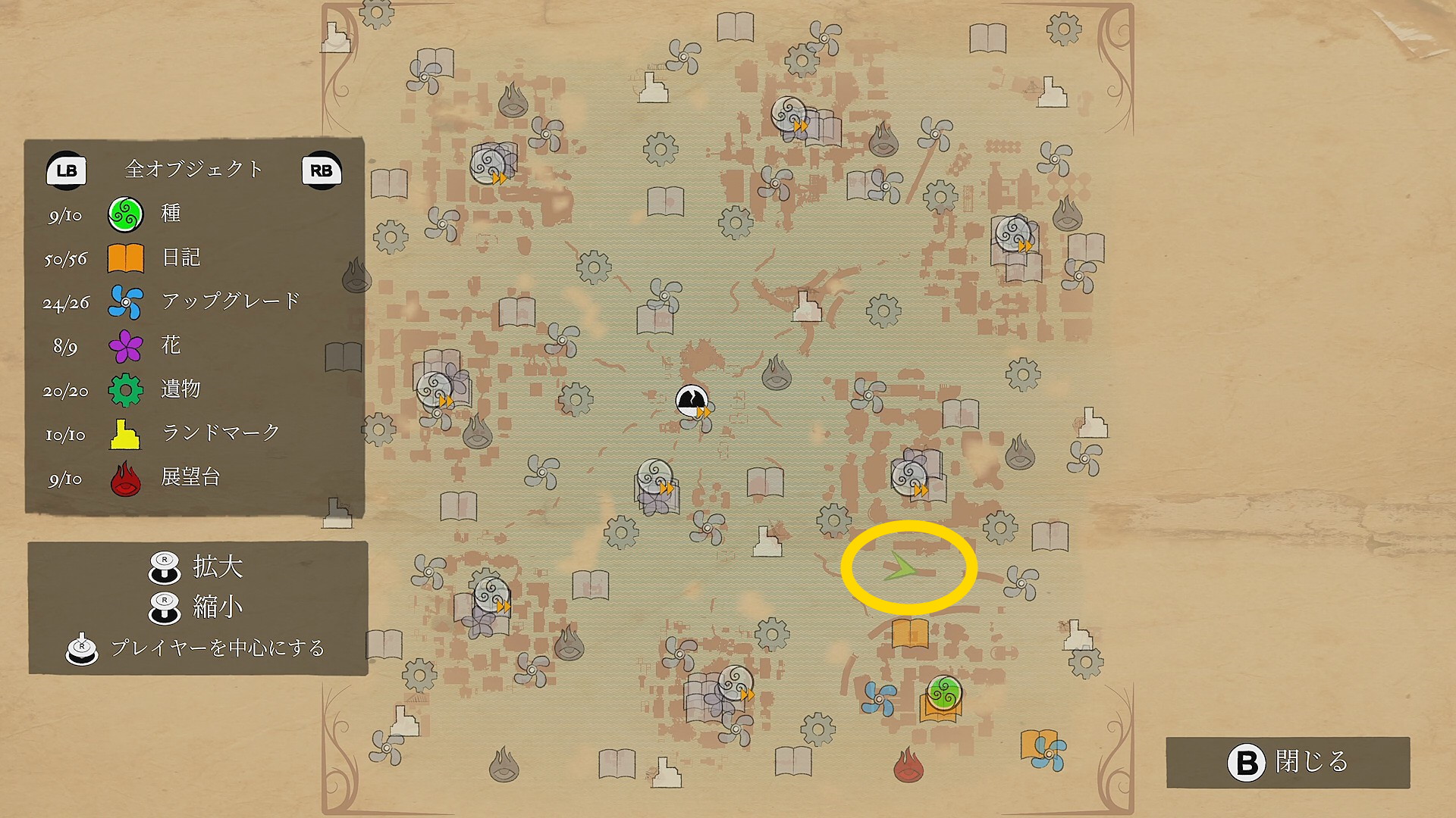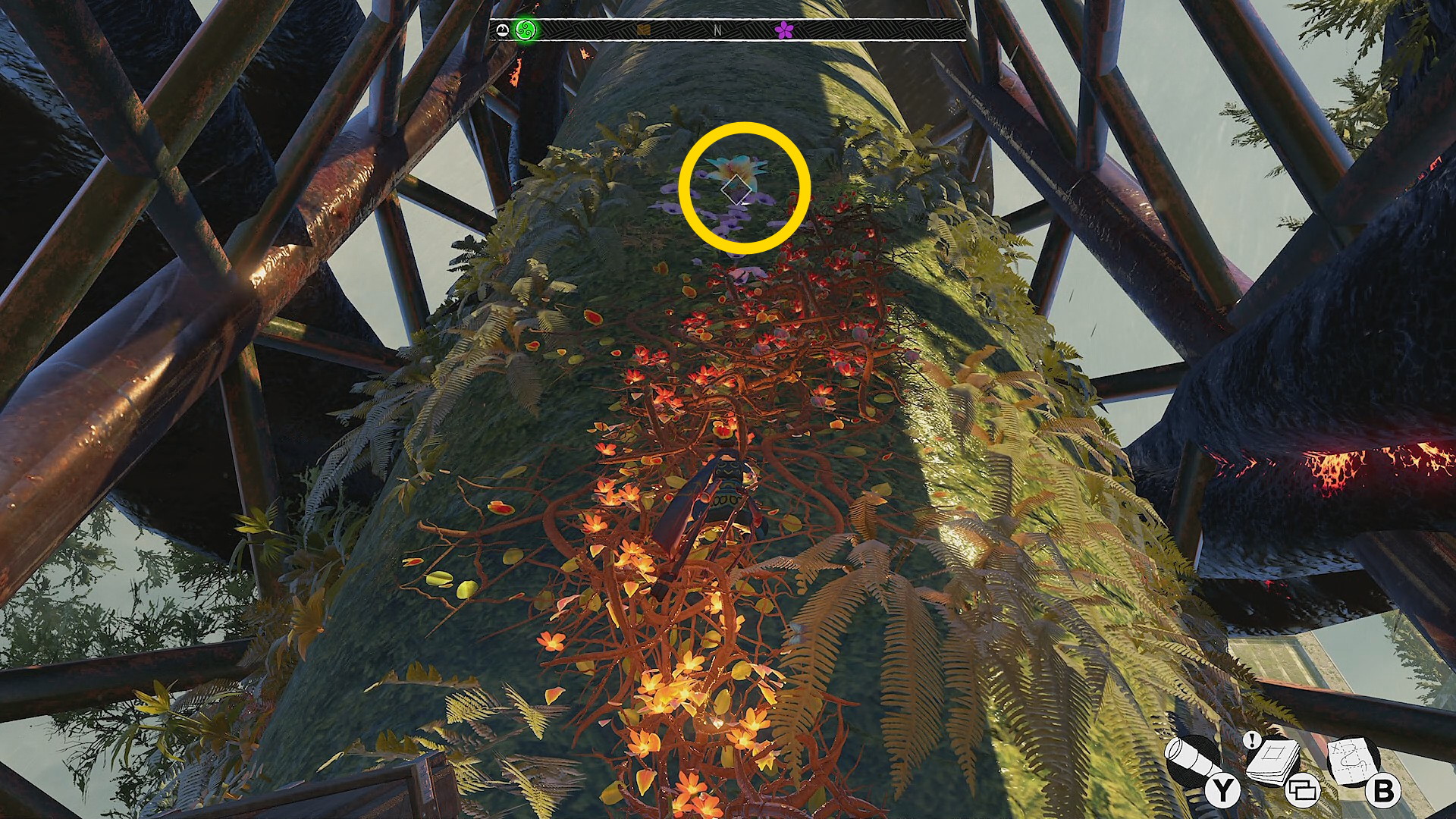 - 反時計回りに移動していくと左側に赤い花が咲くツタがあり、それを登っていくと 花(9/9) ⇒ 取りこぼしがなければ 実績「植物学者」 解除