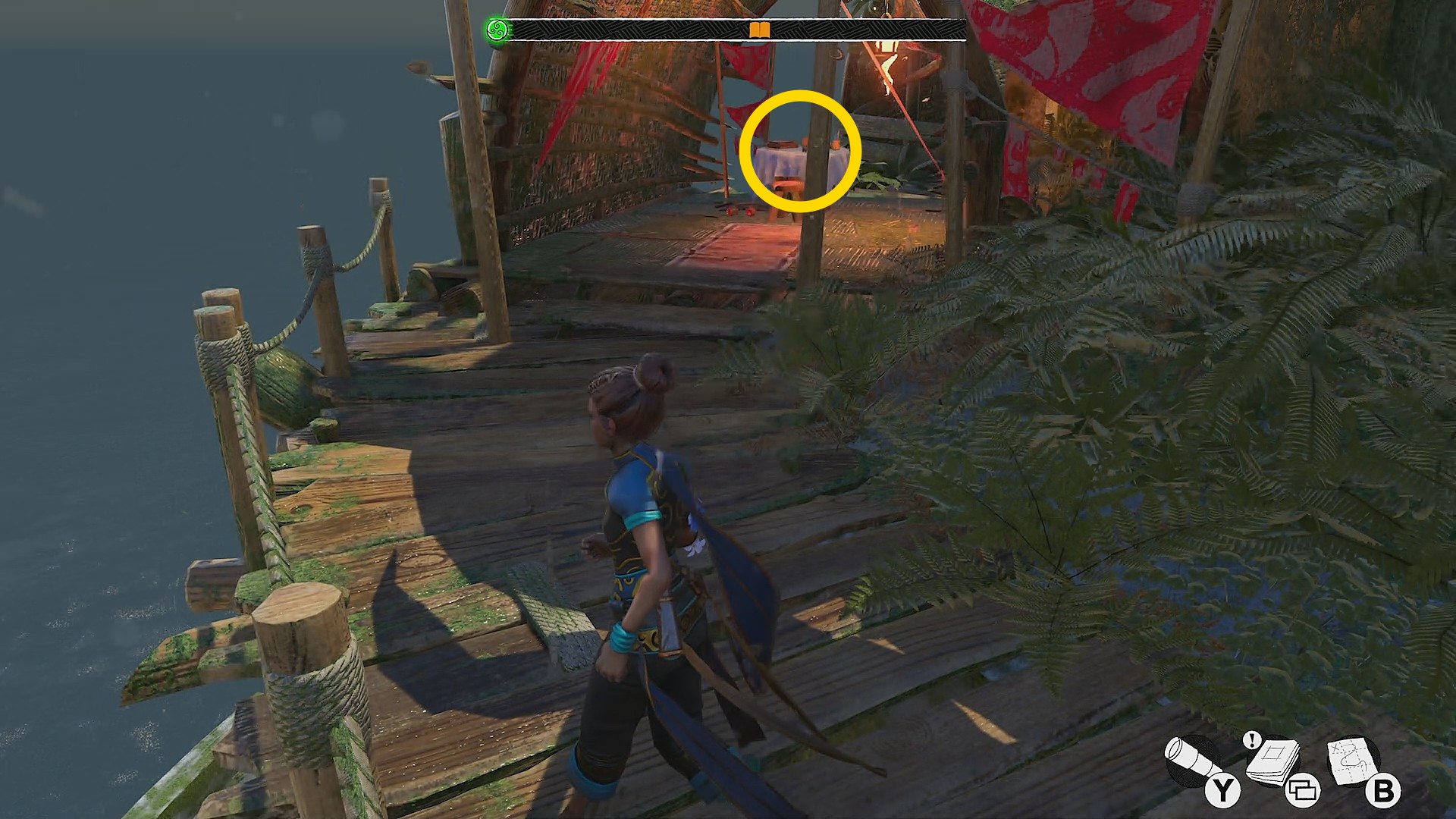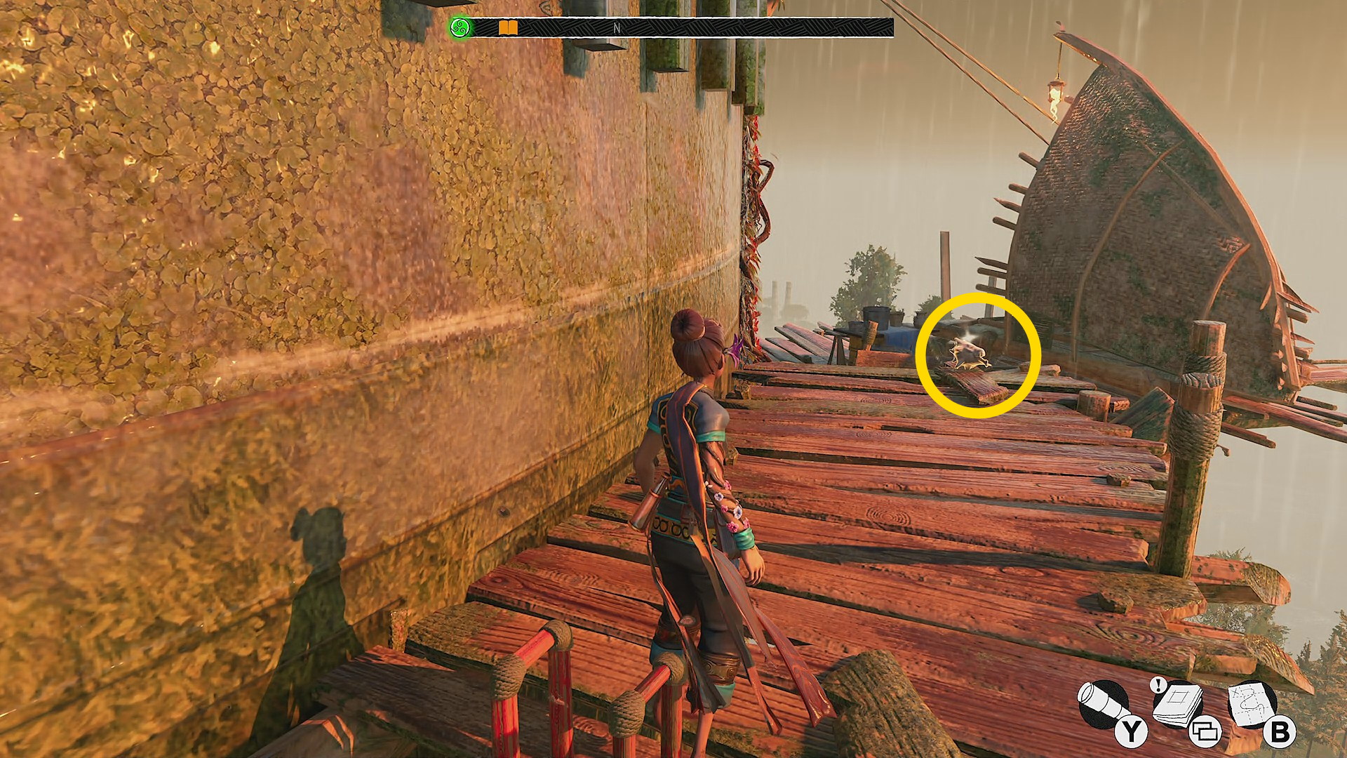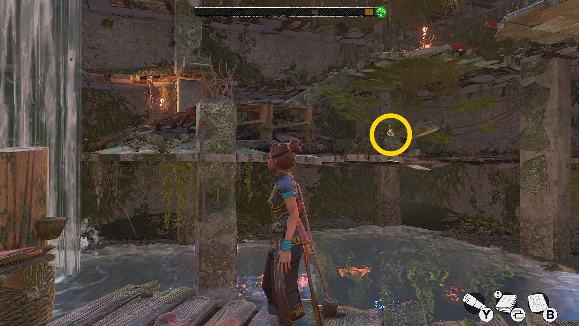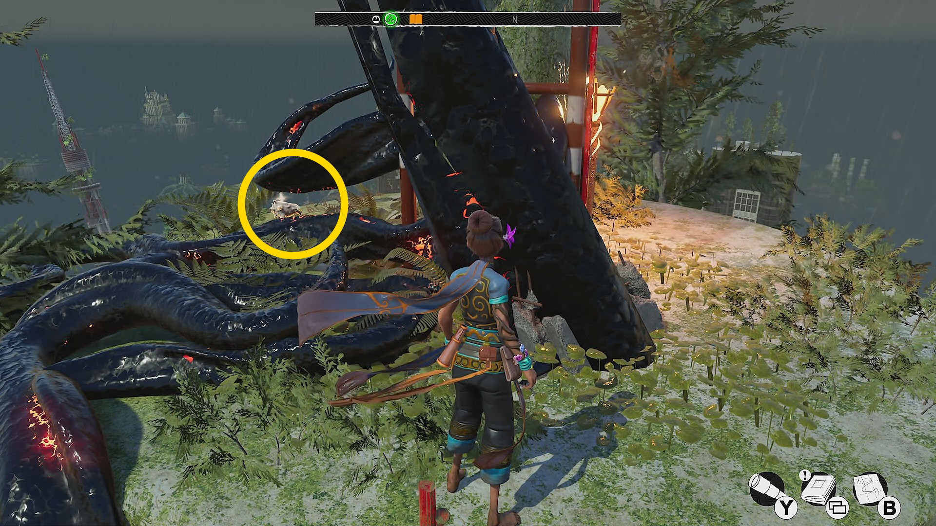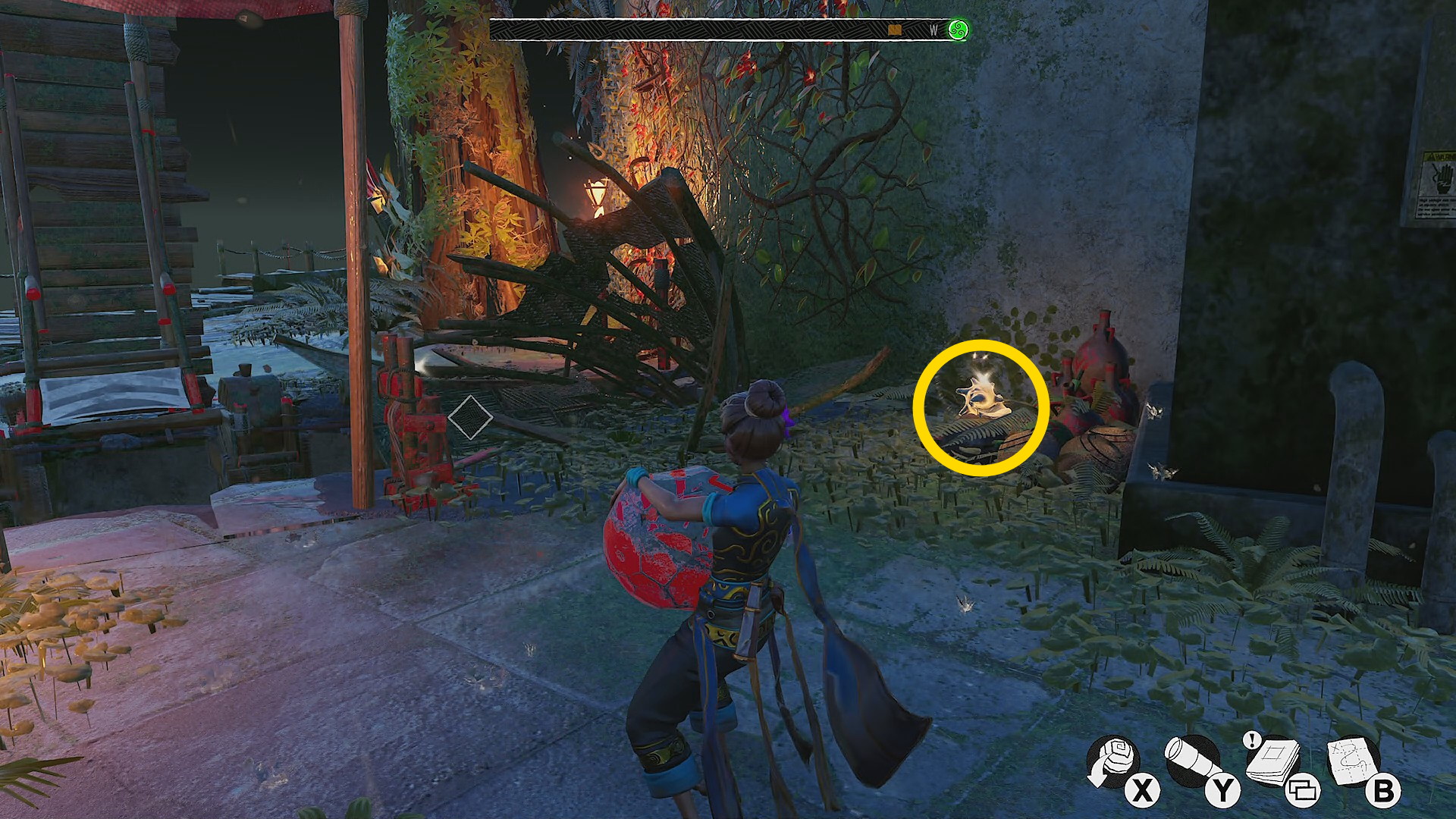 - 反時計回りに移動していくと左側に赤い花が咲くツタがあり、それを登っていくと 花(9/9) ⇒ 取りこぼしがなければ 実績「植物学者」 解除