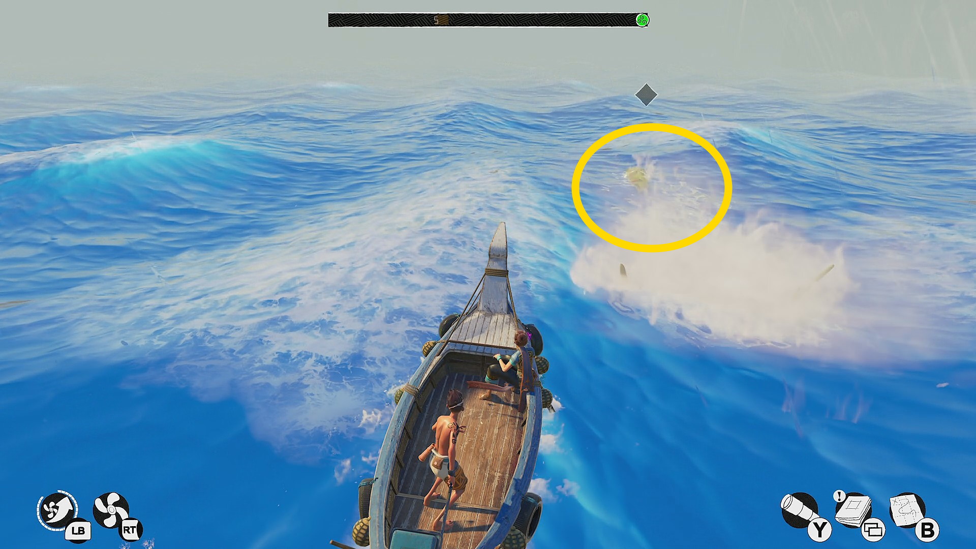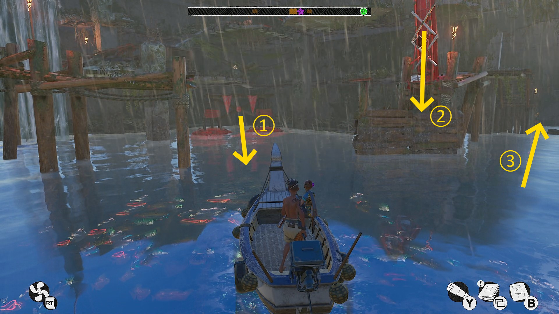 - レアな生物、且つ、かなりゆっくり泳ぐので待機時間が長いかもしれないが、下画像の場所でずっと待機することを推奨(当サイトの場合、下画像の場所でセーブ ⇒ ロードしたところ、9分で出現を確認)