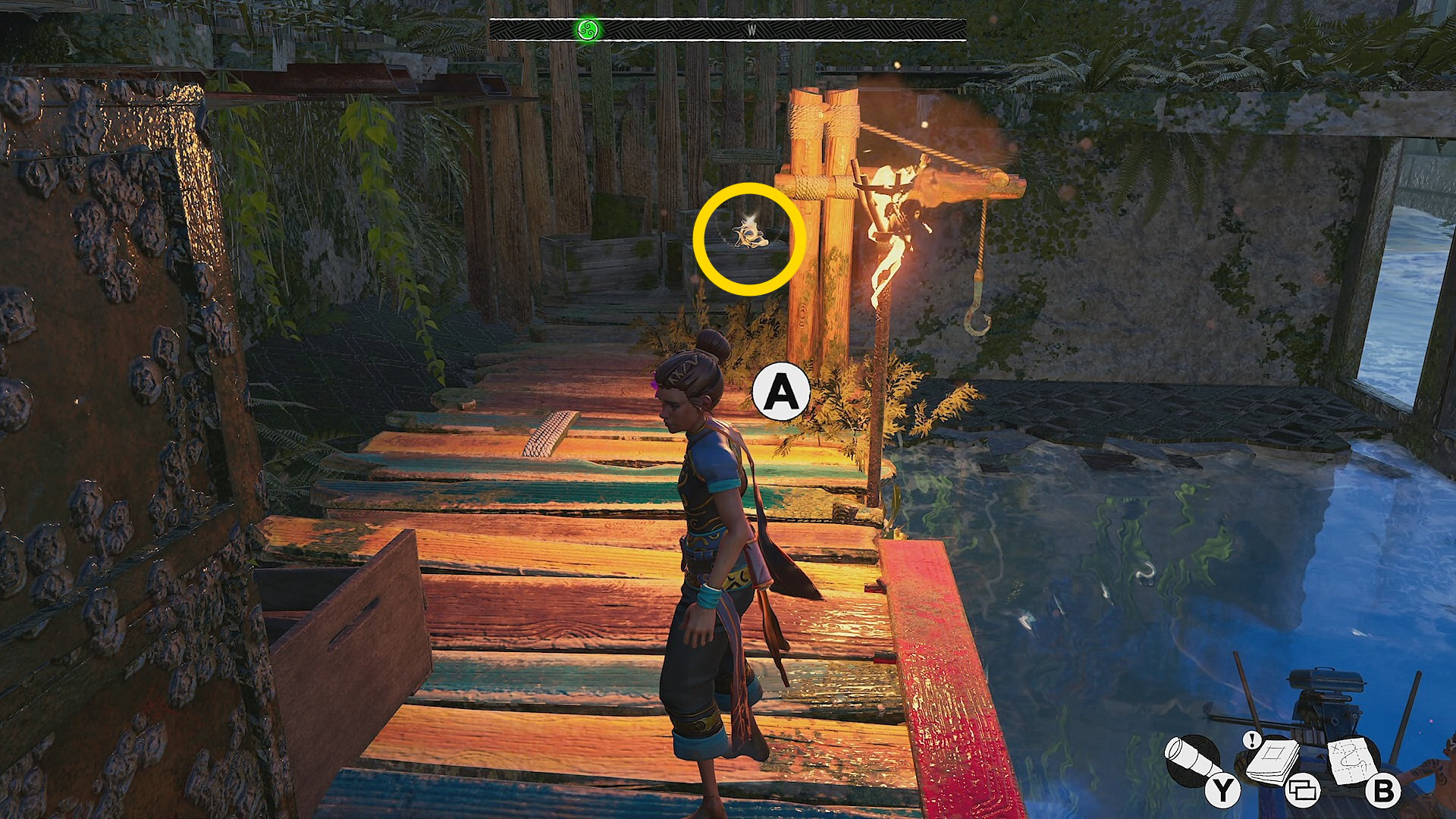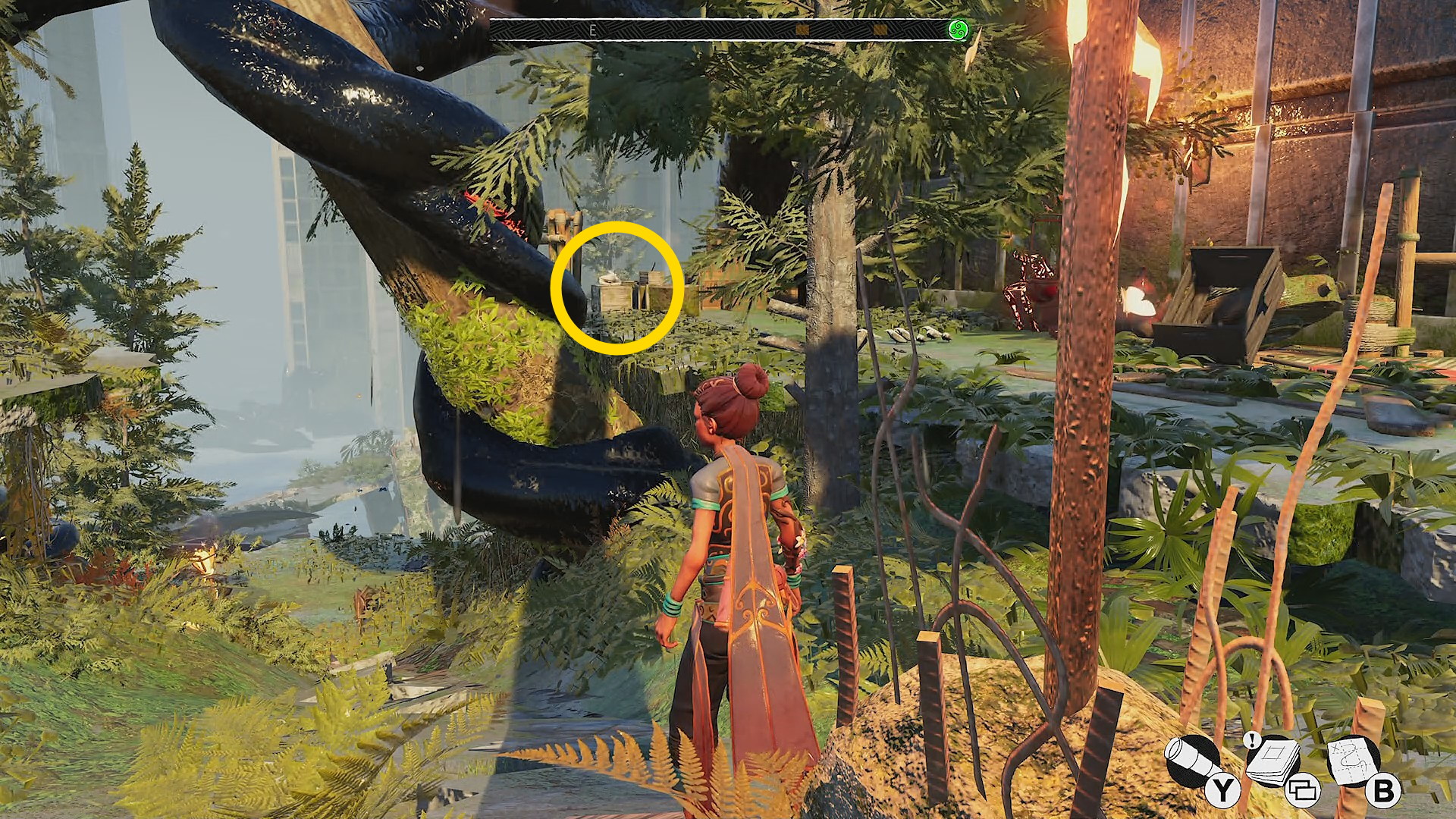 - 黒い植物のゲートの右側に木箱があり、それに登って向こう側へ下りる