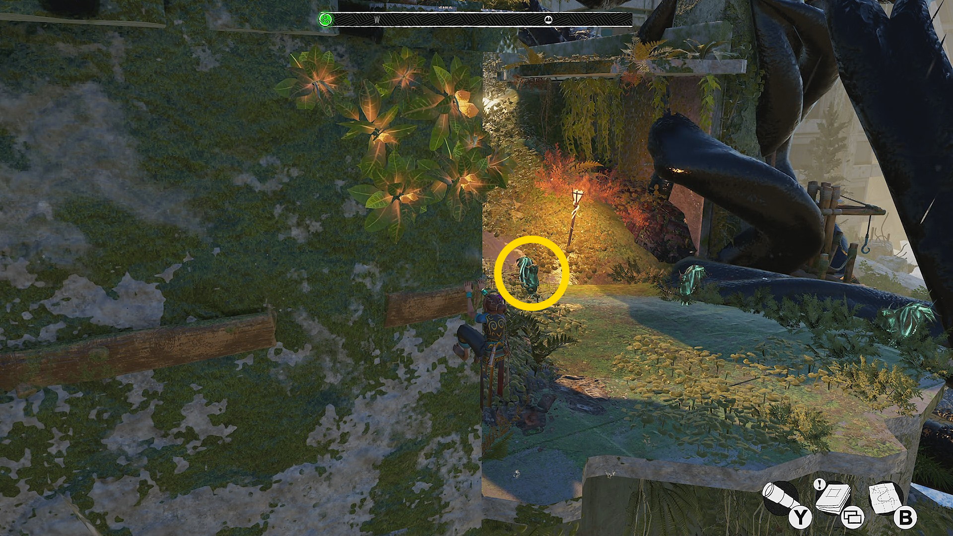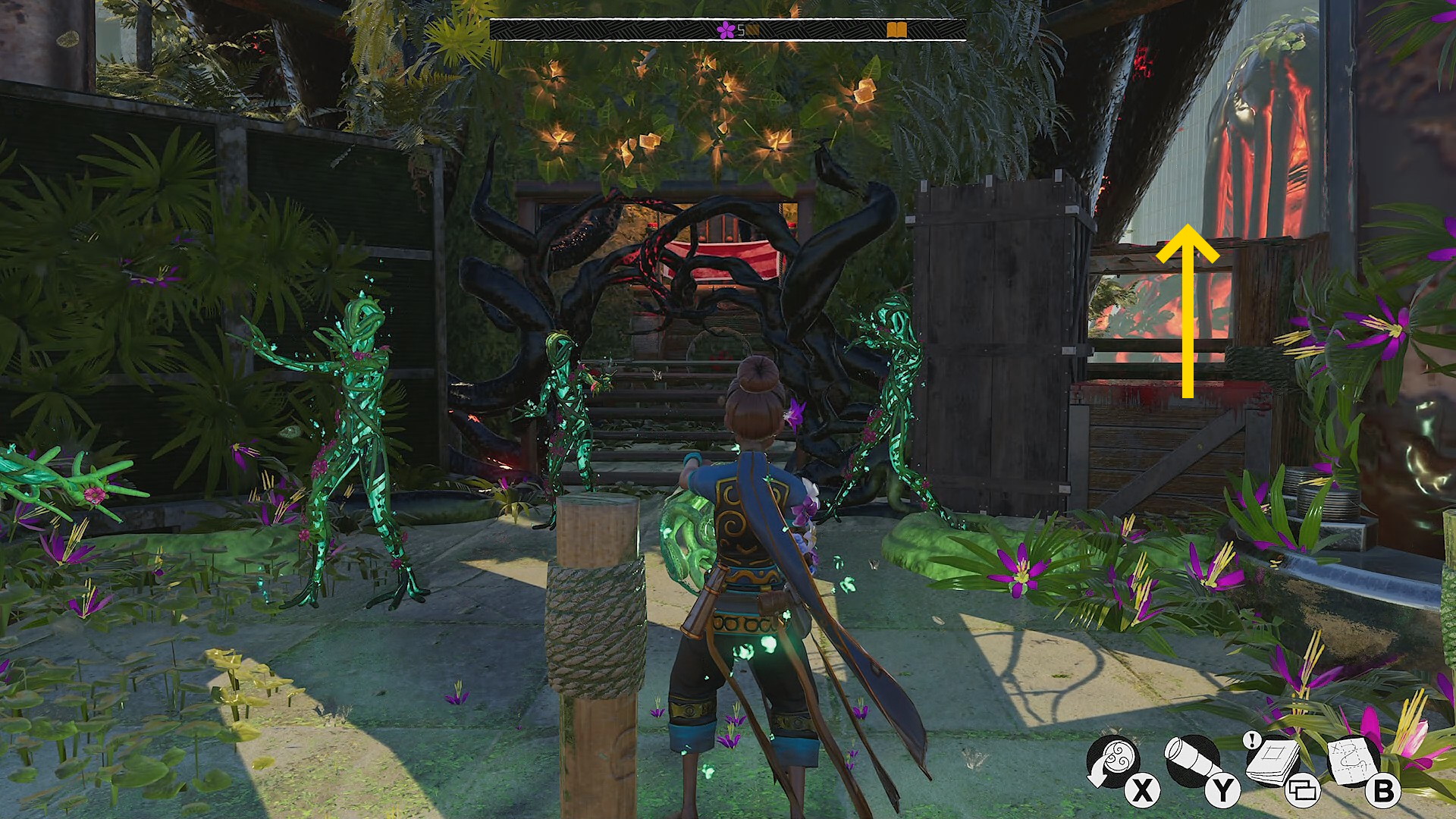 - 黒い植物のゲートを通過したら、すぐ右側の赤い花が咲くツタを確認(今は確認するだけでオーケー)