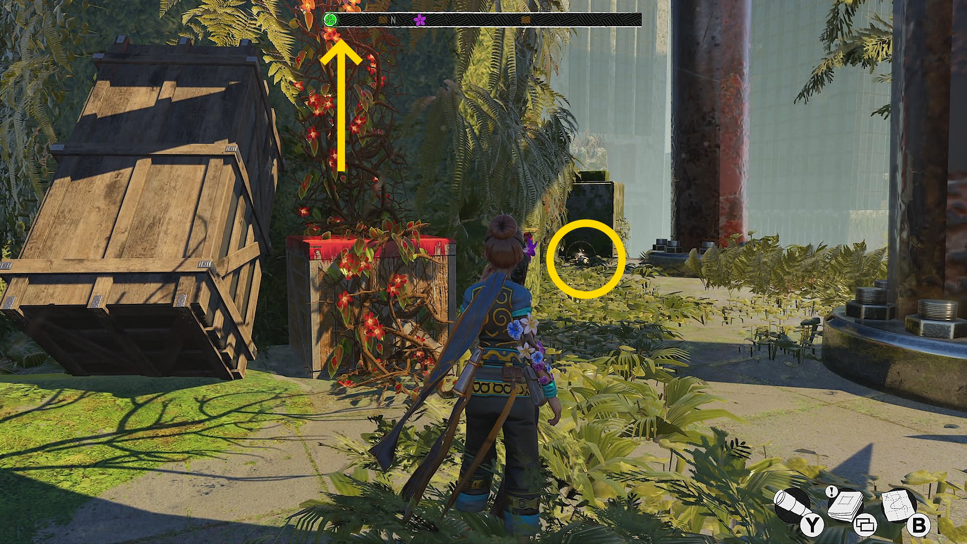- 右前方にレムナントがおり、その近くのカゴに花の種を置いて上階へ移動させる