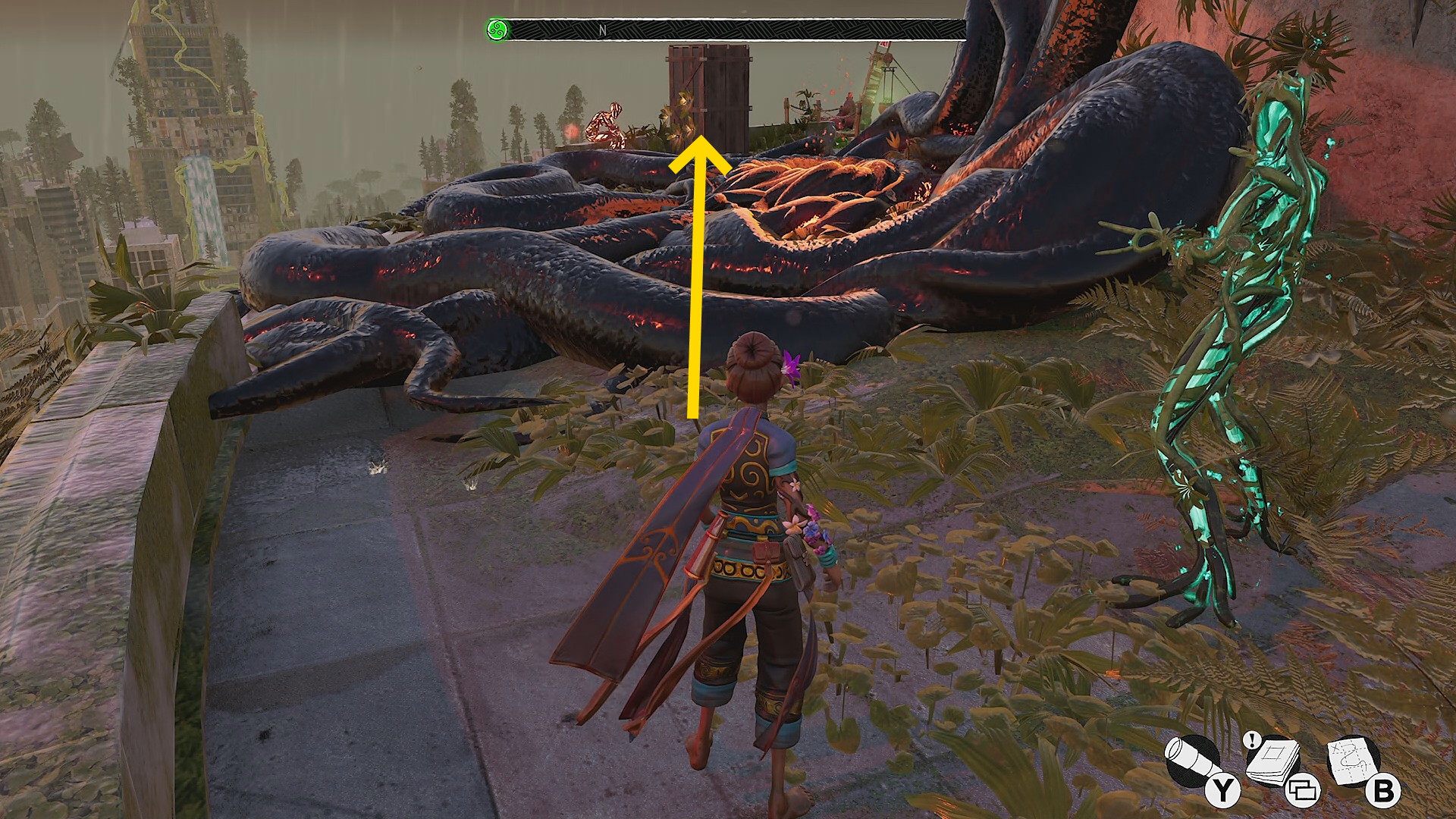 - スロープを登って黒い植物のゲートの前へ移動する