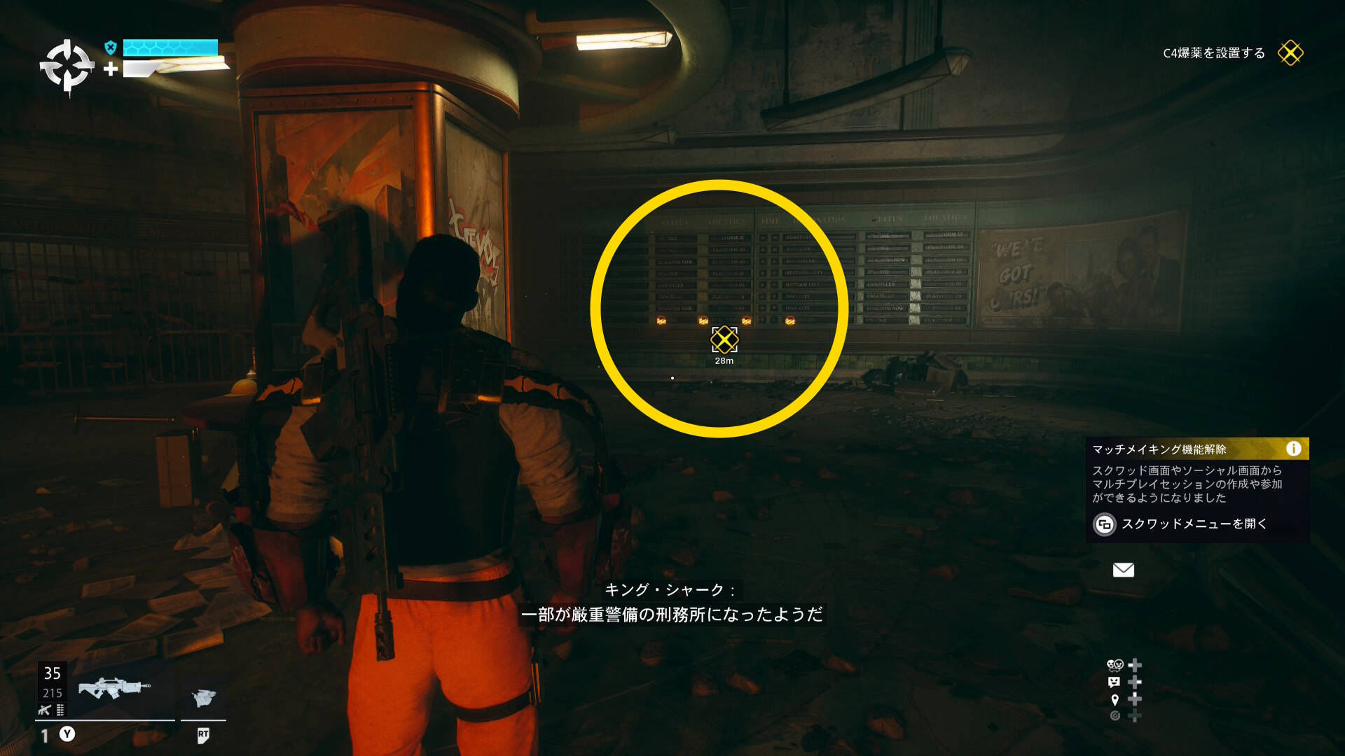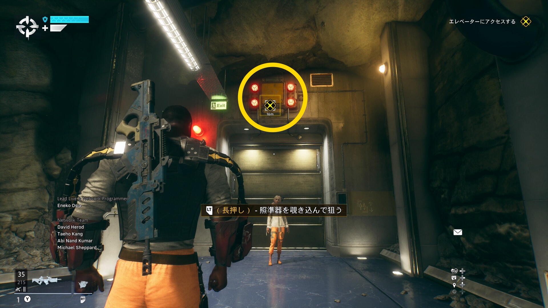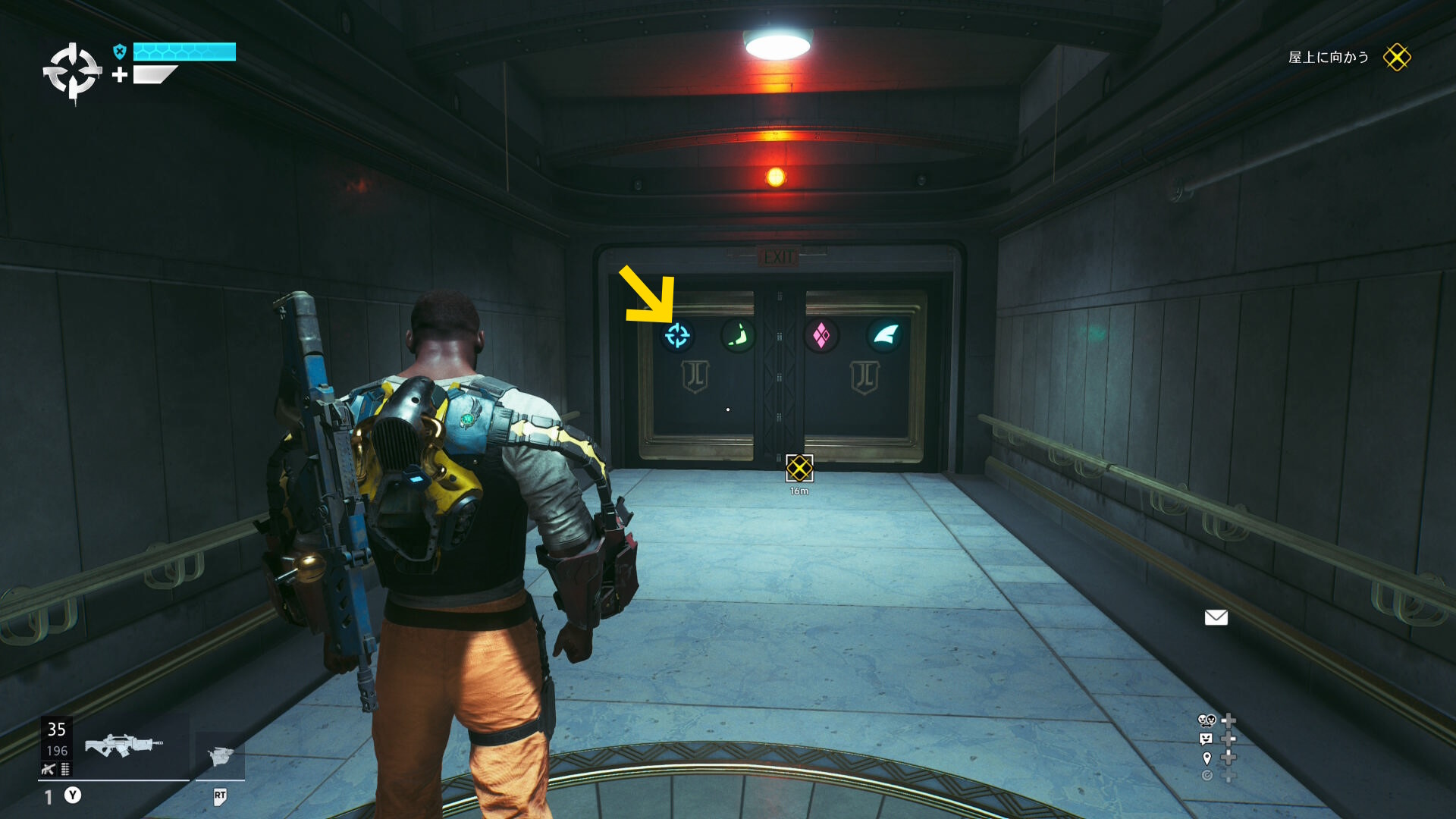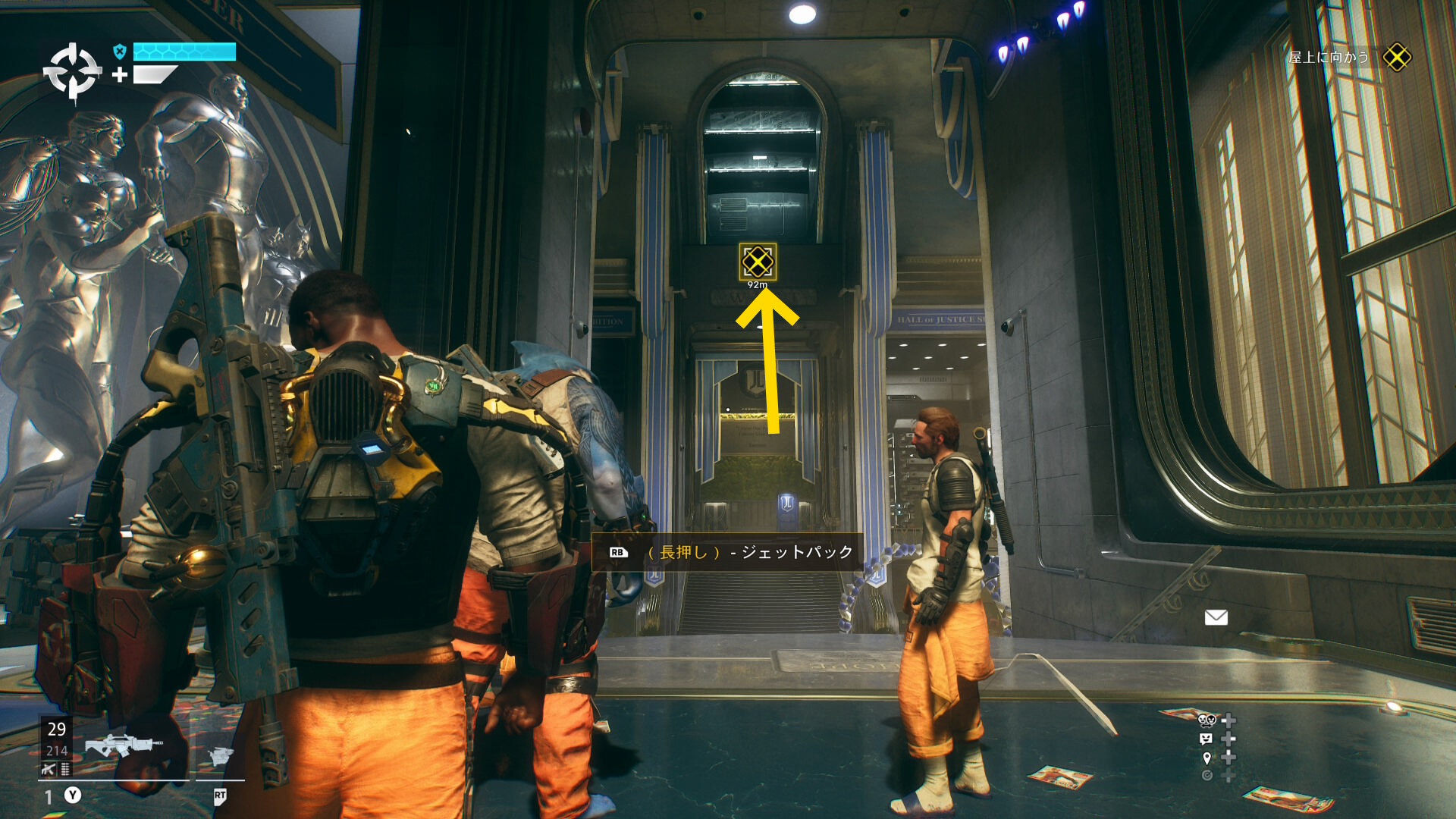 - カットシーン後、正面奥の2階へジェットパックで移動