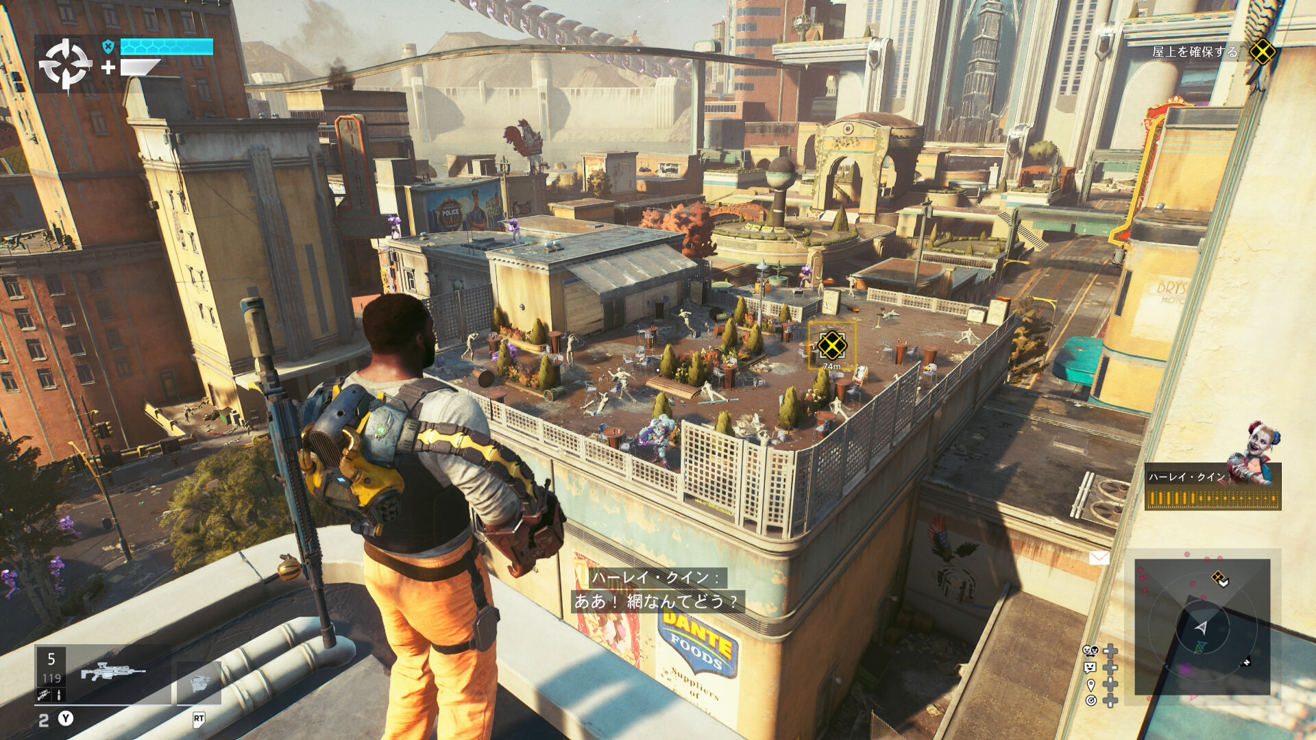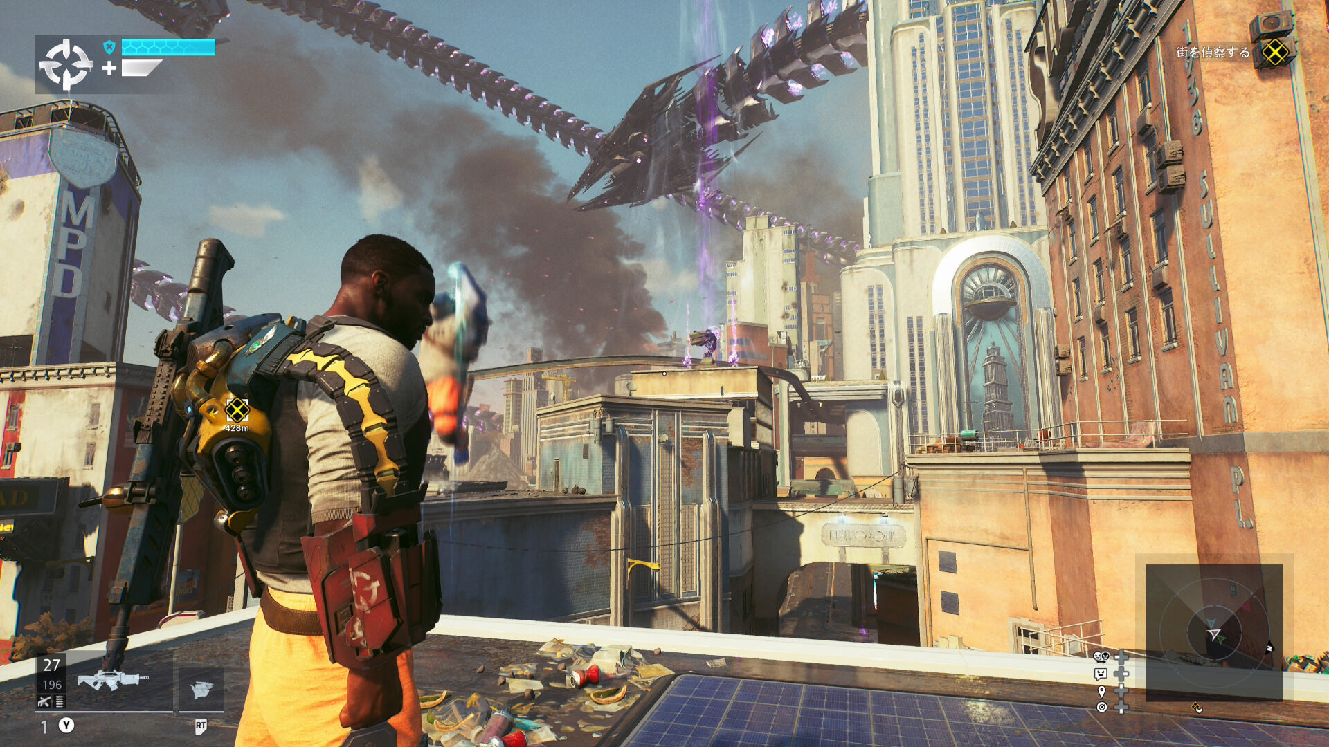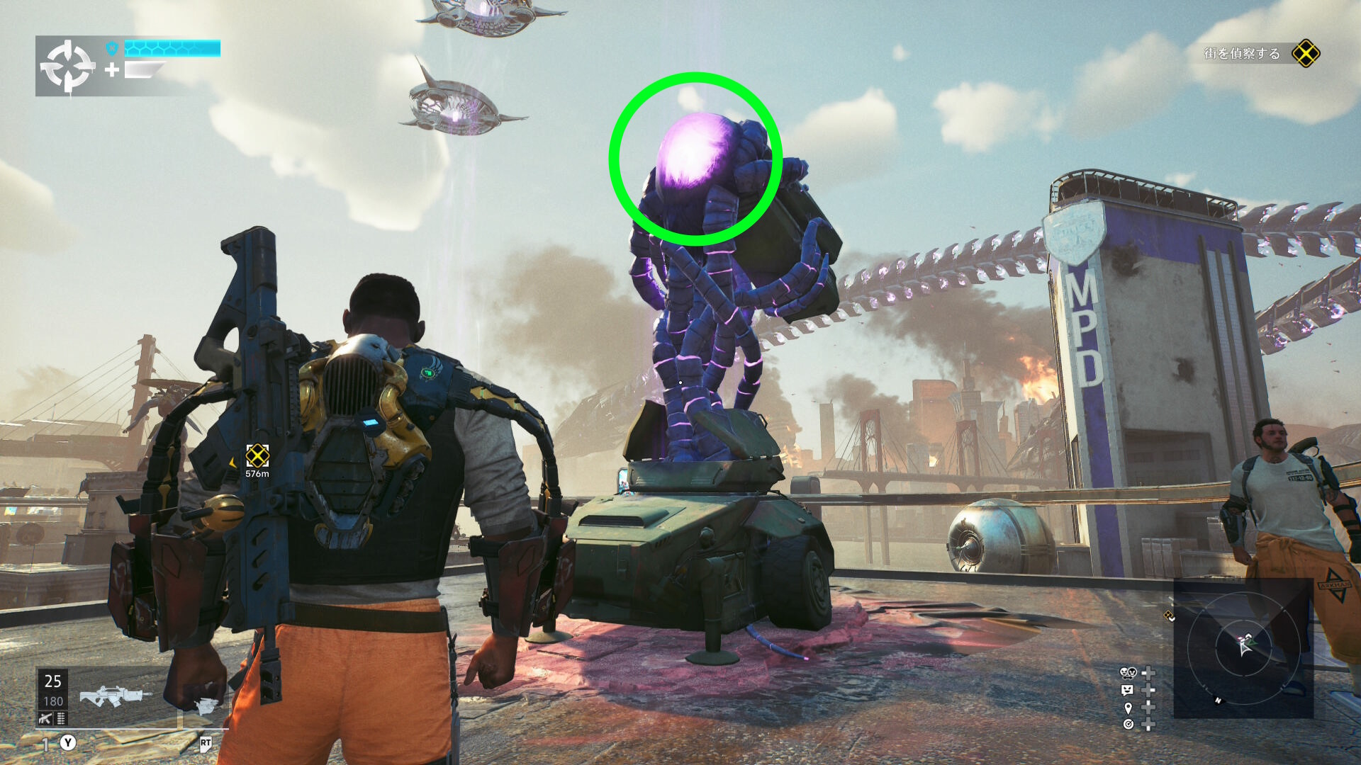 - 最初に出現した敵を倒し切ると、周囲の屋上や屋根から攻撃してくるのでスナイパーライフルで攻撃する or そこまで行って暴れる のどちらか