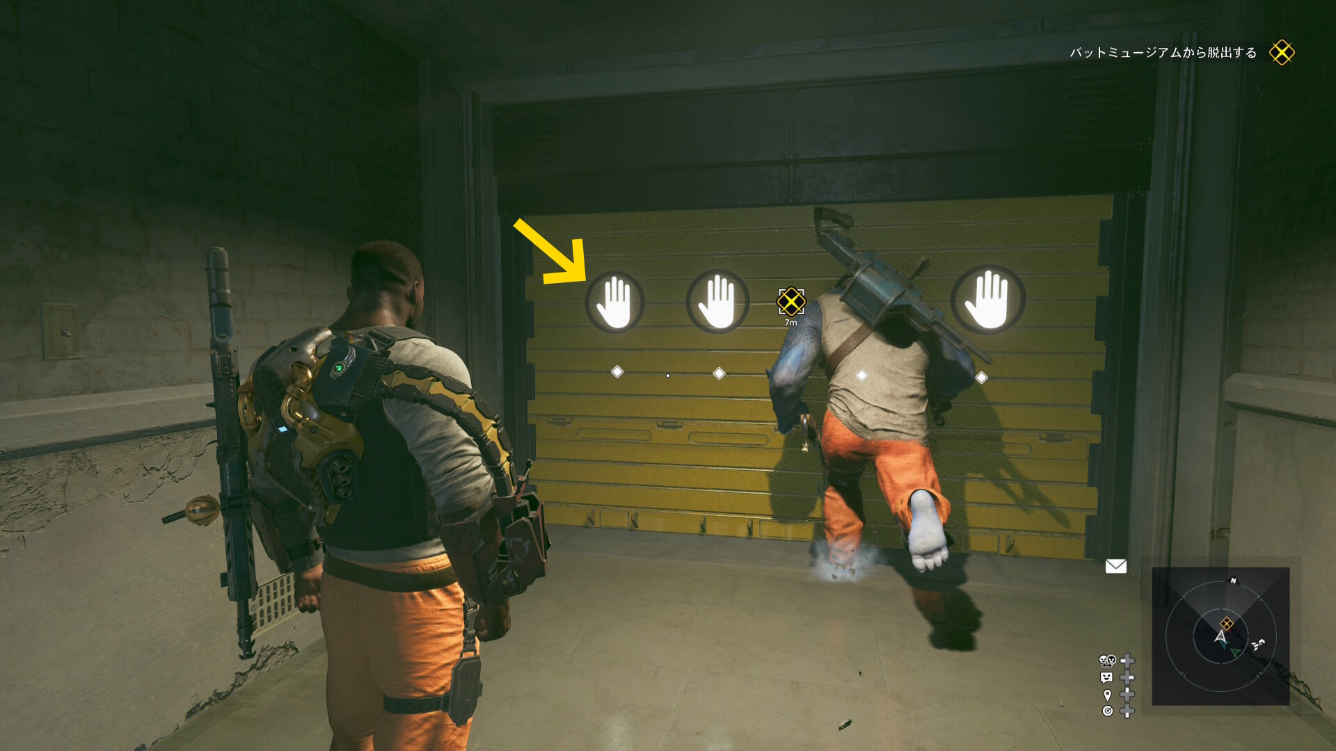 - キング・シャークで残り1箇所の非常出口を調べ、これを開けたあとにバットマンに襲われてダウン ⇒ 少し後ろにいるハーレイ・クインに交代