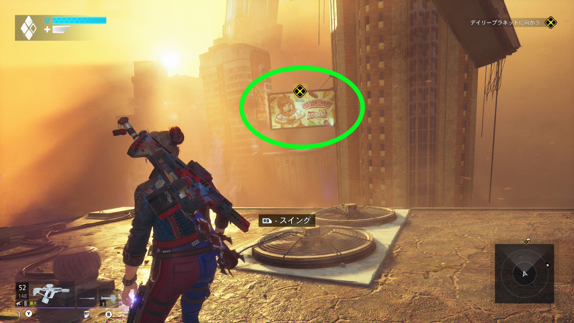- ジャンプ後、看板に LB でグラップルし、そこに到着する直前に A を押すことでグラップル・オーバーシュートが発動できる