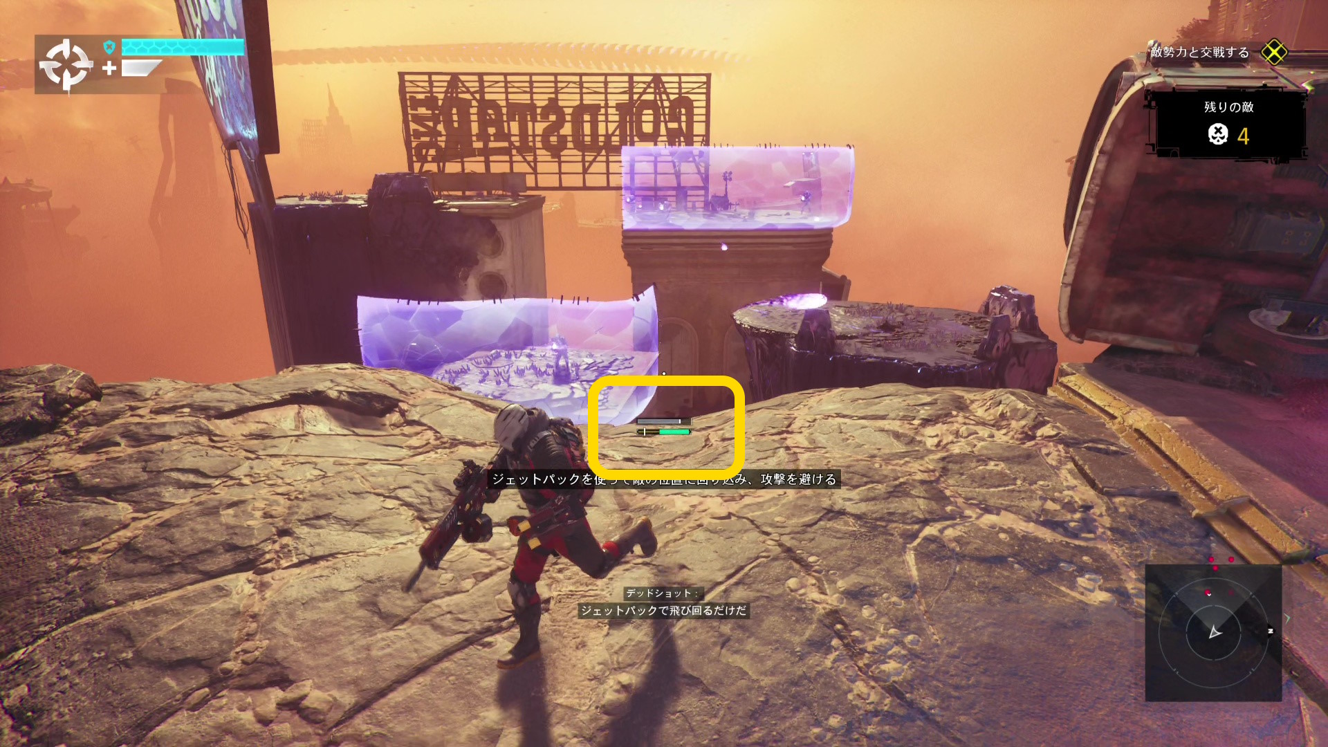 - 敵がいるところはシールドが張られているので、ジェットパックで回り込んで攻撃しよう