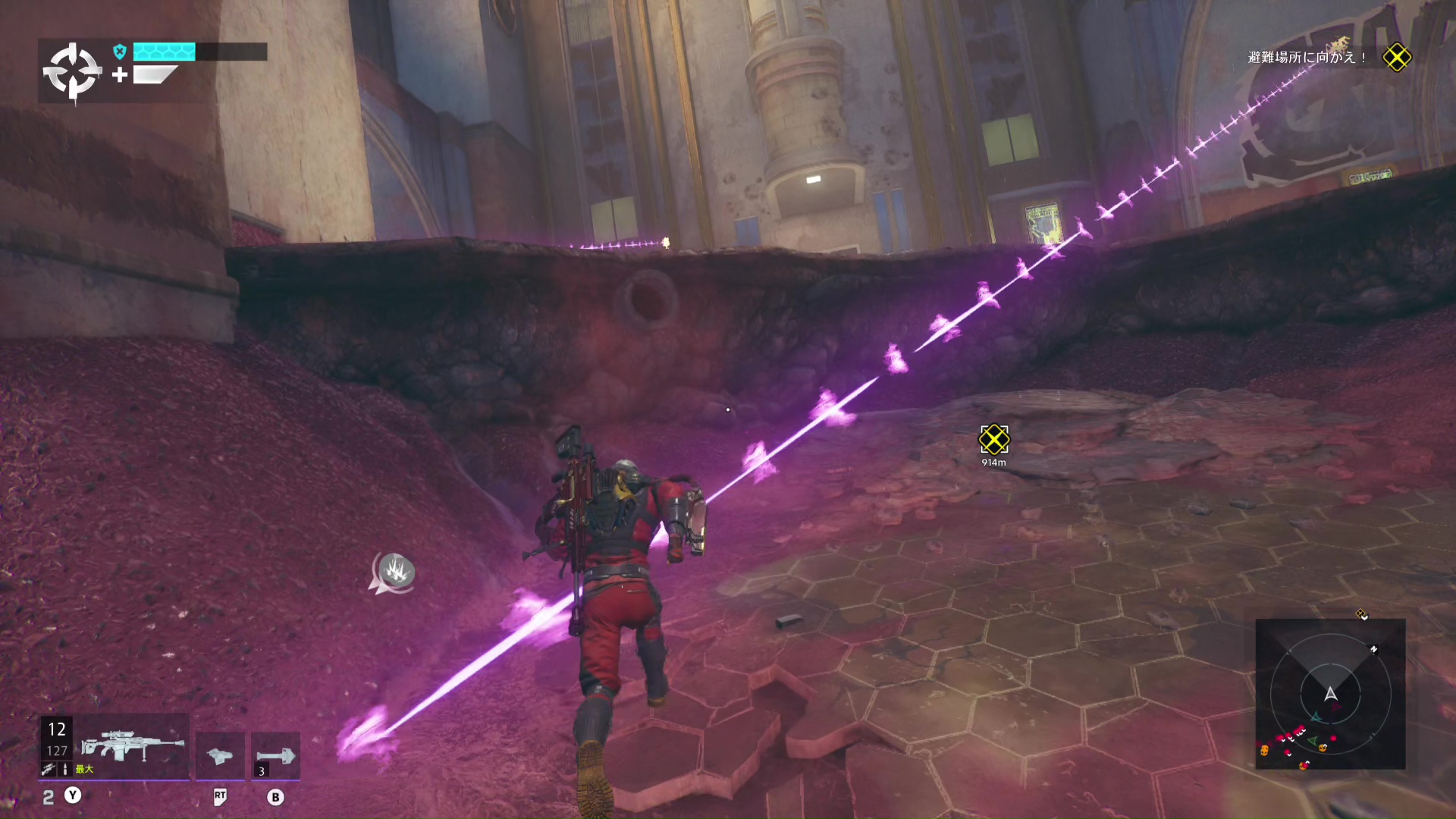 - 敵の後ろにあるビルに登り、そこから攻撃すると安全に倒せる